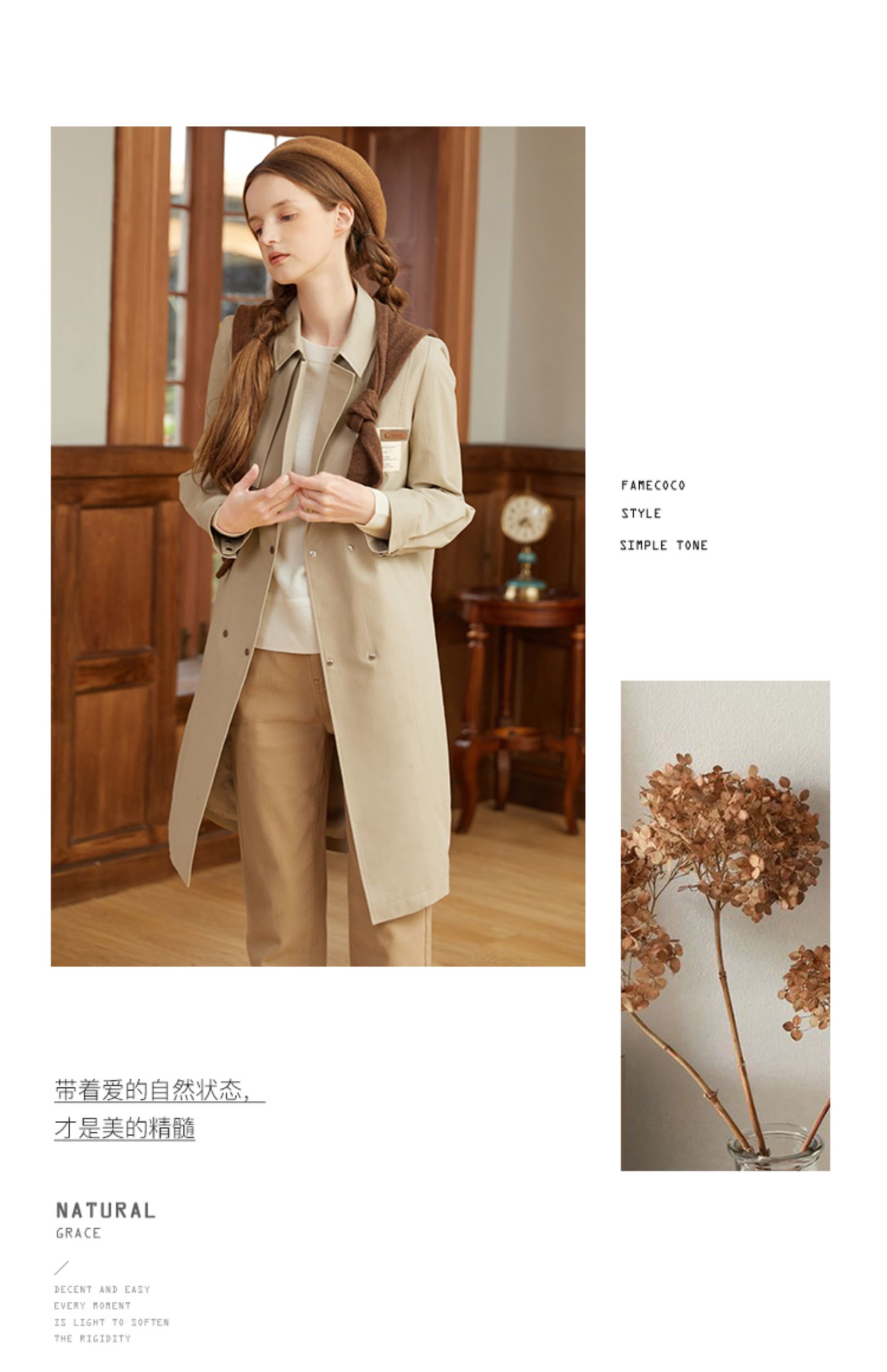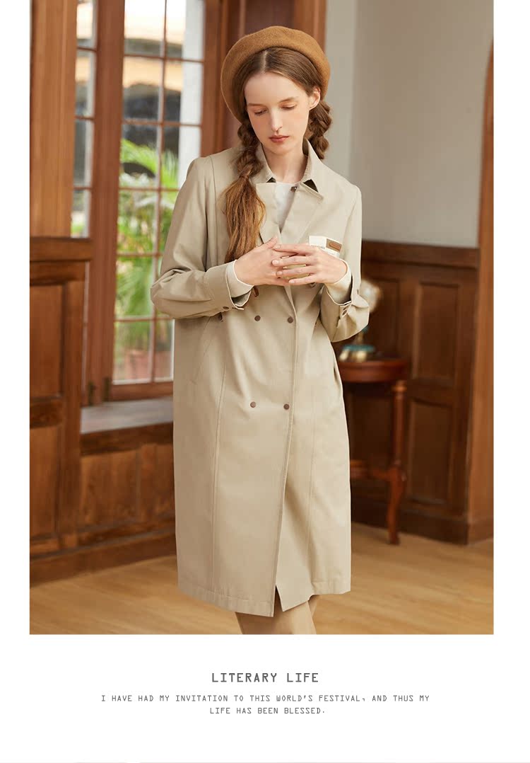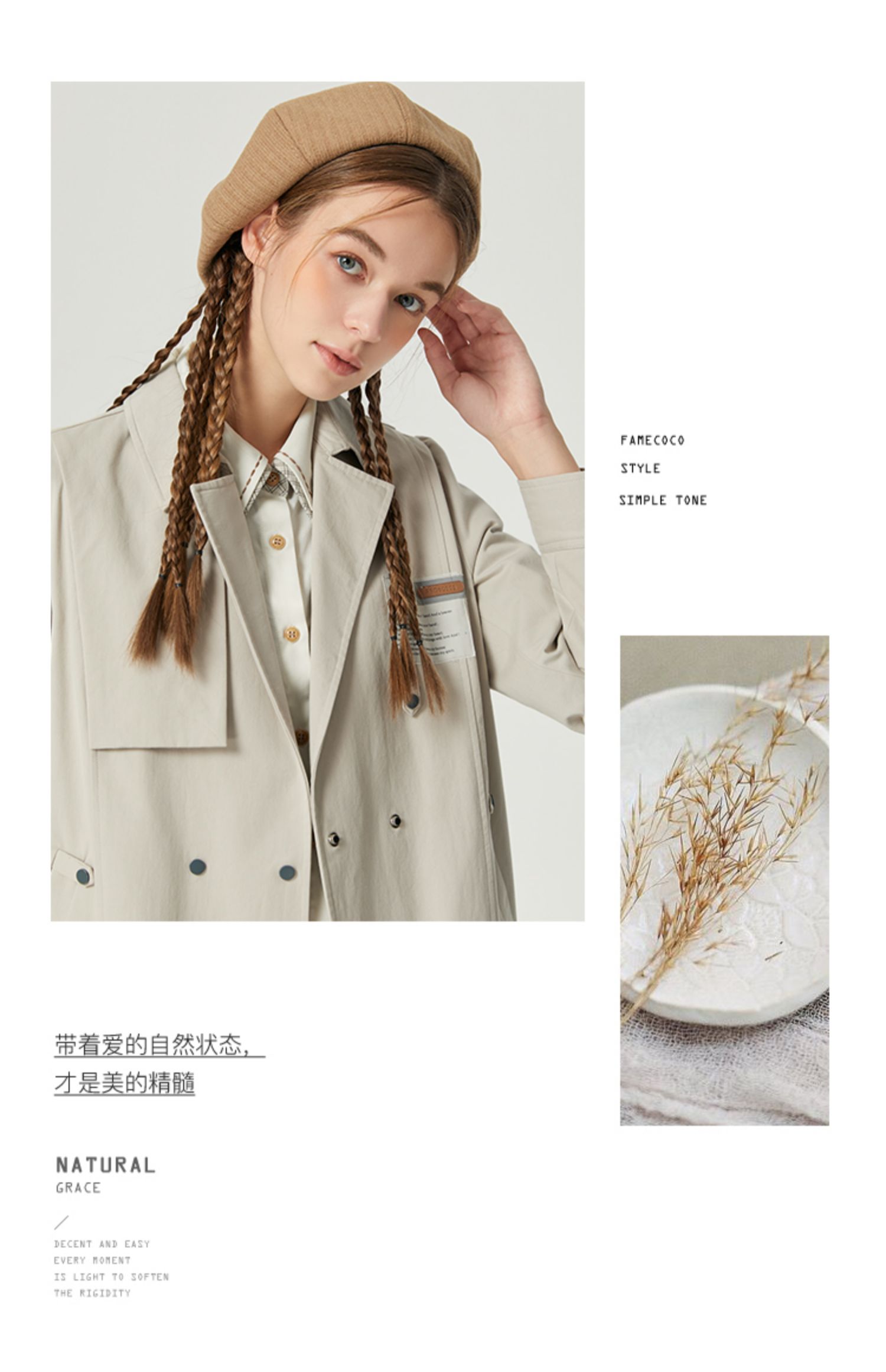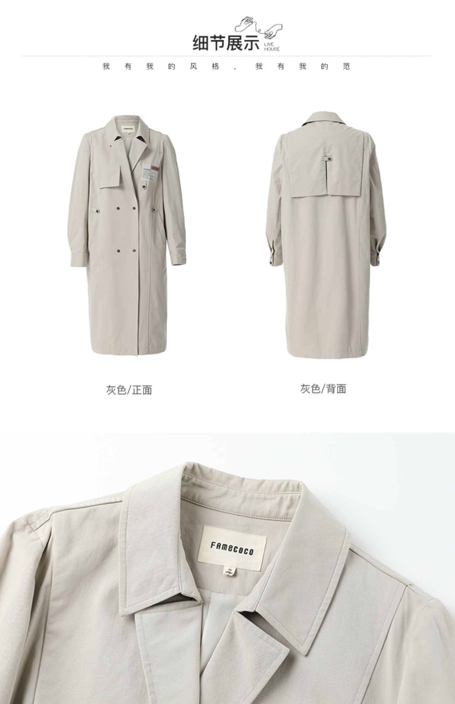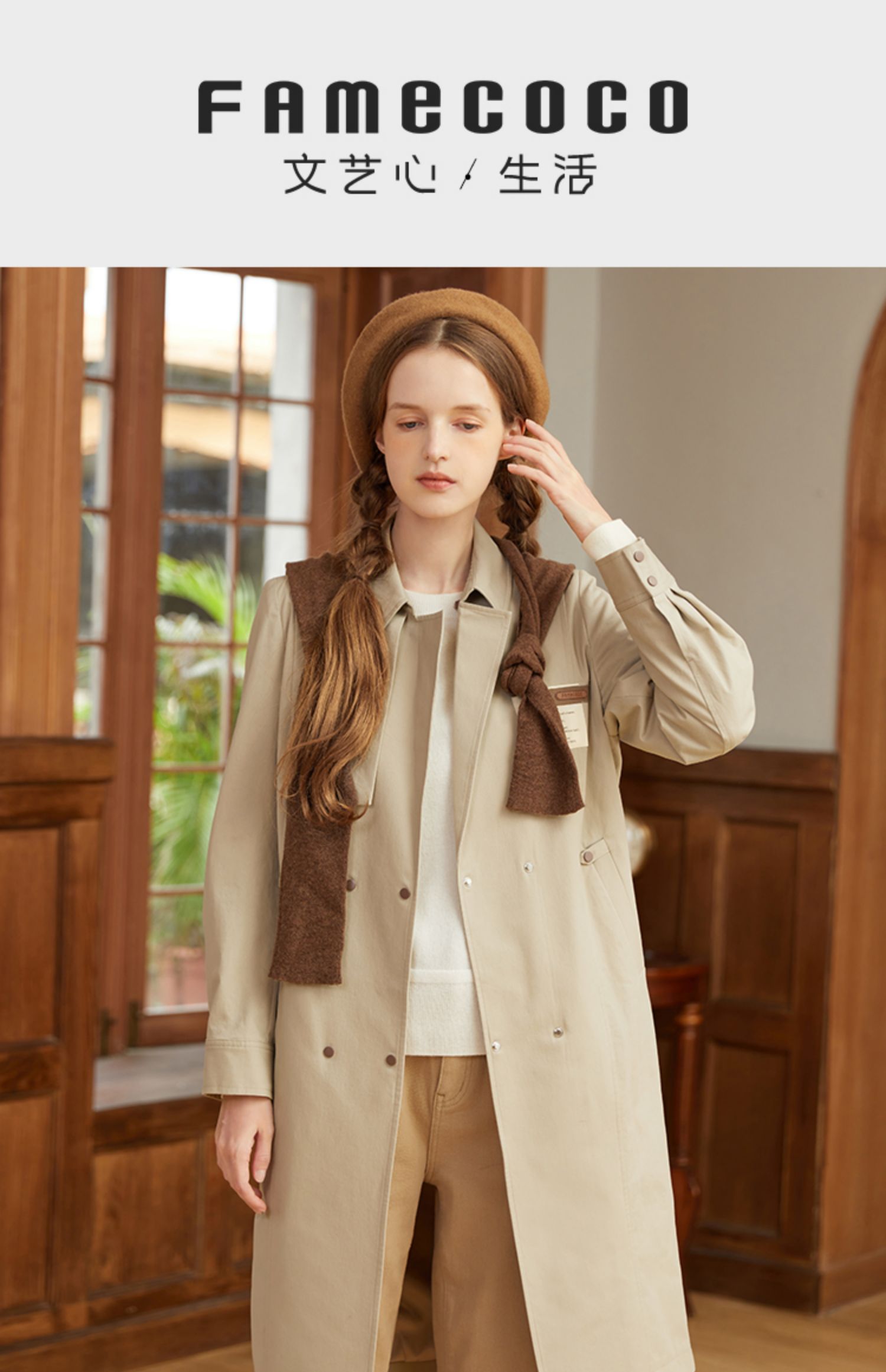 Famecoco范可儿卡其色女士风衣秋季纯棉长款外套高级气质F225AV002
