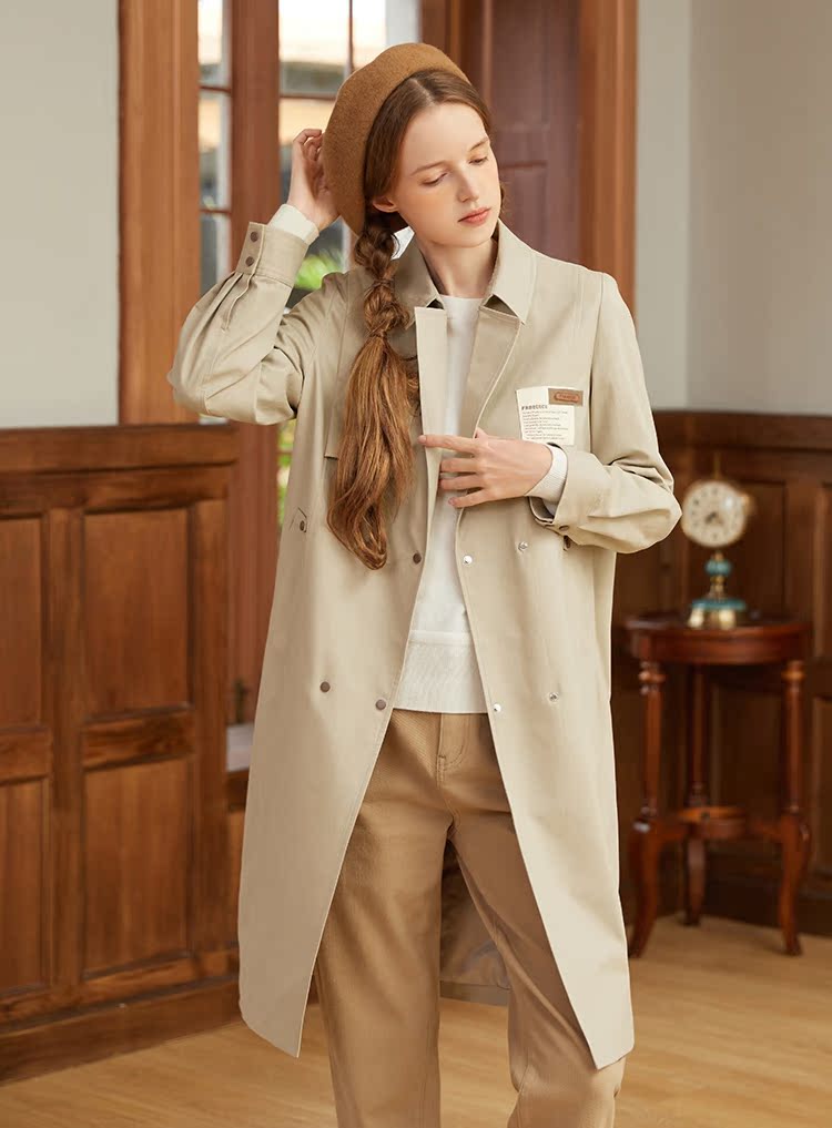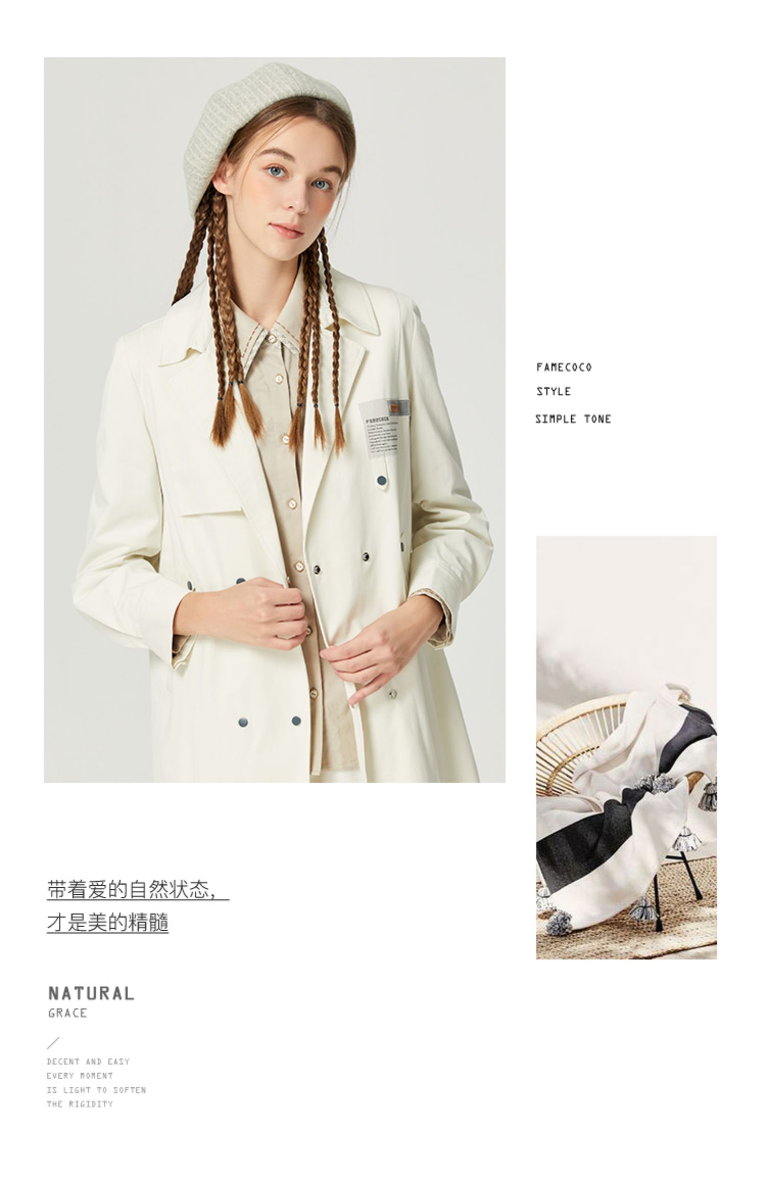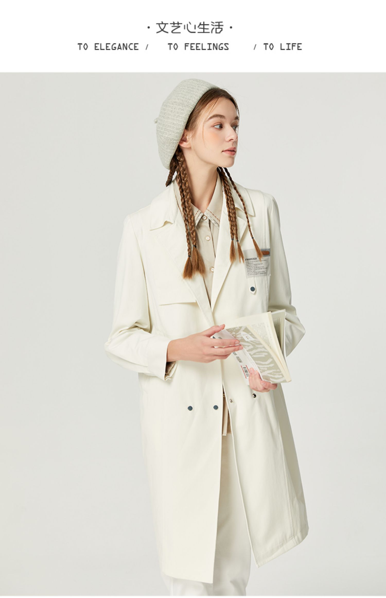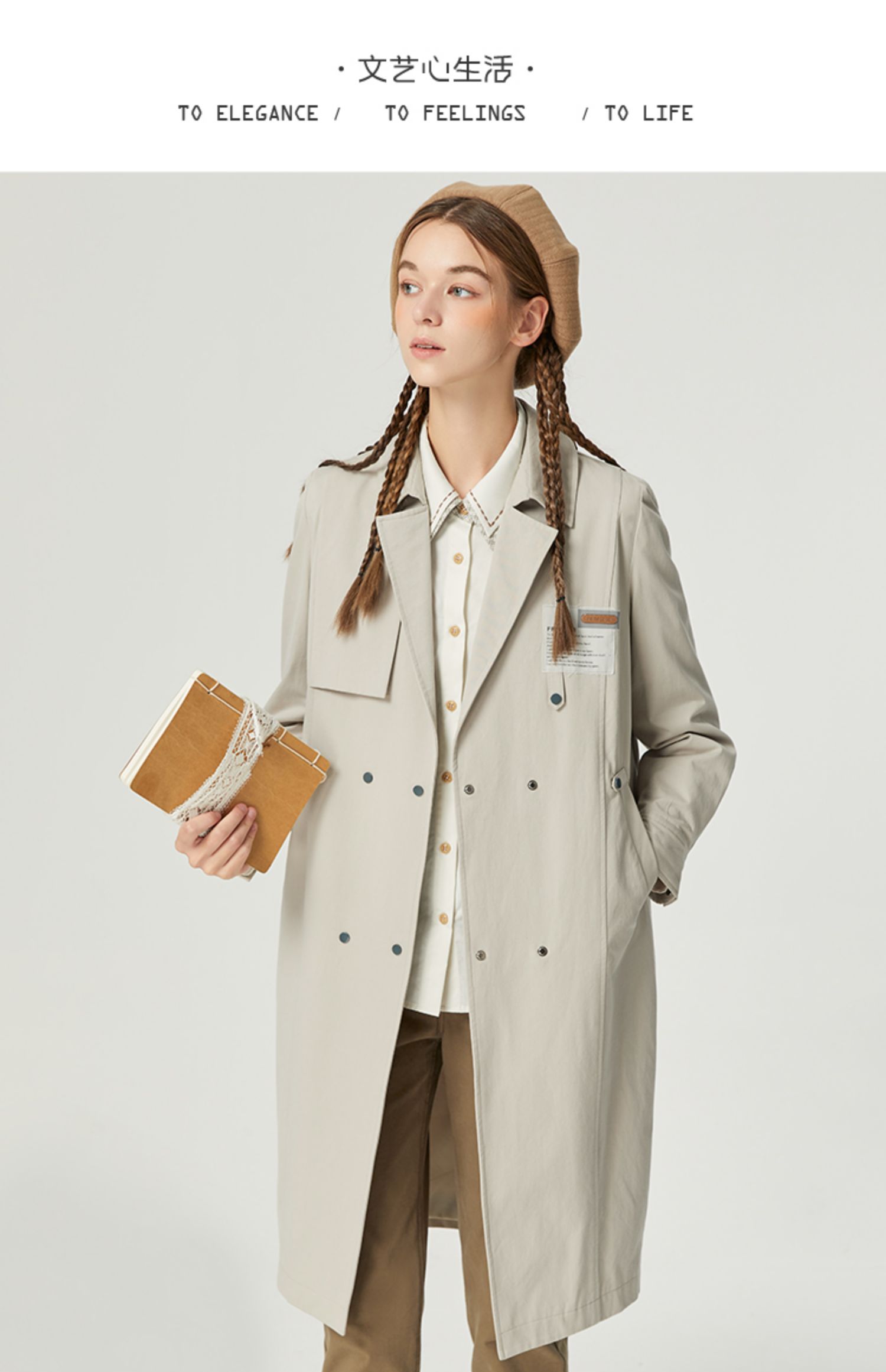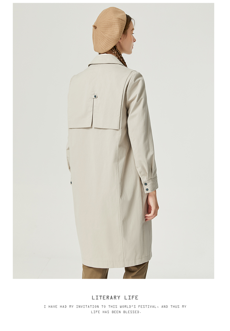 Famecoco范可儿卡其色女士风衣秋季纯棉长款外套高级气质F225AV002