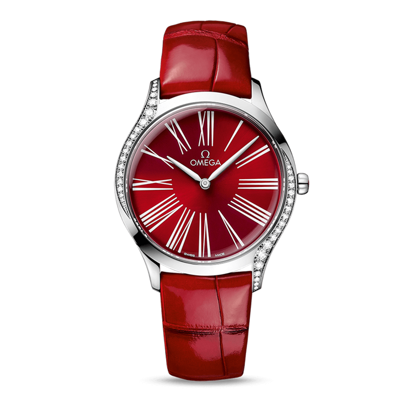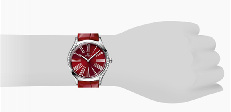 镜面材质 | 蓝宝石水晶玻璃 | 表盘 | 精钢表壳,亮漆红色表盘转印罗马数字,表冠镶饰一颗钻石,周围环绕着由5个欧米茄品牌标识相互交叠而成的红色陶瓷花朵图案。 镜面表背饰以“Her Time”(她的时光)图案。 |