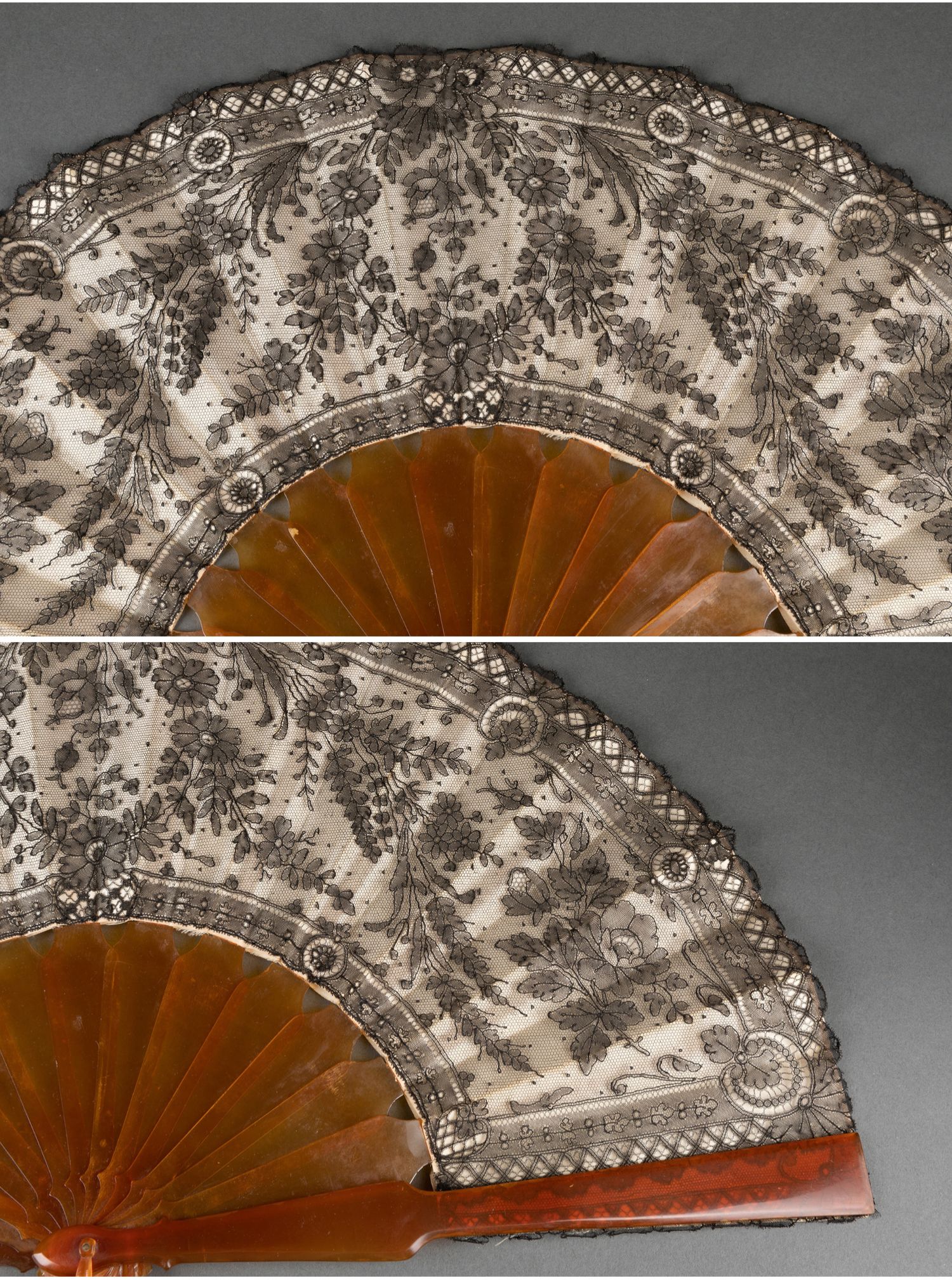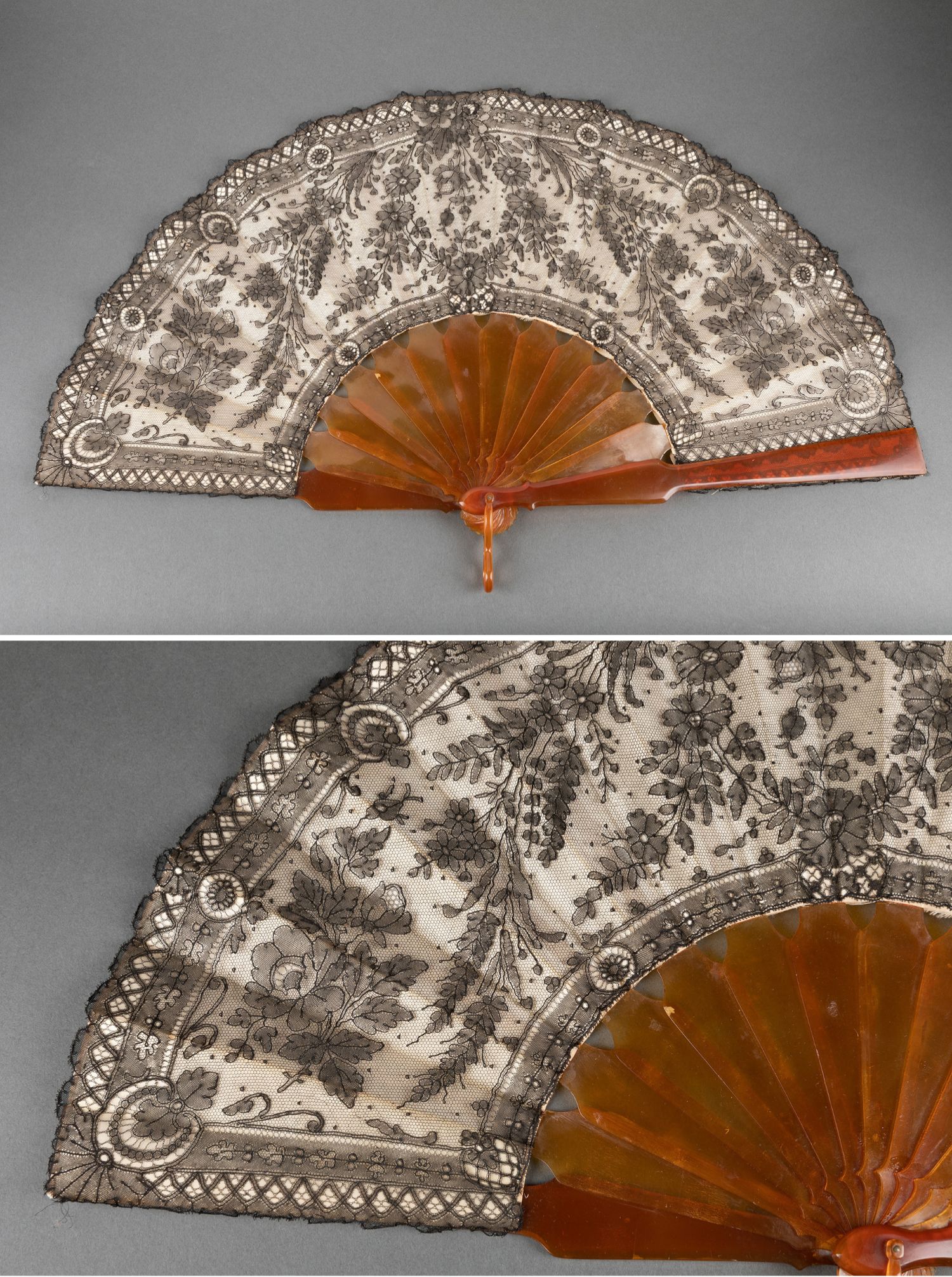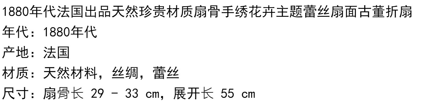 独角鹿西洋古董法国天然珍贵材质扇骨手绣花卉蕾丝扇面古董折扇