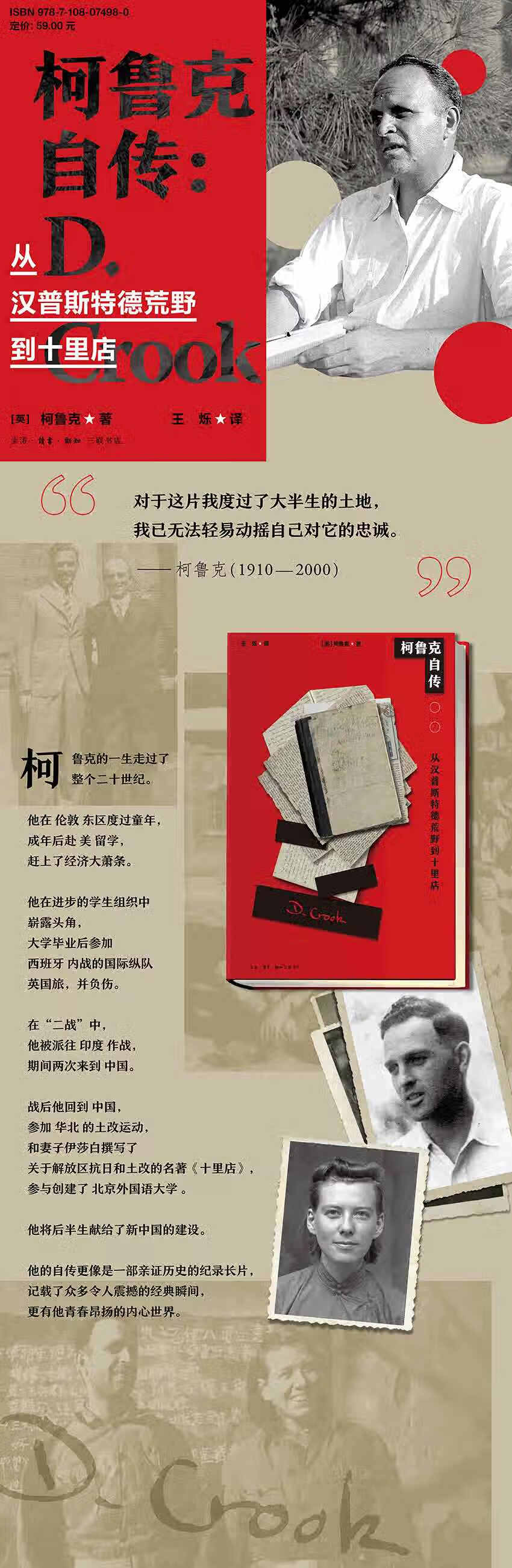 柯鲁克的一生走过了整个20世纪。他在伦敦东区度过童年,成年后赴美留学,赶上了经济大萧条。他在进步的学生组织中十分活跃,大学毕业后参加西班牙内战的国际纵队英国旅,并负伤。在“二战”中,他被派往印度作战,期间两次来到中国。战后他留在中国,参加华北的土地改革运动,和妻子伊莎白撰写了关于解放区抗日和土改的名著《十里店》,还参与创建了北京外国语大学。他将后半生献给了新中国的建设。