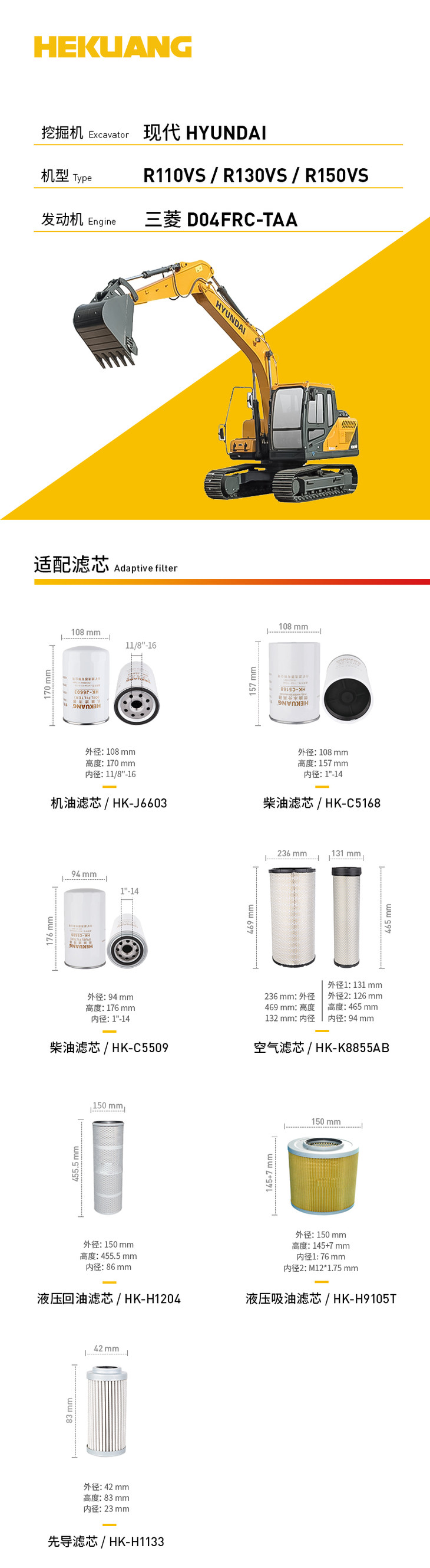 现代R110VS、R130VS、R150VS(三菱D04FRC-TAA)挖掘机滤芯 机油柴油空气滤芯 液压油先导滤芯