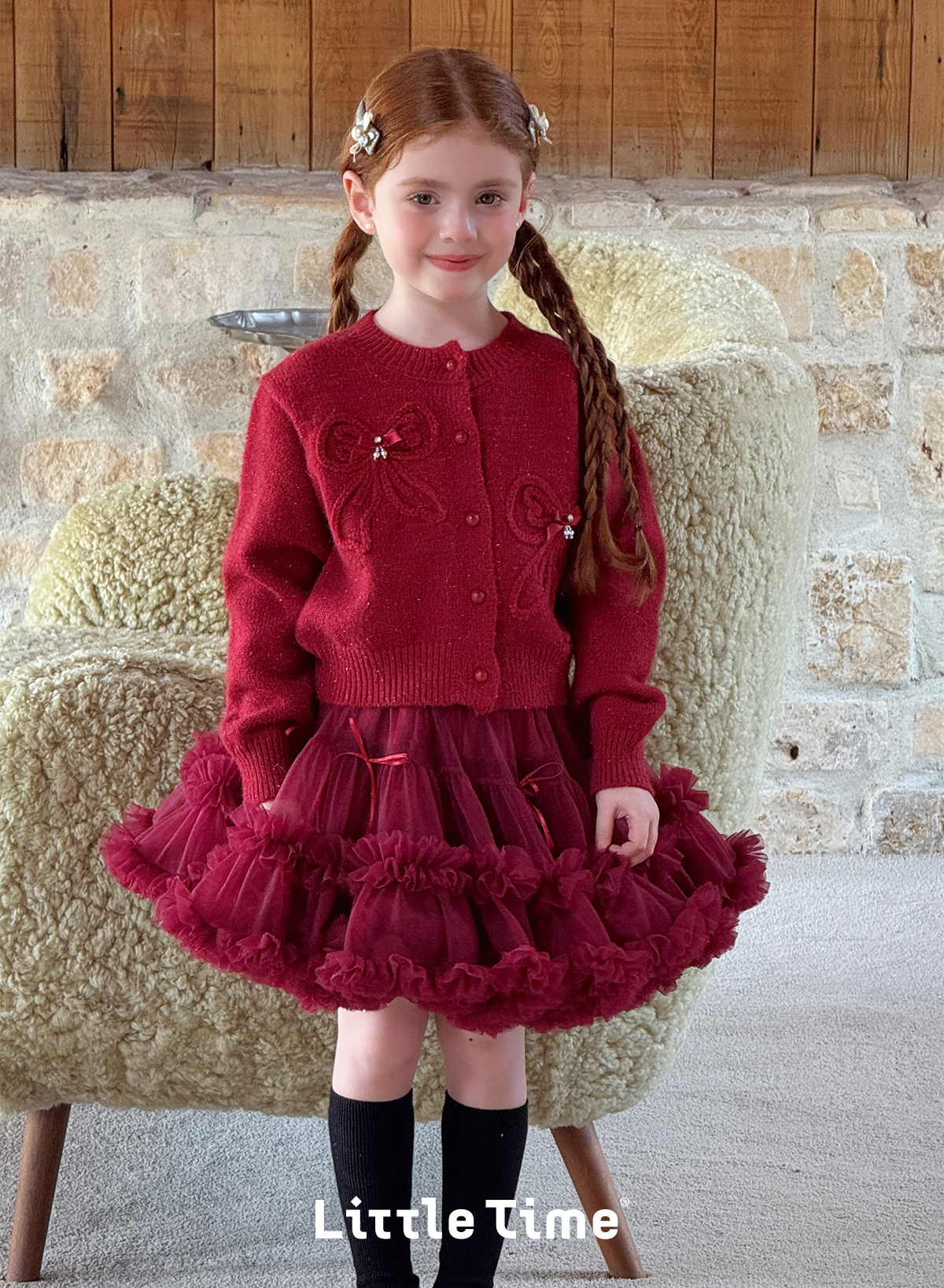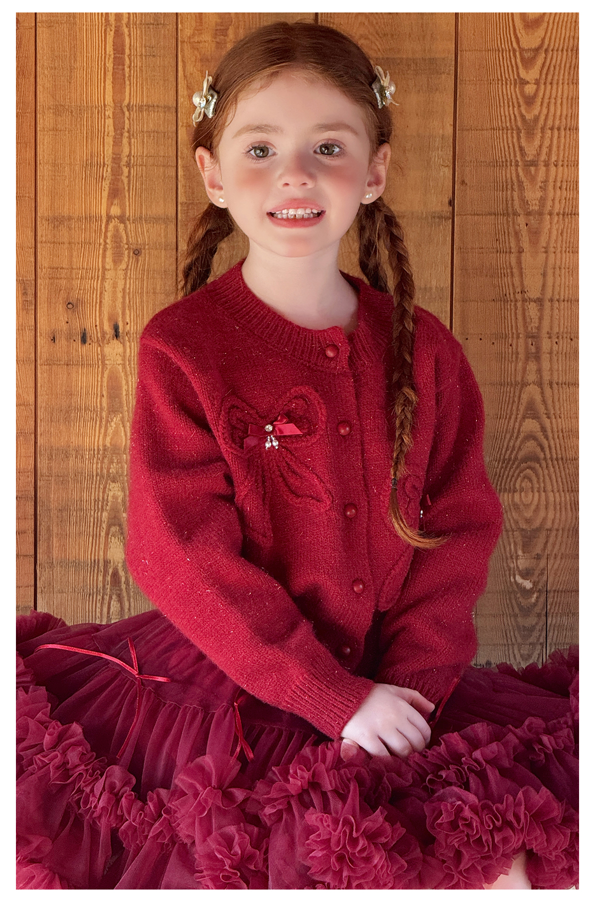 littletime女童毛衣2025秋冬新款韩版红色开衫精致蝴蝶结针织衫