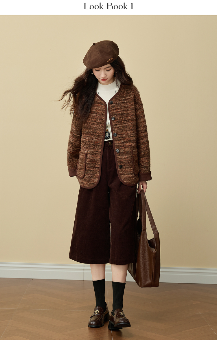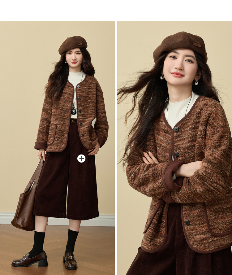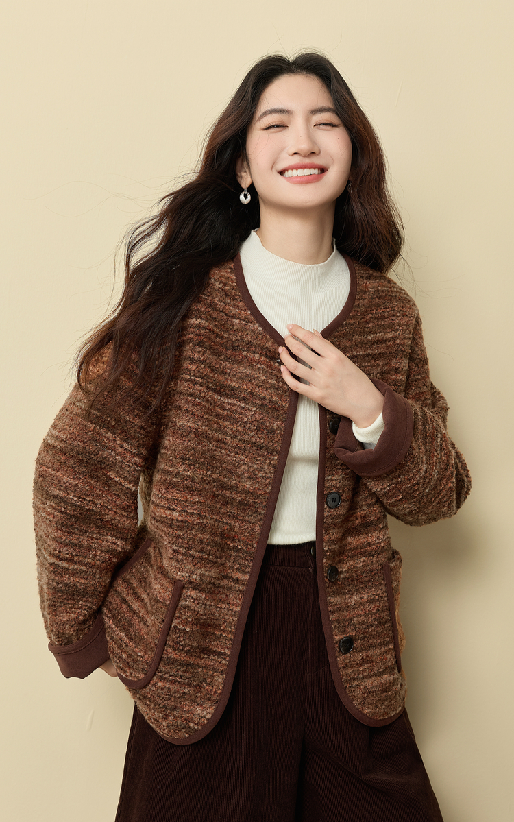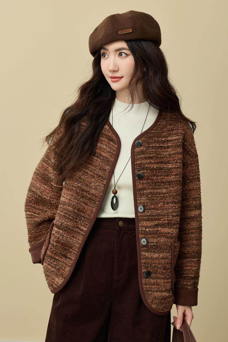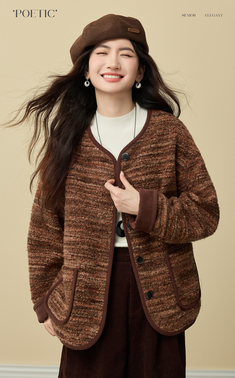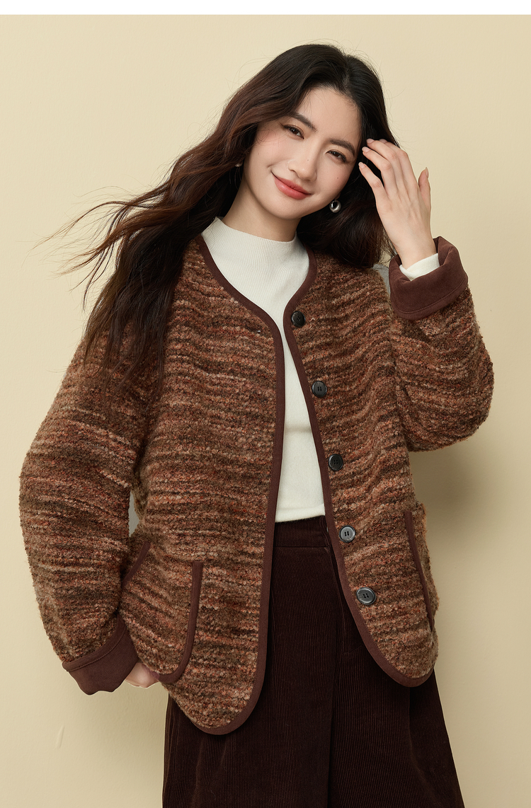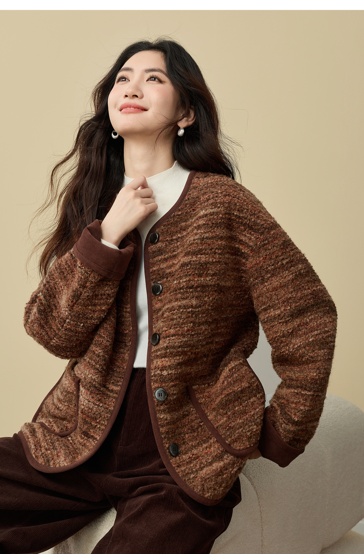 【11/19新品】熙世界小香风圆领复古毛呢外套女秋冬高级感圈圈绒感夹棉开衫上衣