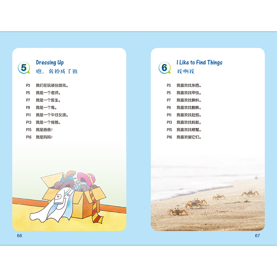 《阳光英语分级阅读一年级上》盒装内含10本英文读物《来一起玩啊,萨拉》《猜猜我爱吃什么》《吃饭啦》《我的各种小情绪》《瞧,我扮成了谁》《找啊找》《冲冲冲!》《谁会跳?》《该睡觉了》《谁住在海里?》,以及一本配套的《阅读指导手册》。10本英文读物从孩子的日常生活视角出发,故事类读物从孩子的日常生活视角出发,通过简单的小故事帮助孩子建立对周围事物的认知或培养积极的情感态度,比如《来一起玩啊,萨拉》这本读物,通过孩子在学校里邀请聋哑人同学一起玩游戏的小故事,培养孩子们平等尊重对待同学的意识;百科类读物内容丰富,引导孩子观察身边的事物,开拓眼界与思维,比如在《找啊找》中以孩子的观察视角呈现出树丛、土壤、河边和海边等可以找到的小动物,激发探索世界的好奇心和兴趣。套装内10本英文读物均可点读,扫描单书封底可扫码听音频,适合小学一年级学生阅读与学习。