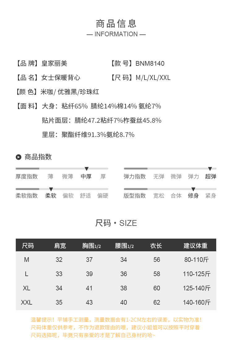 皇家丽美中厚款弹力大柔软舒适轻薄透气女款保暖背心BNM8140