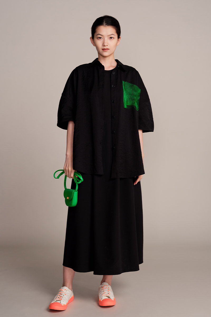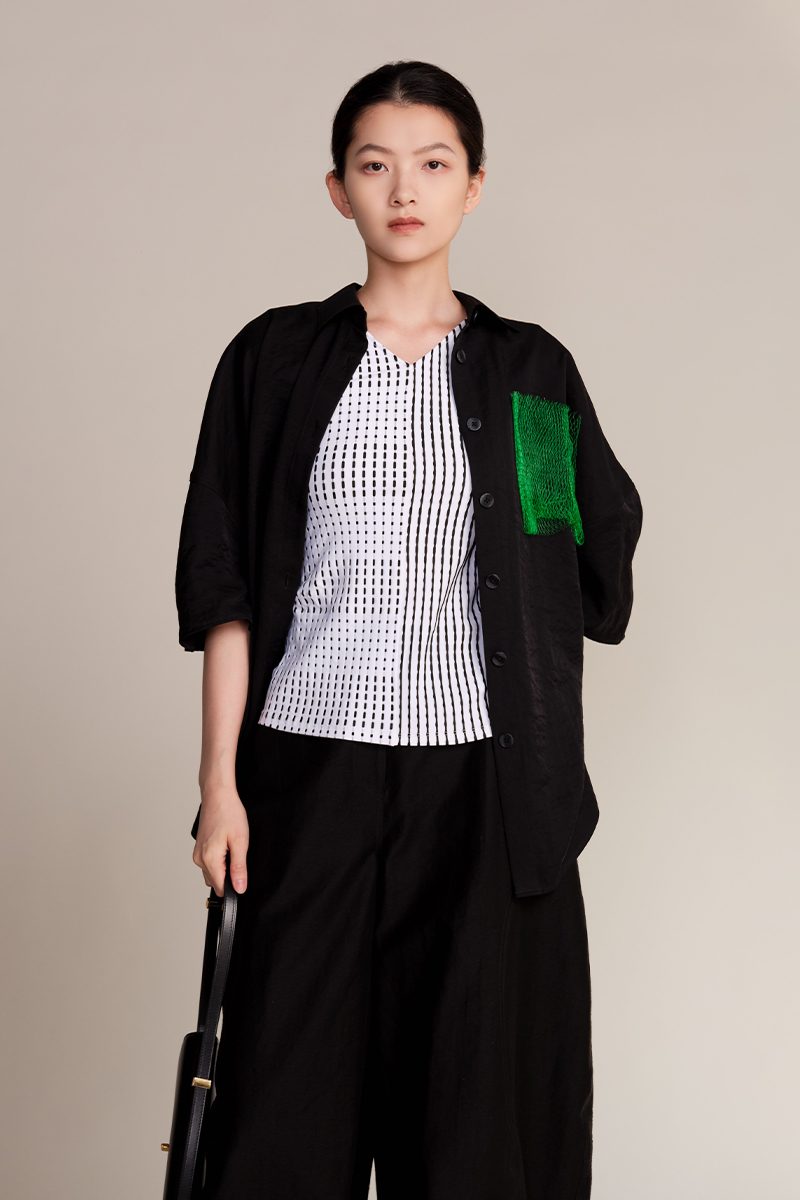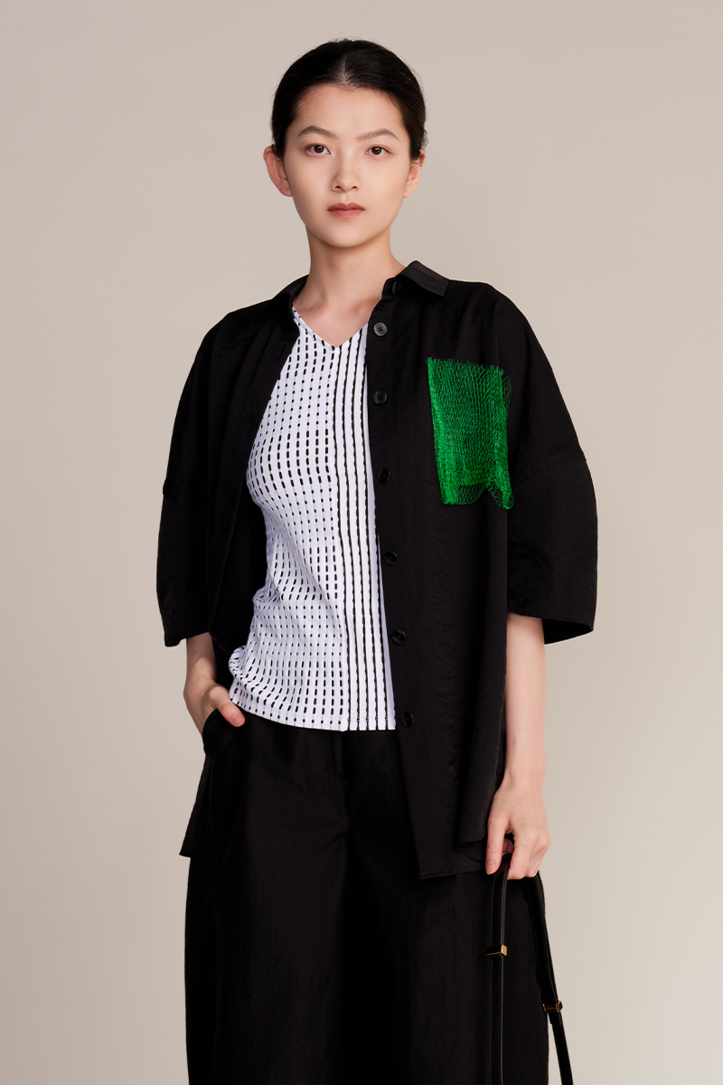 JUDYHUA J For Judy 解构绿意网纱立体褶五分袖衬衫