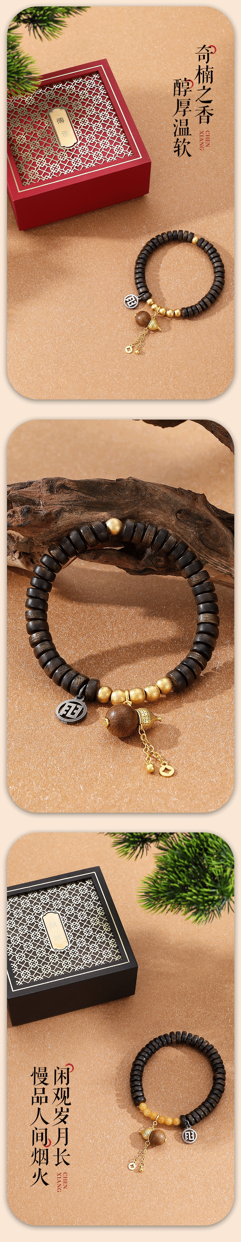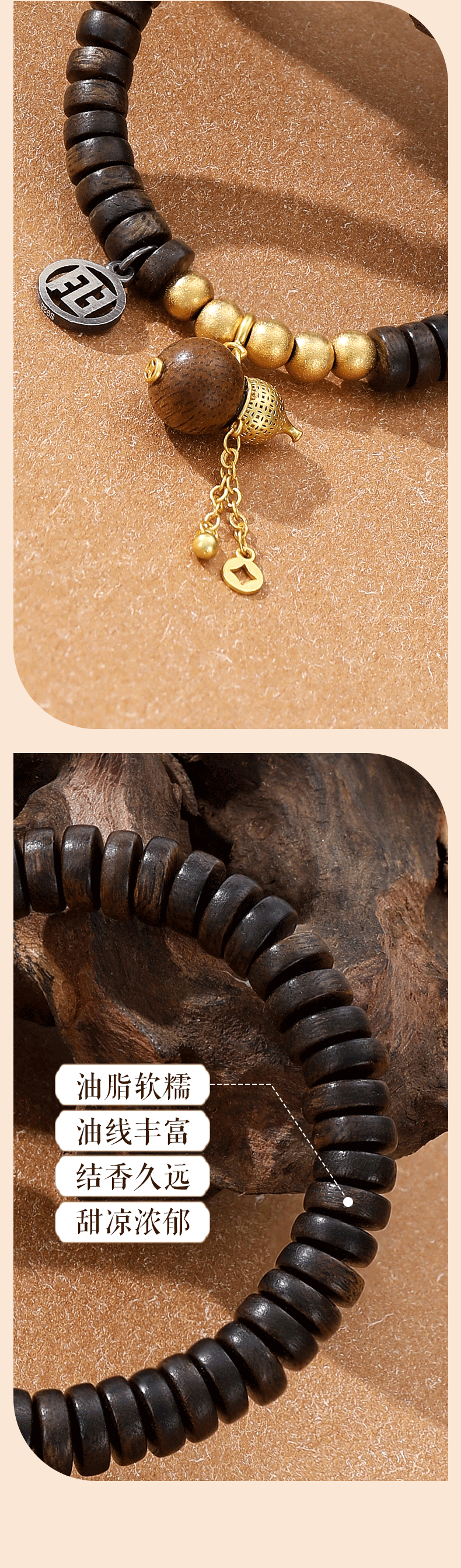 - 避免接触化学物质:香水、护手霜、洗涤剂等化学用品会腐蚀沉香油脂,佩戴前请先做好护肤、喷好香水,待完全吸收后再戴手串。