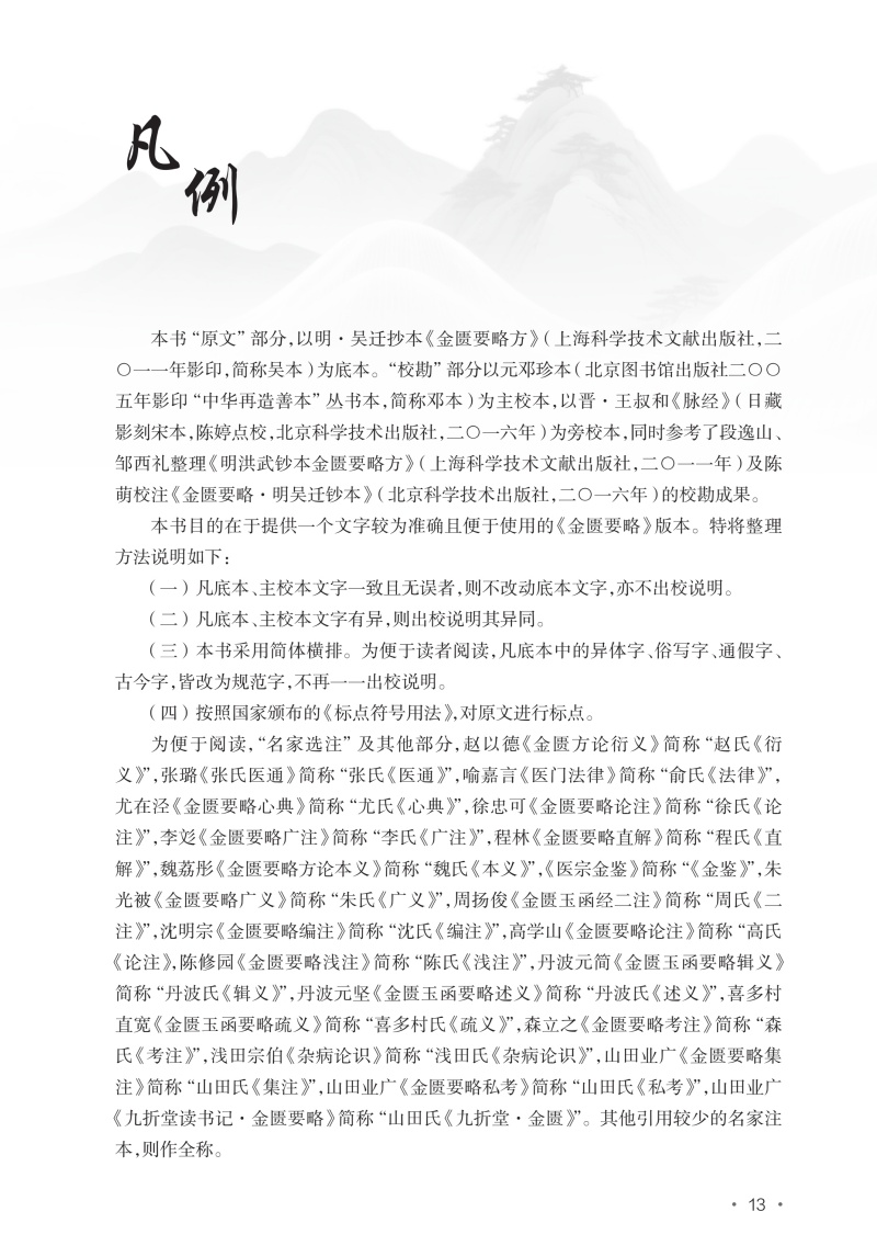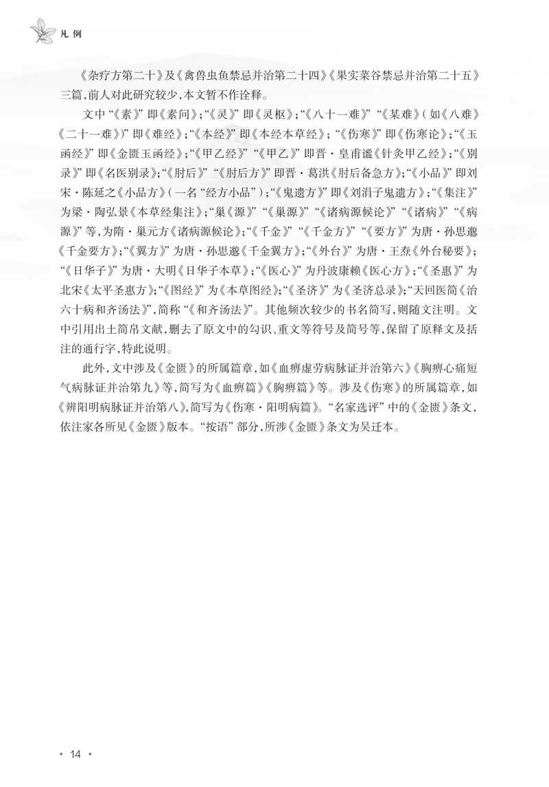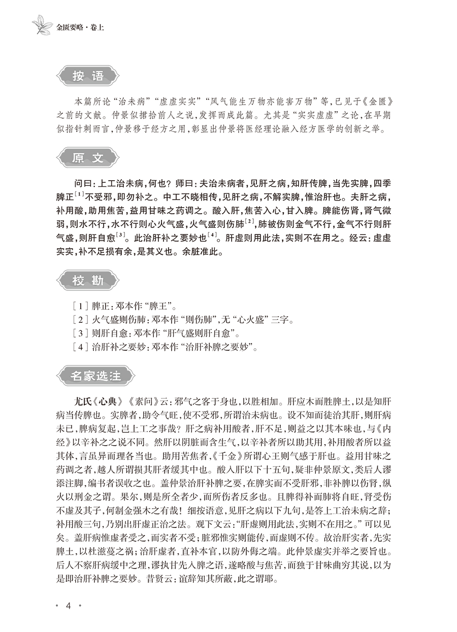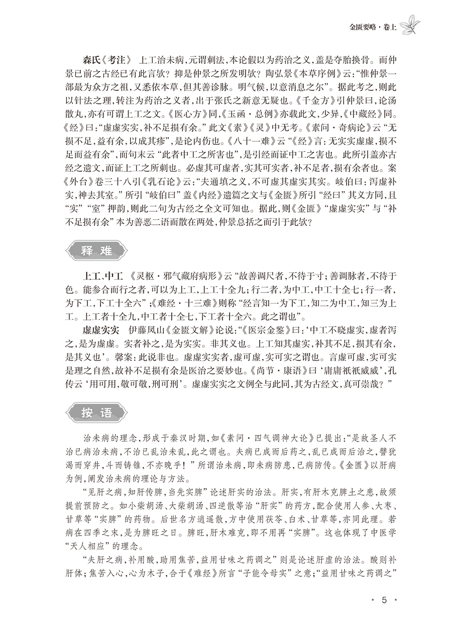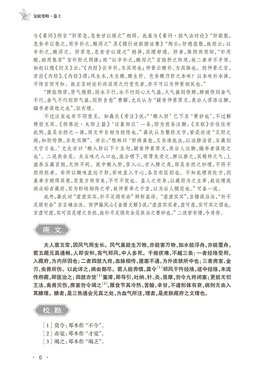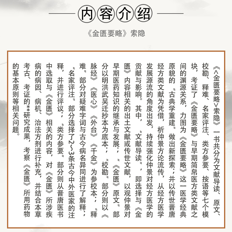 《<金匮要略>索隐》一书共分为文献导读、原文、校勘、释难、名家评注、类方参要、按语等七个模块,考证了《金匮要略》与早期简帛医方类文献之间的渊源关系,力图为《金匮要略》这一医学经典原貌的“古典学重建”做出新探索;并以传世晋唐经方类文献为凭借,析仲景方论流传,从经方医学发展源流的角度出发,持续强化仲景对经方医学的贡献与影响。其中,“文献导读”,即选择与《金匮》内容相关的出土文献或传世文献,以观仲景对早期医药知识的继承与发展;“《金匮》原文”部分以明洪武吴迁抄本为底本;“校勘”部分则以《脉经》《医心》《外台》《千金》为参校本;“释难”部分对疑难字词与古今病名异同进行了解释;“名家评注”部分选择了2~3条古今中外医家的注释,并进行评议;“类方参要”部分则从晋唐医书中选取与《金匮》相关的内容,对《金匮》所涉疾病的病因、病机、治法方剂进行补充,并结合本草考古、考证的**研究成果,考察《金匮》所用药物的基本原则等相关问题。