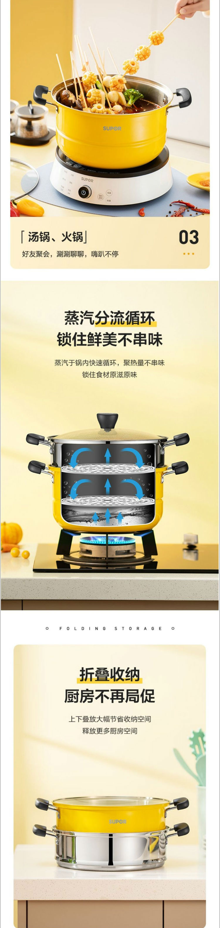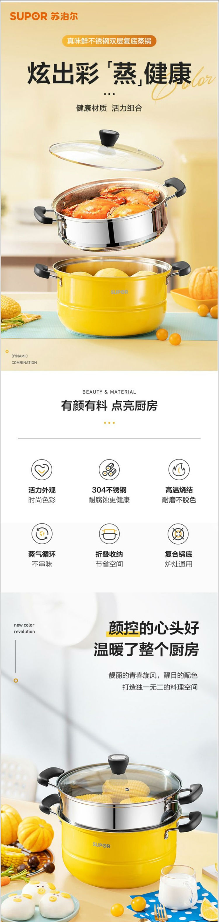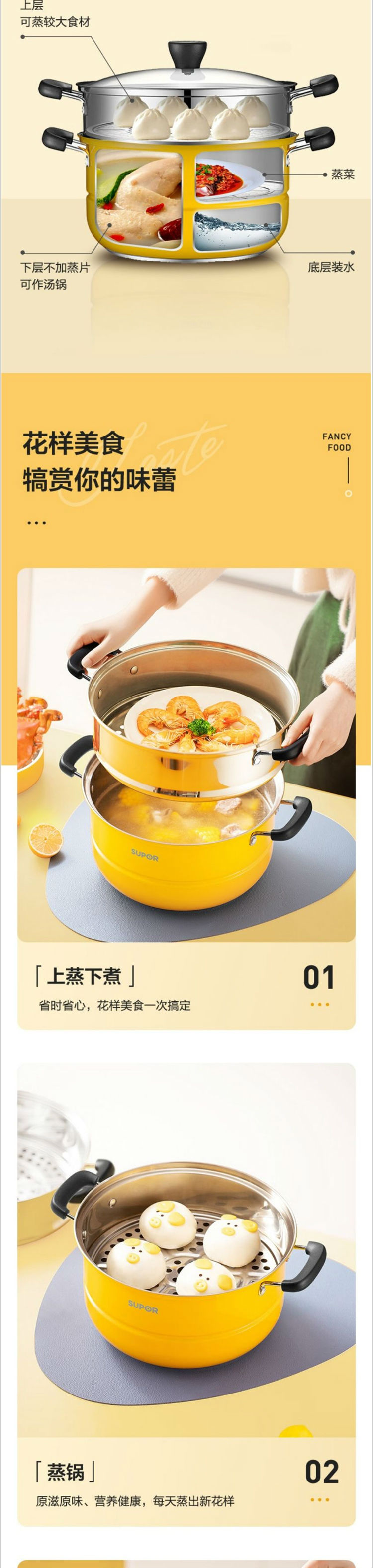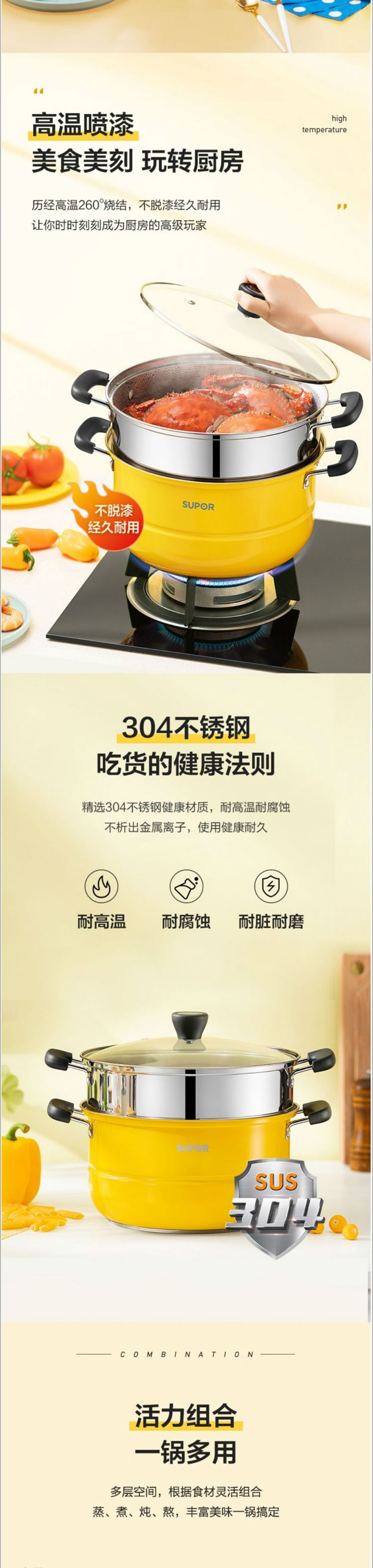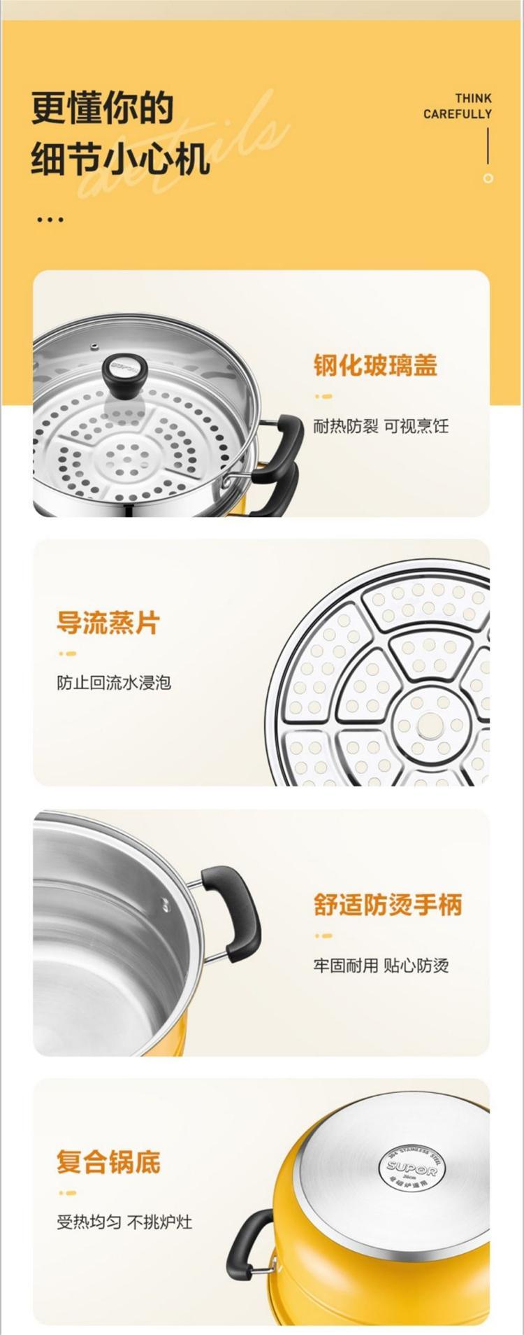 苏泊尔SUPOR蒸锅真味鲜304不锈钢双层复底电磁炉通用活力黄EZ26BS08