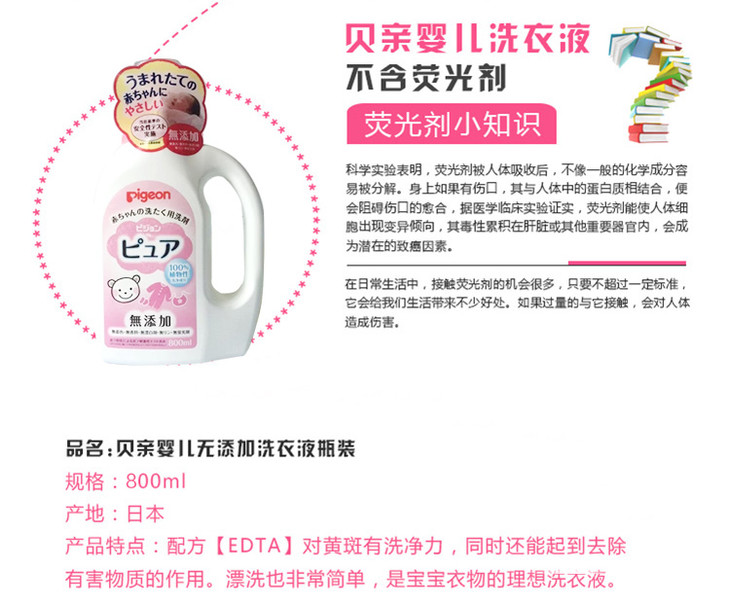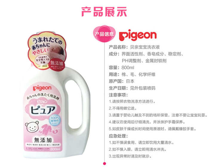 【一般贸易中文标 】日本贝亲Pigeon婴儿宝宝无添加温和洗衣液 800ml