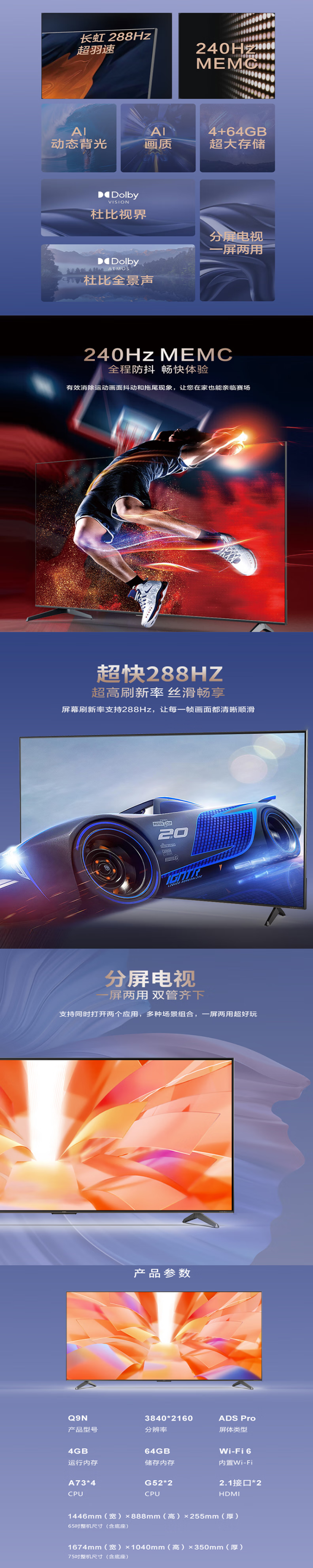 长虹(912620)(CHANGHONG)65英寸 65Q9N 原画旗舰电视 288Hz 游戏 4+64G