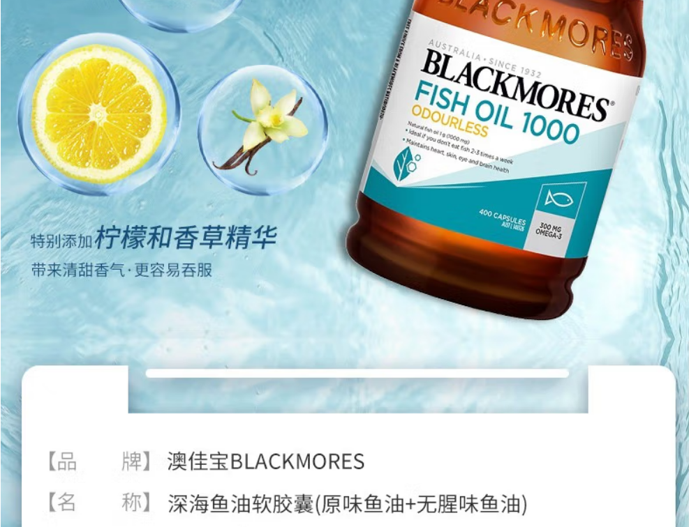 澳佳宝Blackmores无腥味深海鱼油胶囊 400粒/瓶【效期至2024.10~2025.1】