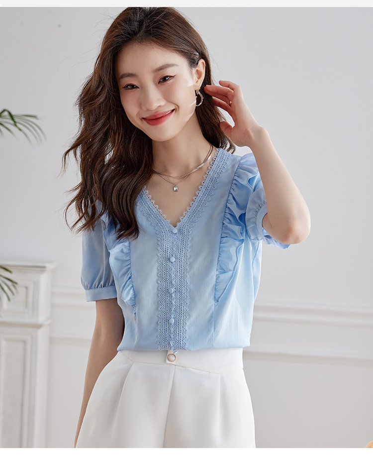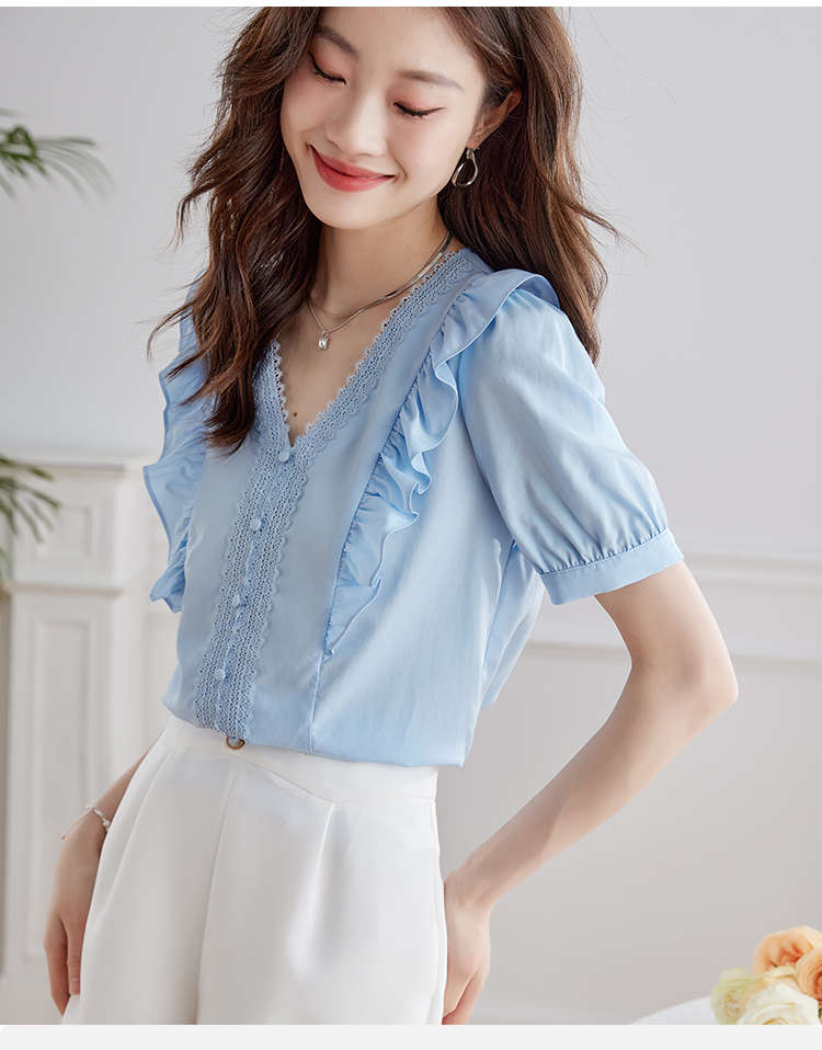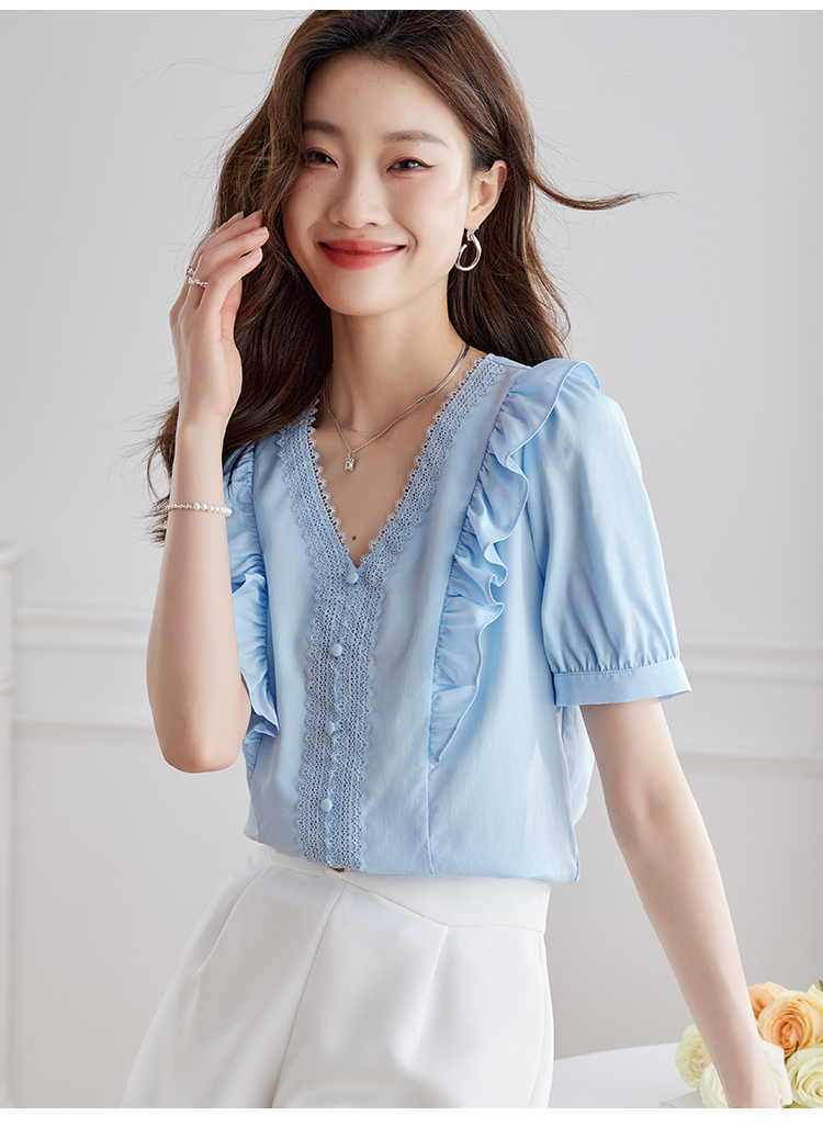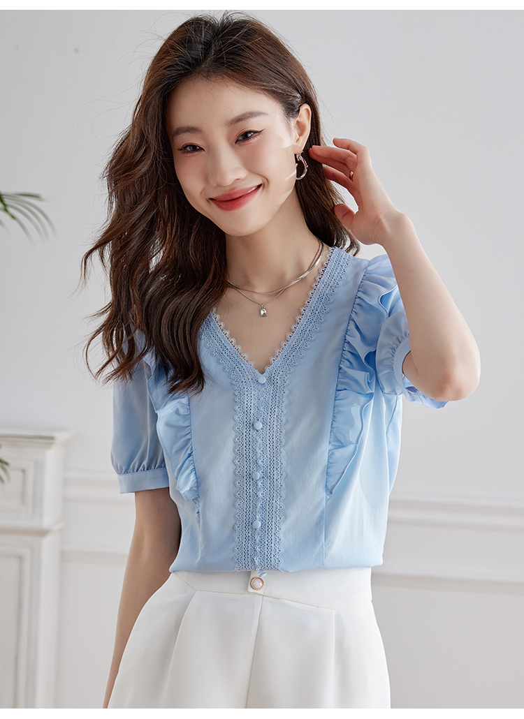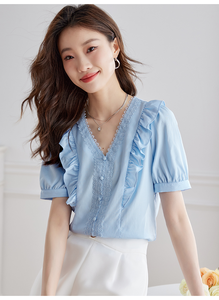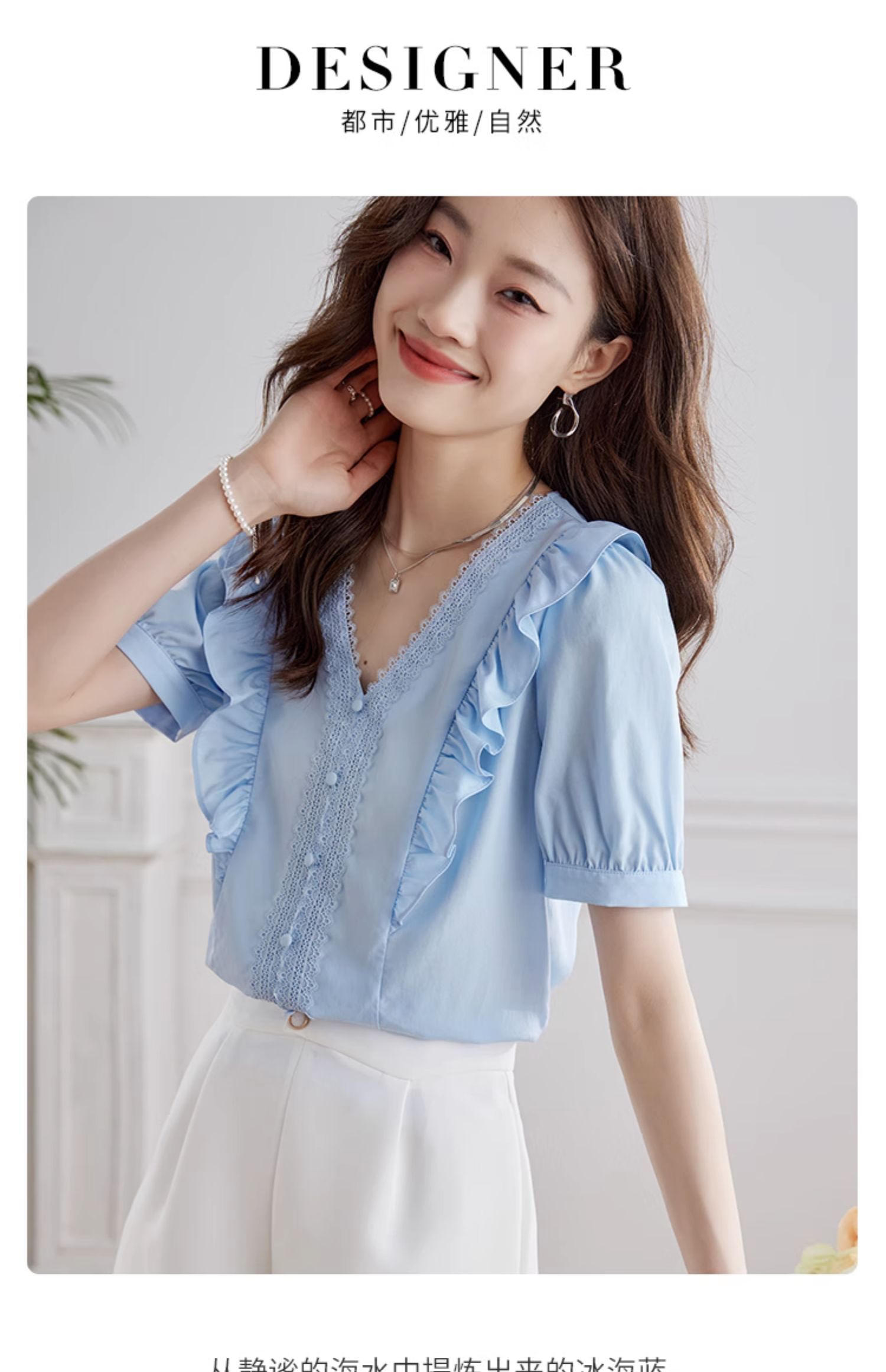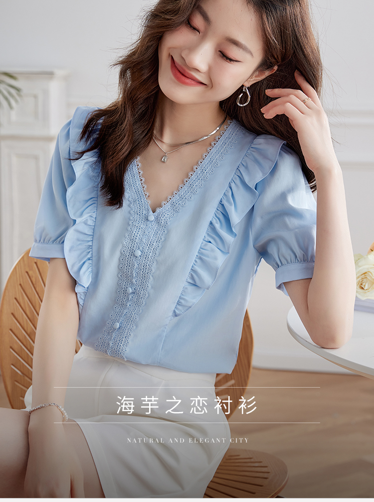【618秒杀】熙世界蕾丝花边V领衬衫女设计感法式别致荷叶边上衣2025夏季新款