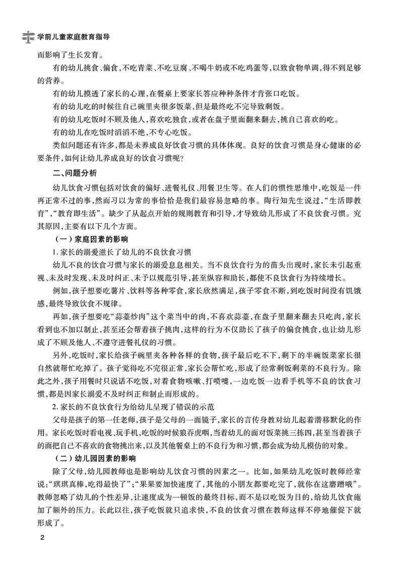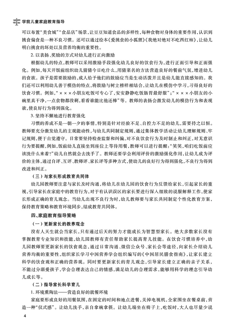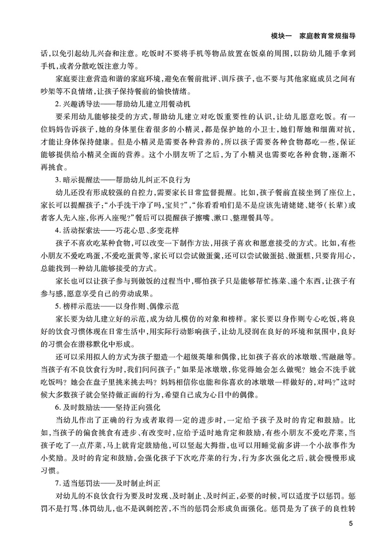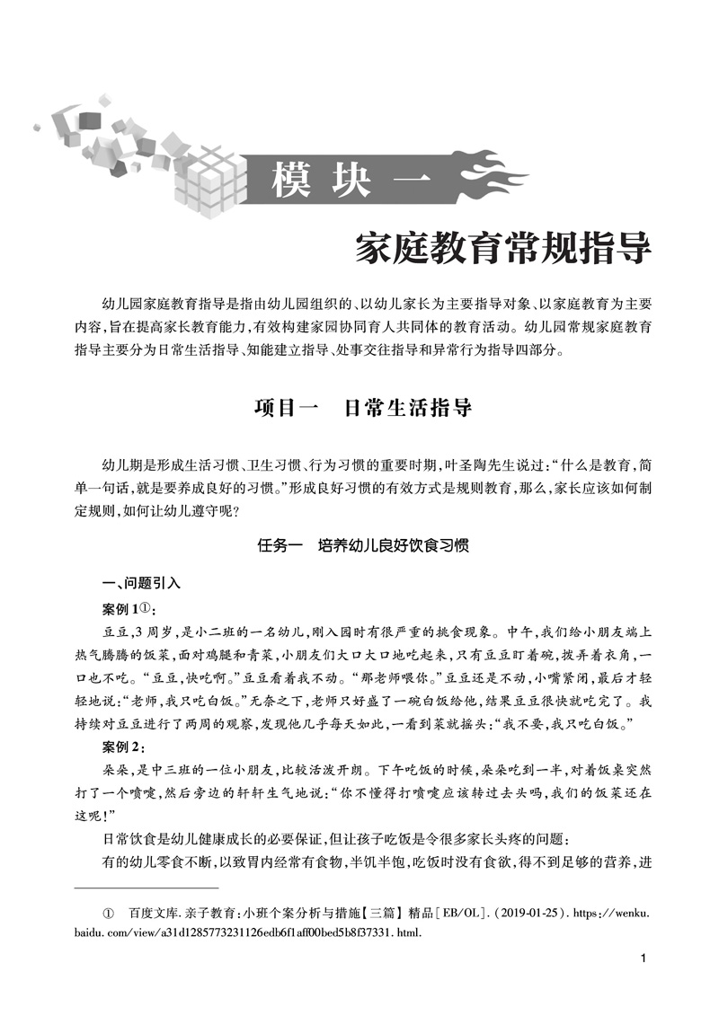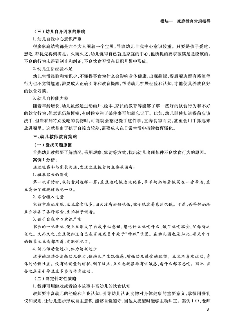 本书依据幼儿园教师家庭教育工作中切实需要的知识技能和内容开发了常规家庭教育指导、家园突发问题指导和家园活动策划指导三个项目。常规家庭教育指导这个项目包括日常生活、知能建立和处事交往三个篇目;家园突发问题指导这个项目包括突发疾病、家园矛盾、异常行为和外力突发事件四个篇目。家园活动策划指导这个项目包括家长会、家园节日活动、家长学校、家庭访问和现代信息技术沟通五个篇目。每个篇目包含若干个任务。本课程总结了共43个任务,充分体现了职业教育的特点。