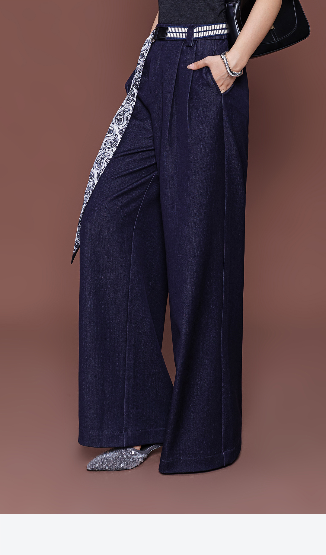 秋上新阔腿版型藏蓝色个性腰带装饰牛仔裤3253022