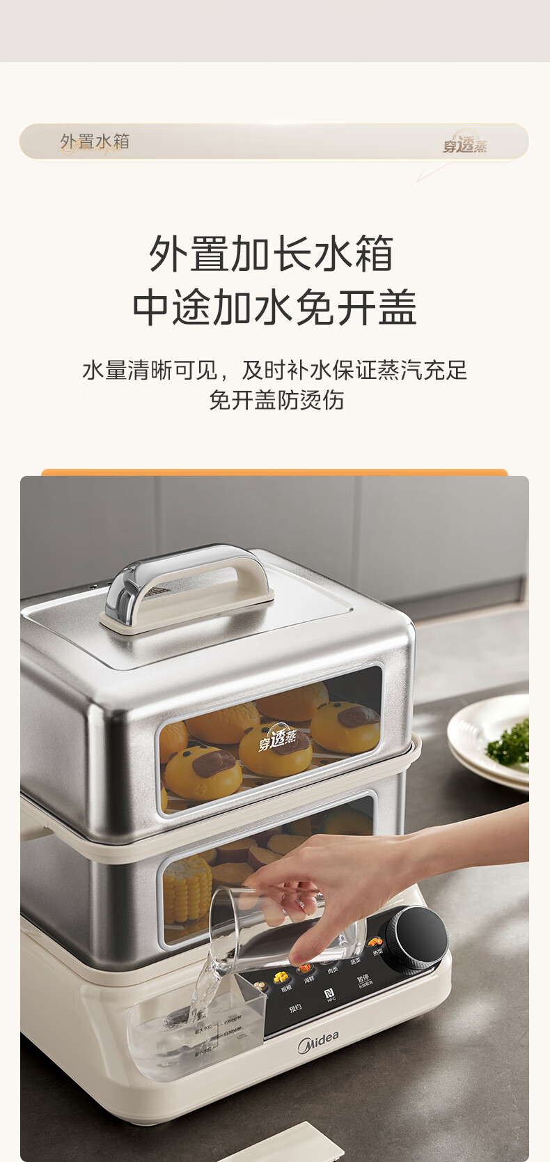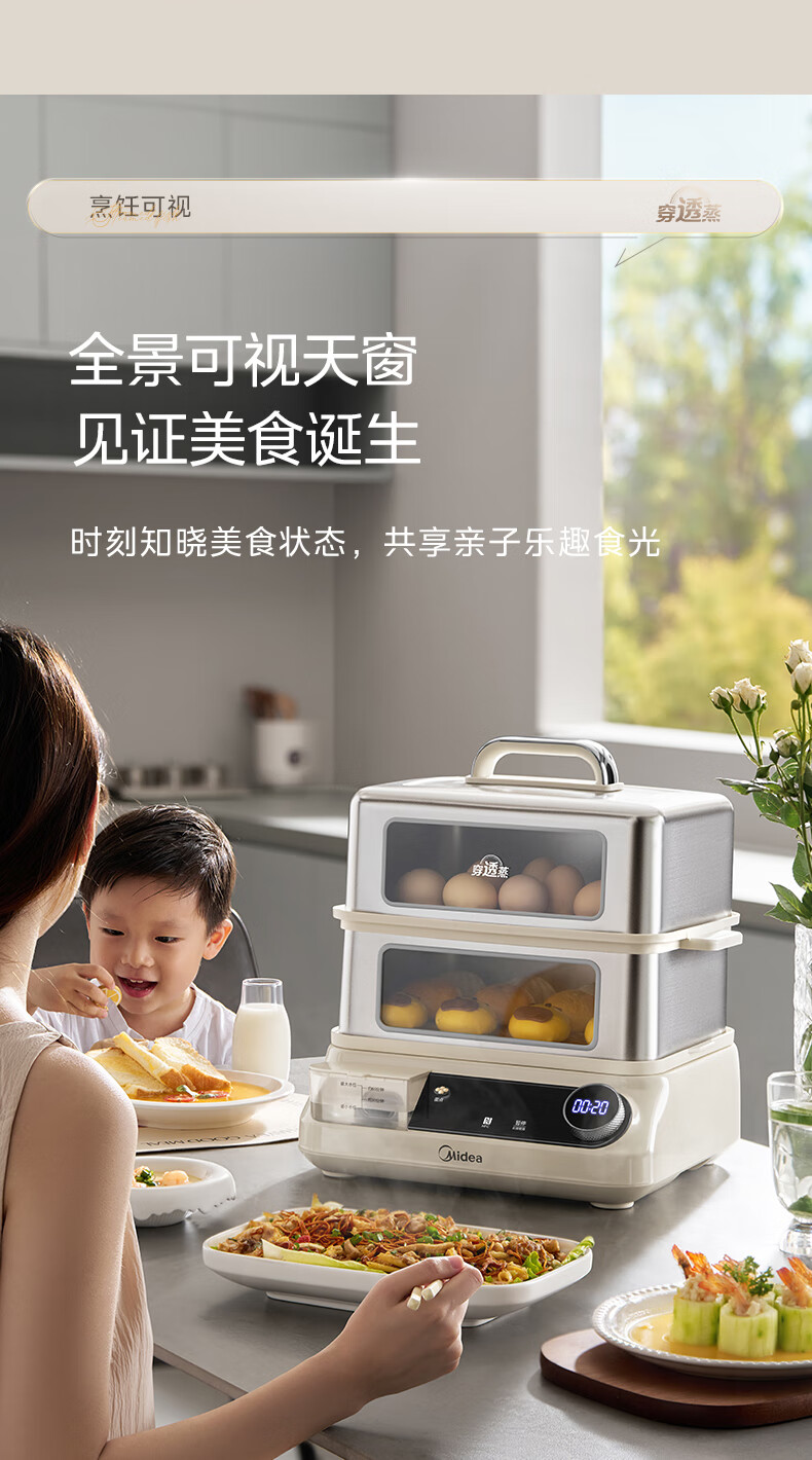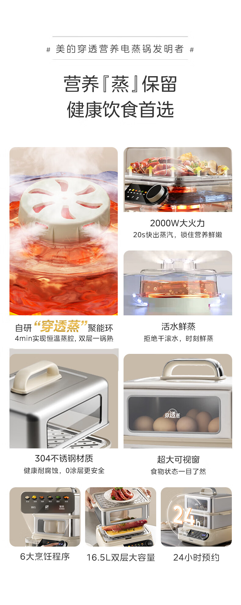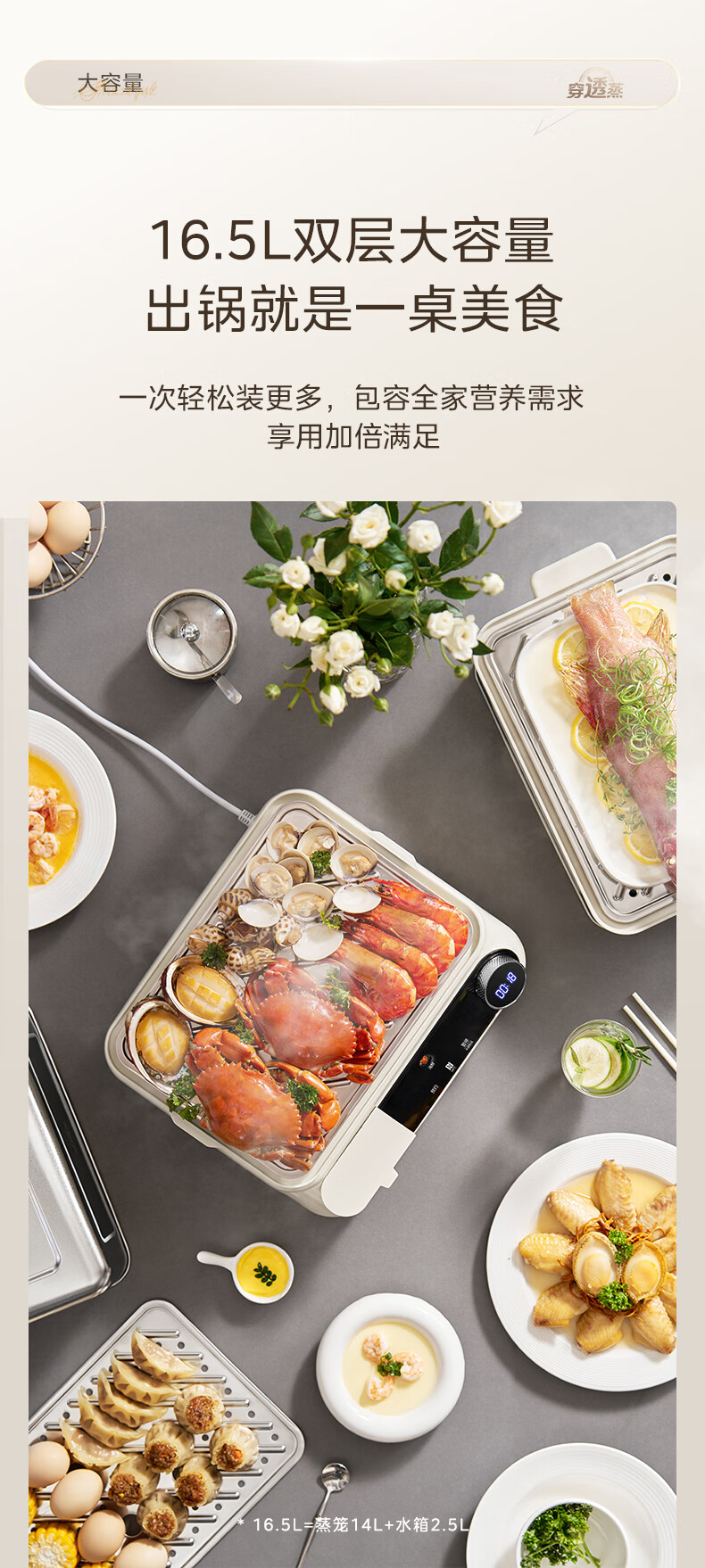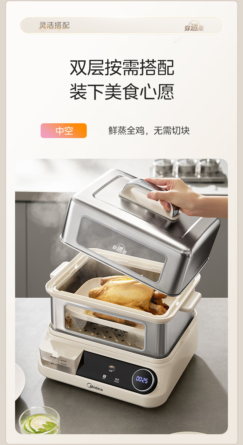 美的(Midea)穿透蒸电蒸锅不锈钢全景可视多功能锅预约保温16.5L双层大容量外置加水ZGC302352KS