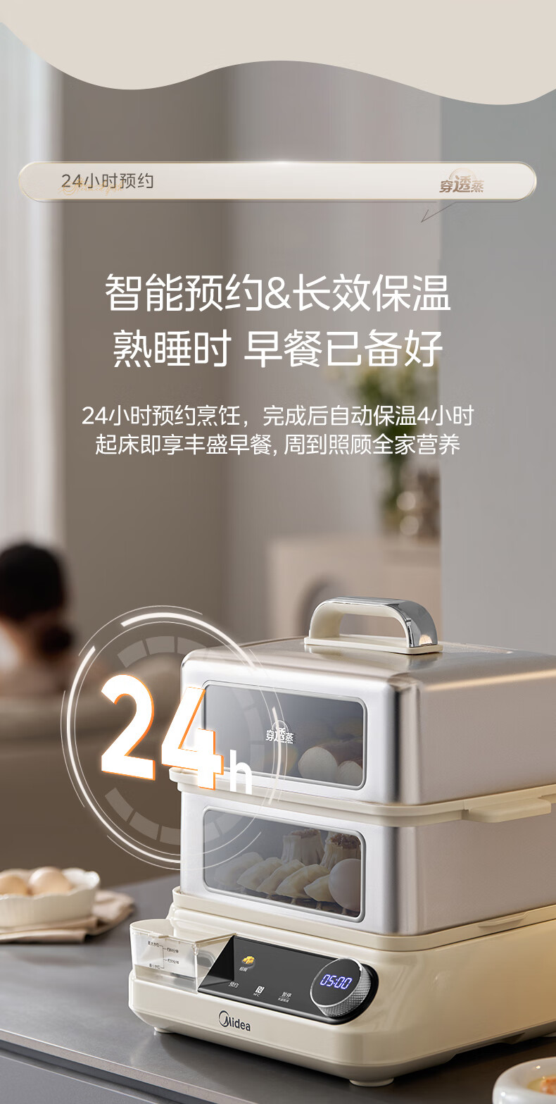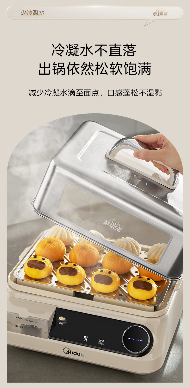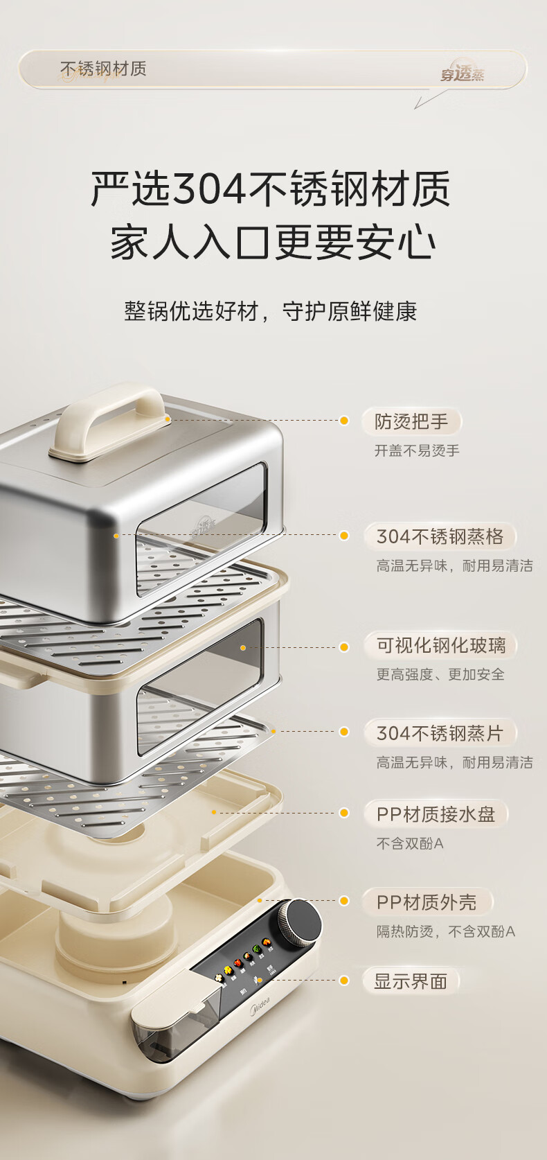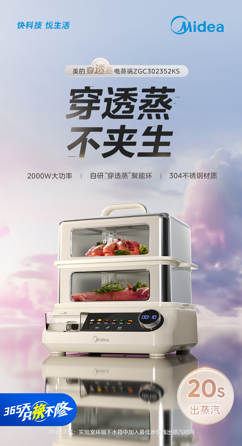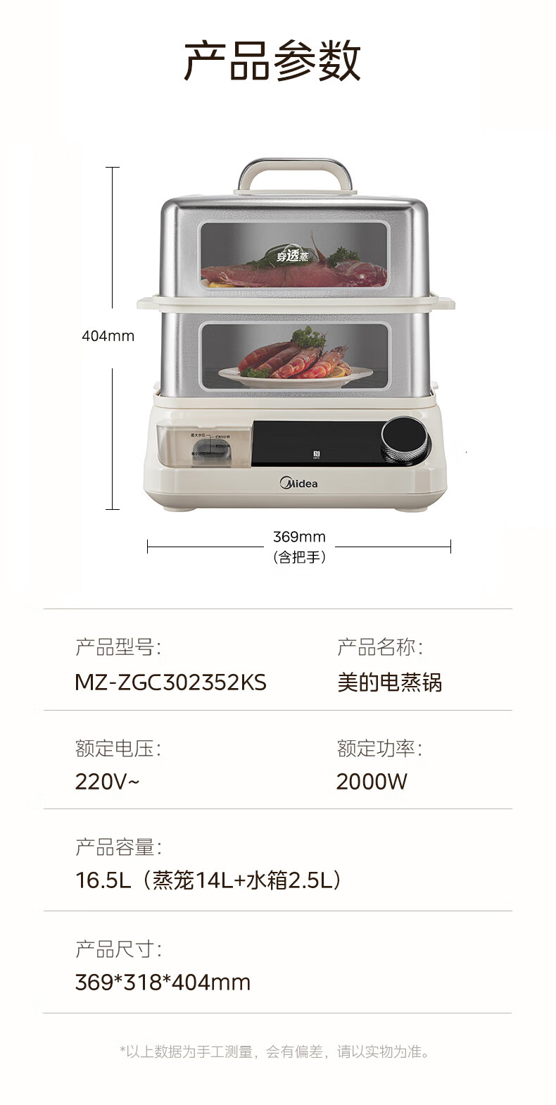 美的(Midea)穿透蒸电蒸锅不锈钢全景可视多功能锅预约保温16.5L双层大容量外置加水ZGC302352KS