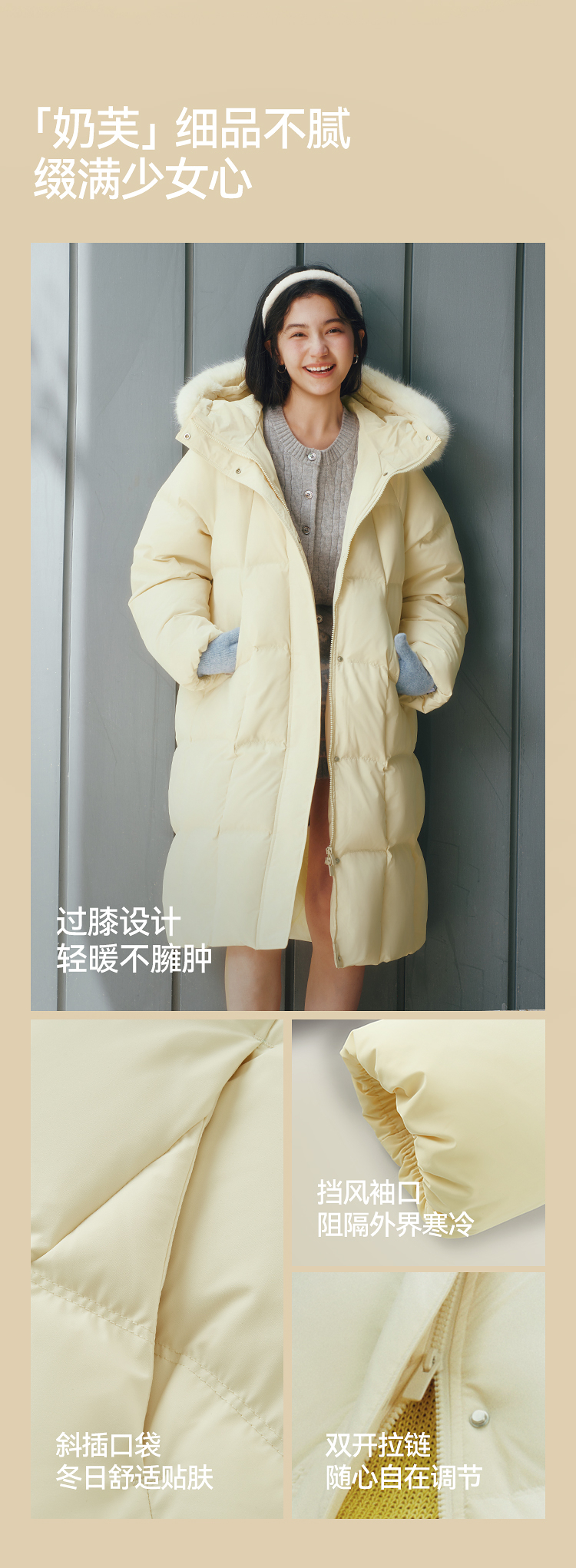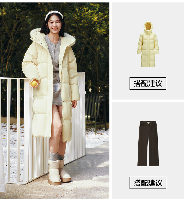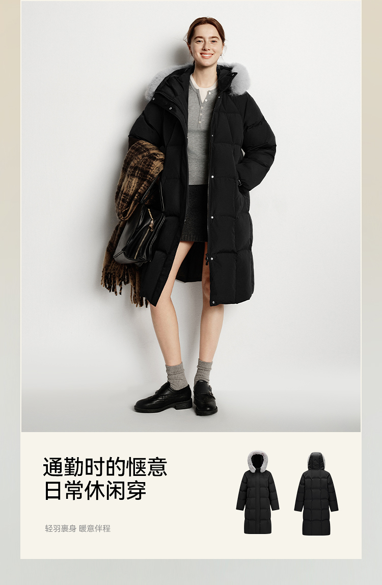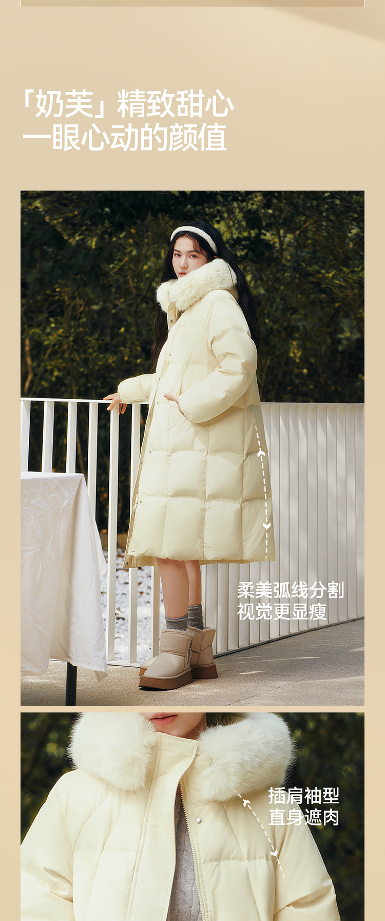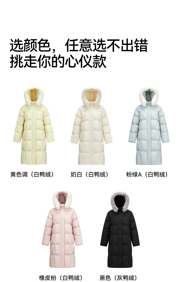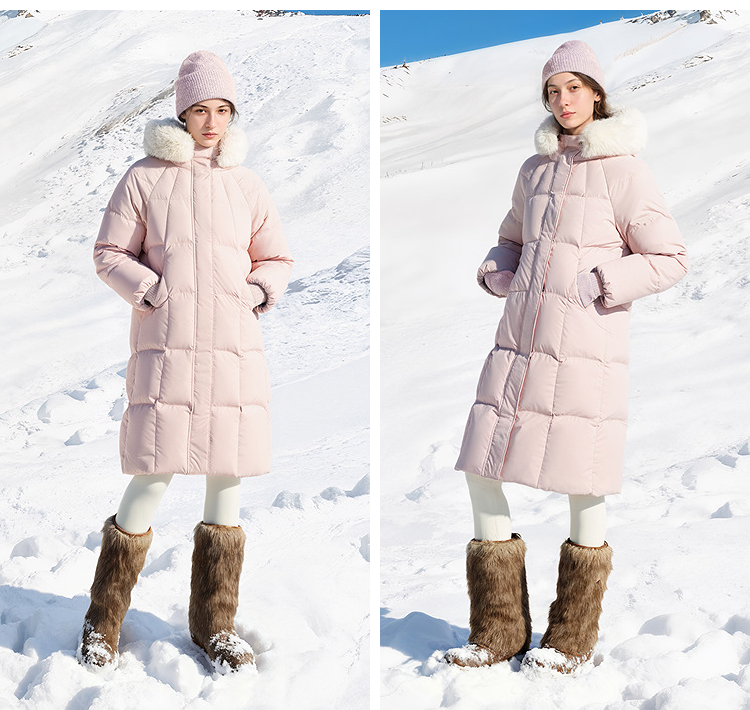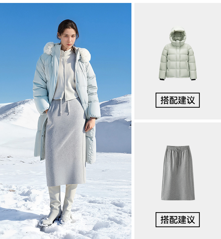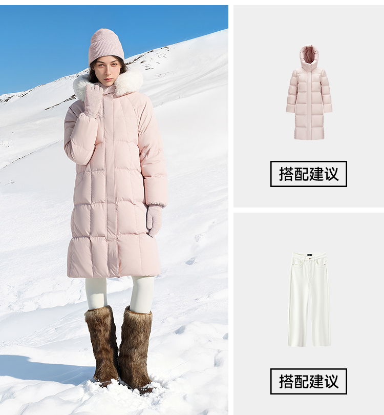 森马长款羽绒服90绒子可拆卸毛领连帽分割插肩袖2025新款女冬外套