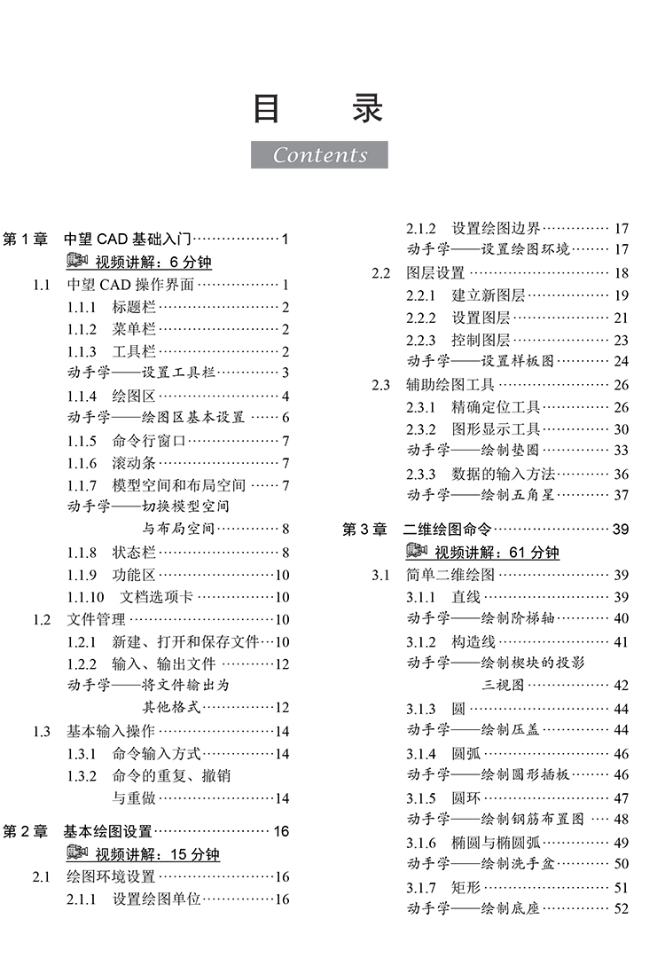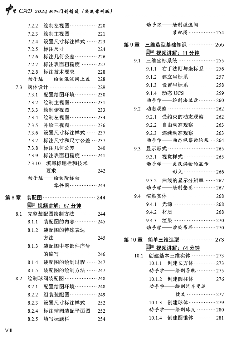 令、二维图形编辑、尺寸标注、表格和图块、零件图、装配图、三维造型基础知识、简单三维造型、复杂三维造型、