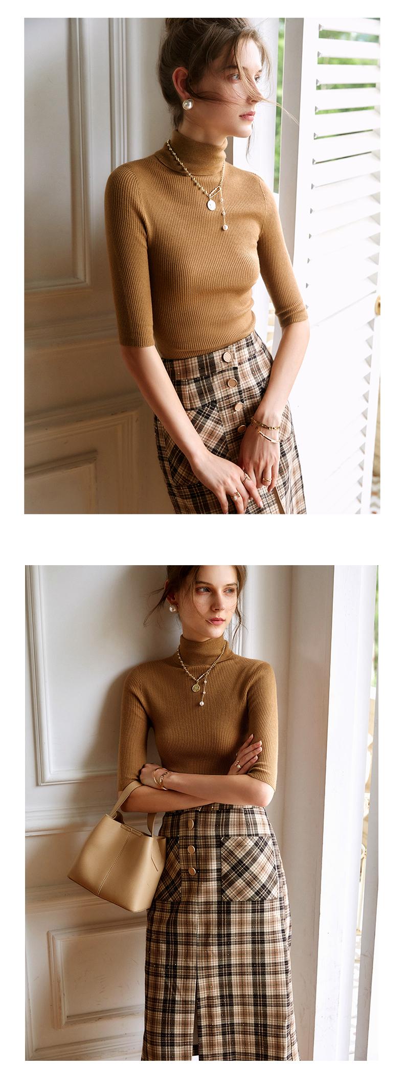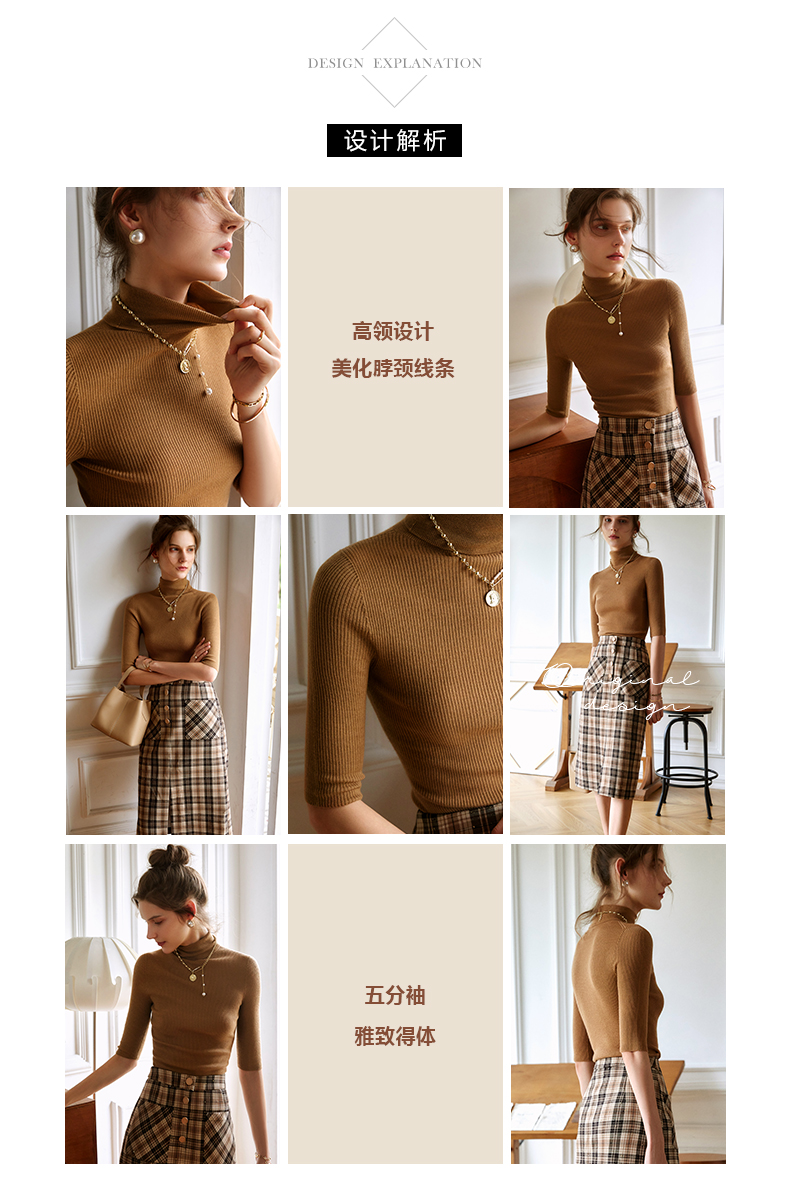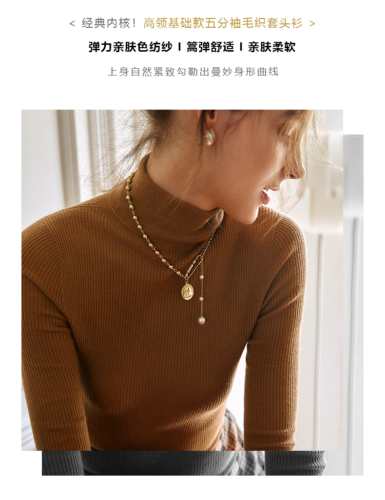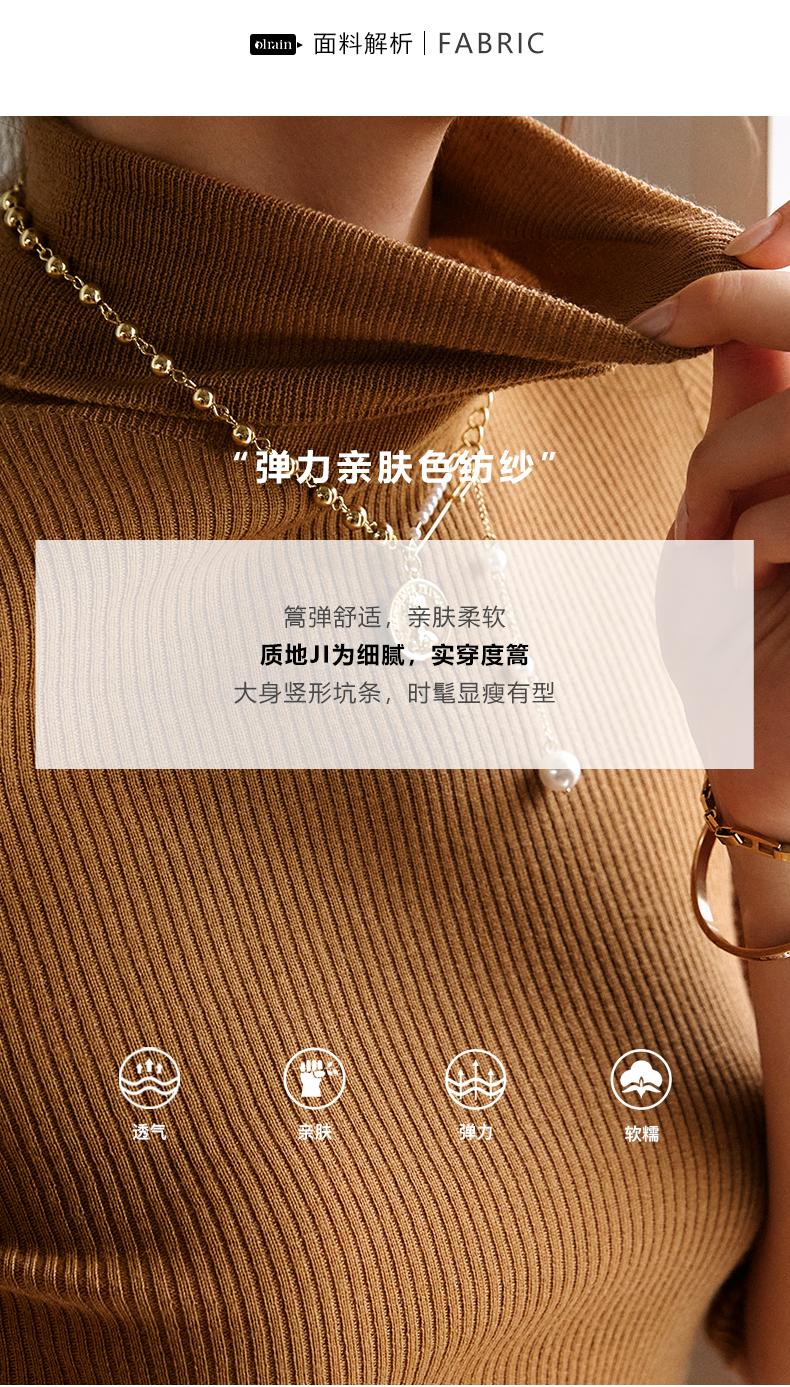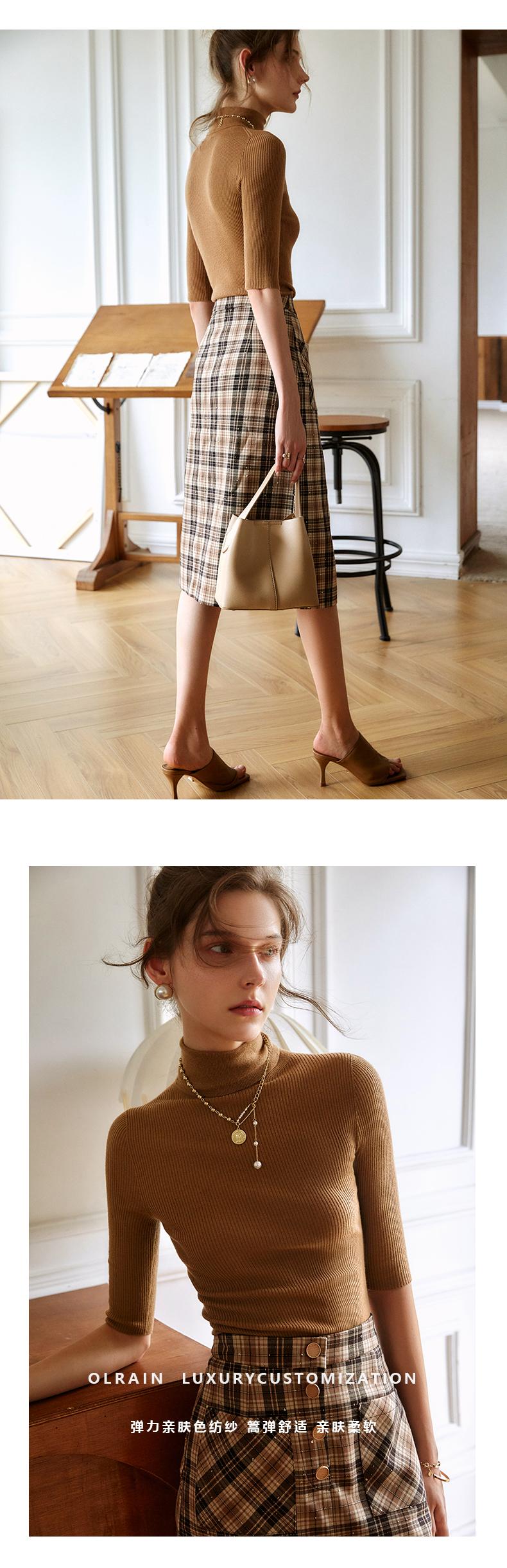 欧芮儿针织衫女2021新款纯色薄款半高领中袖修身显瘦打底上衣