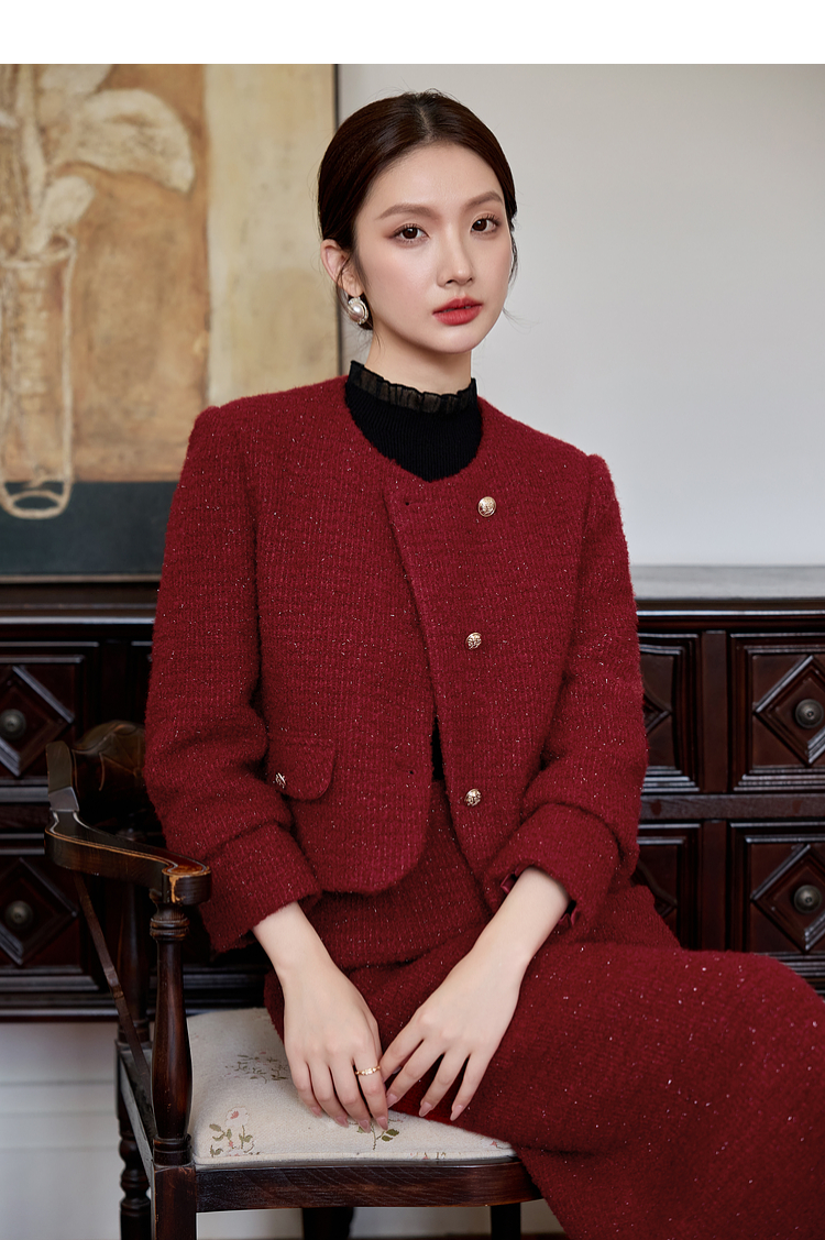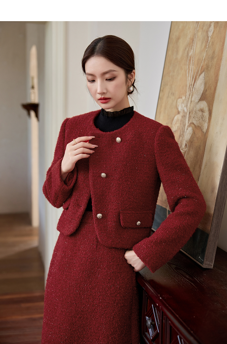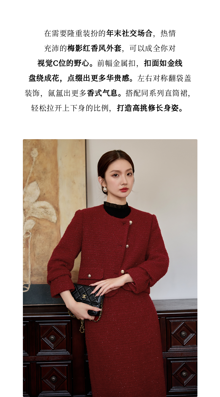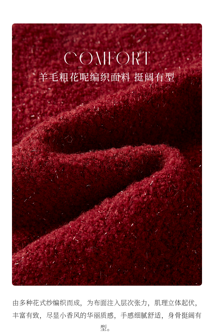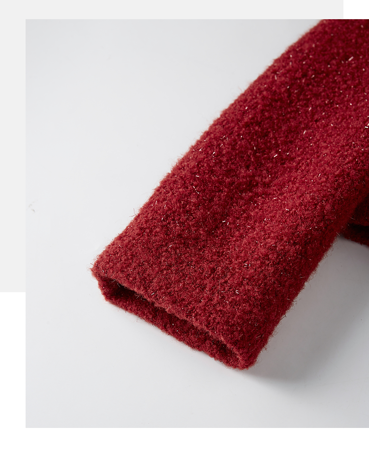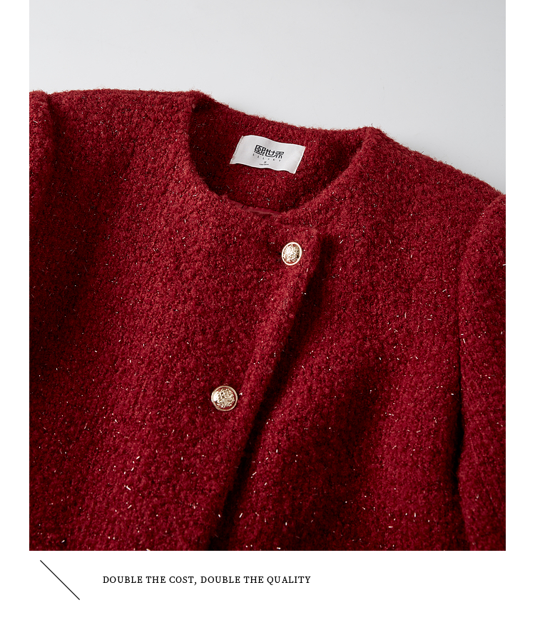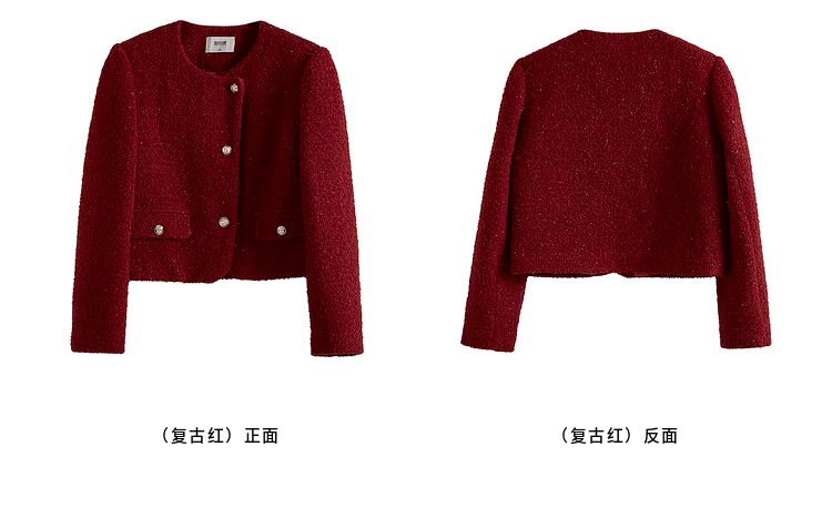 【年货节】熙世界小香风编织粗花呢羊毛短外套小个子红色开衫上衣2025冬装