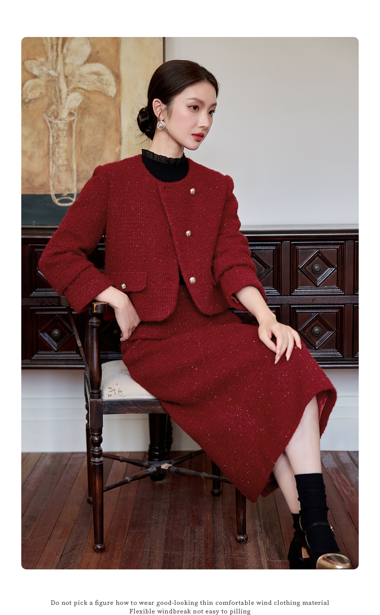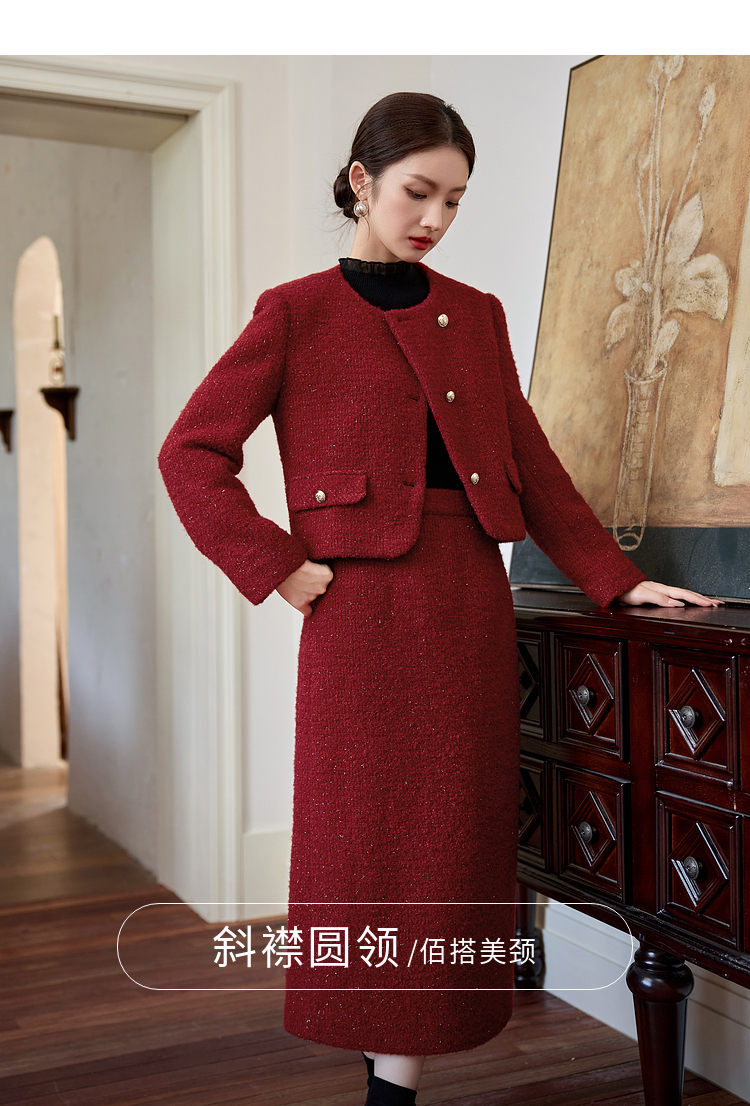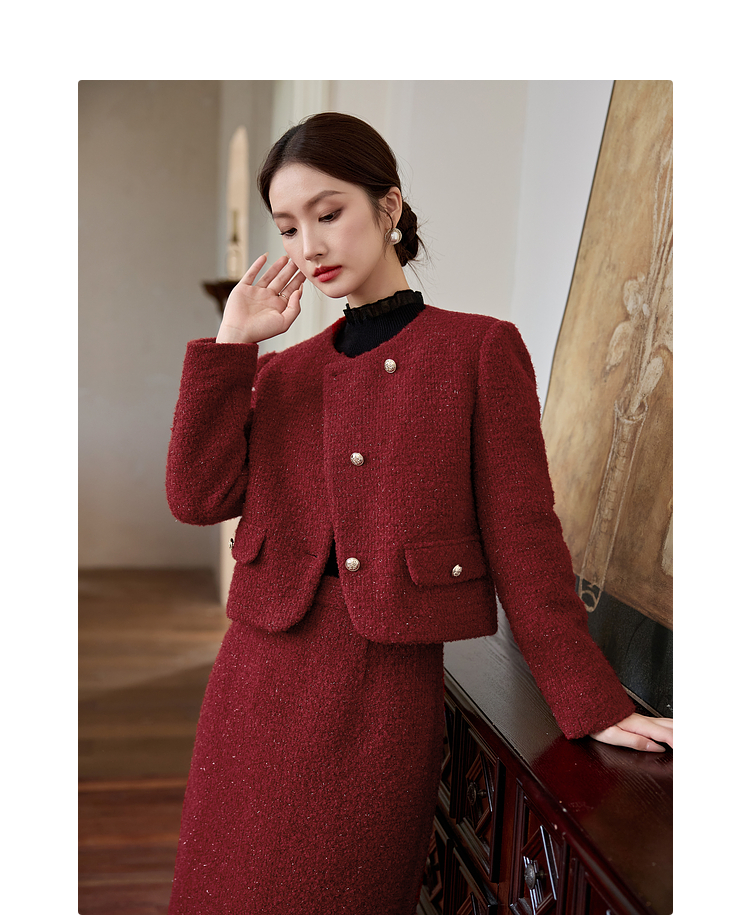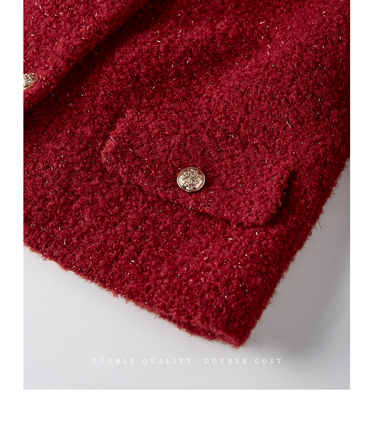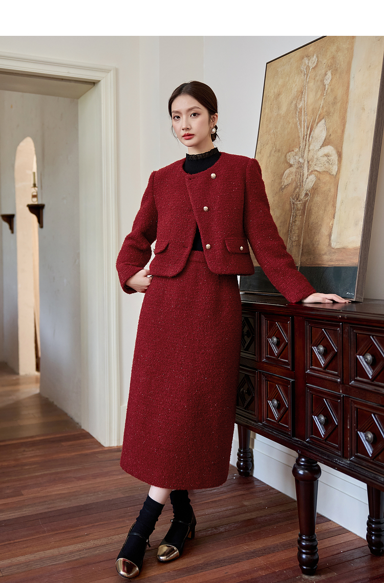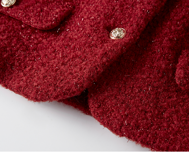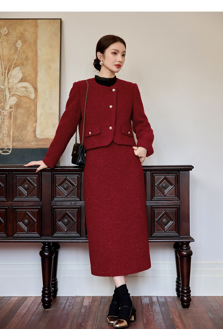 【年货节】熙世界小香风编织粗花呢羊毛短外套小个子红色开衫上衣2025冬装
