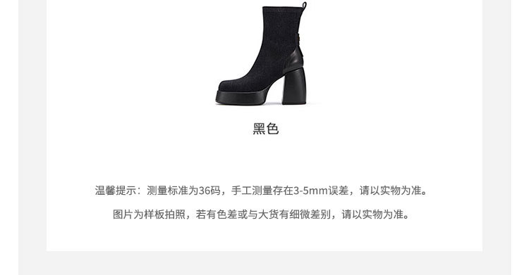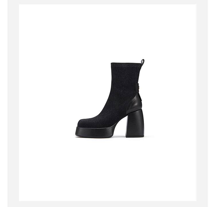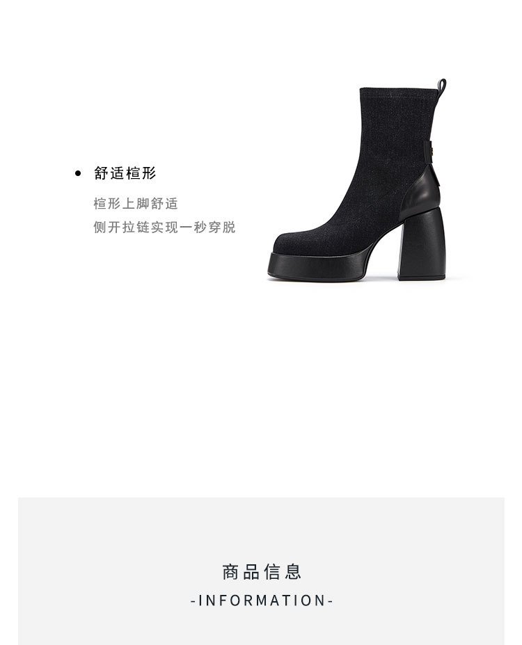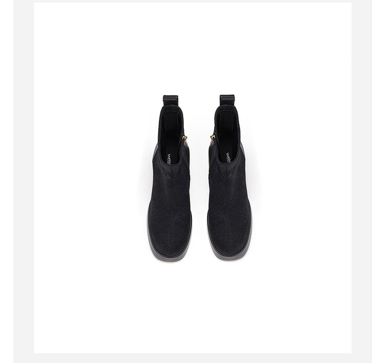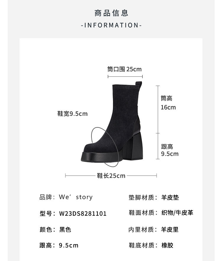 westory2023年秋冬新款黑色真皮粗高跟时装百搭短靴马丁靴女W23DS82811