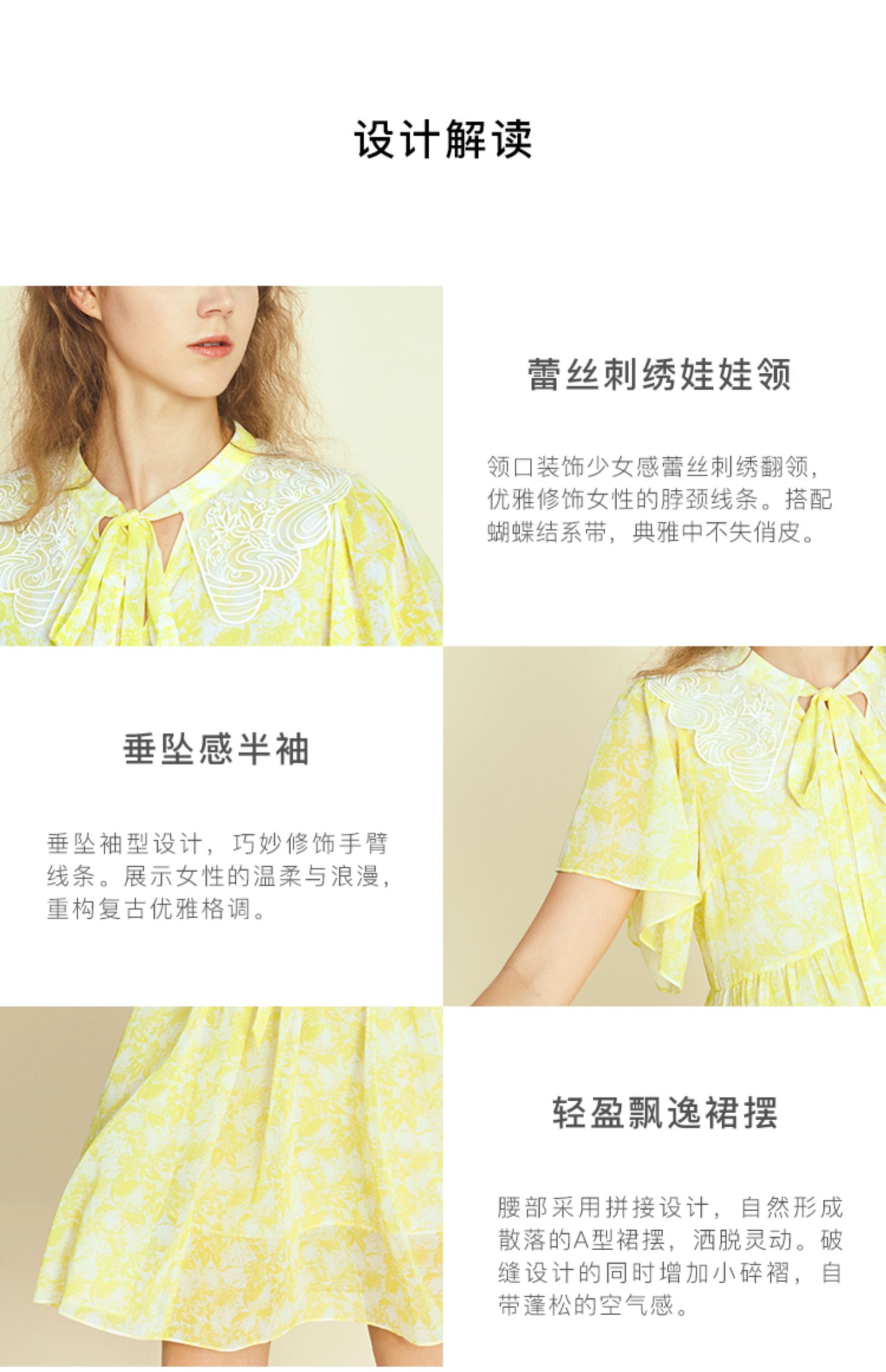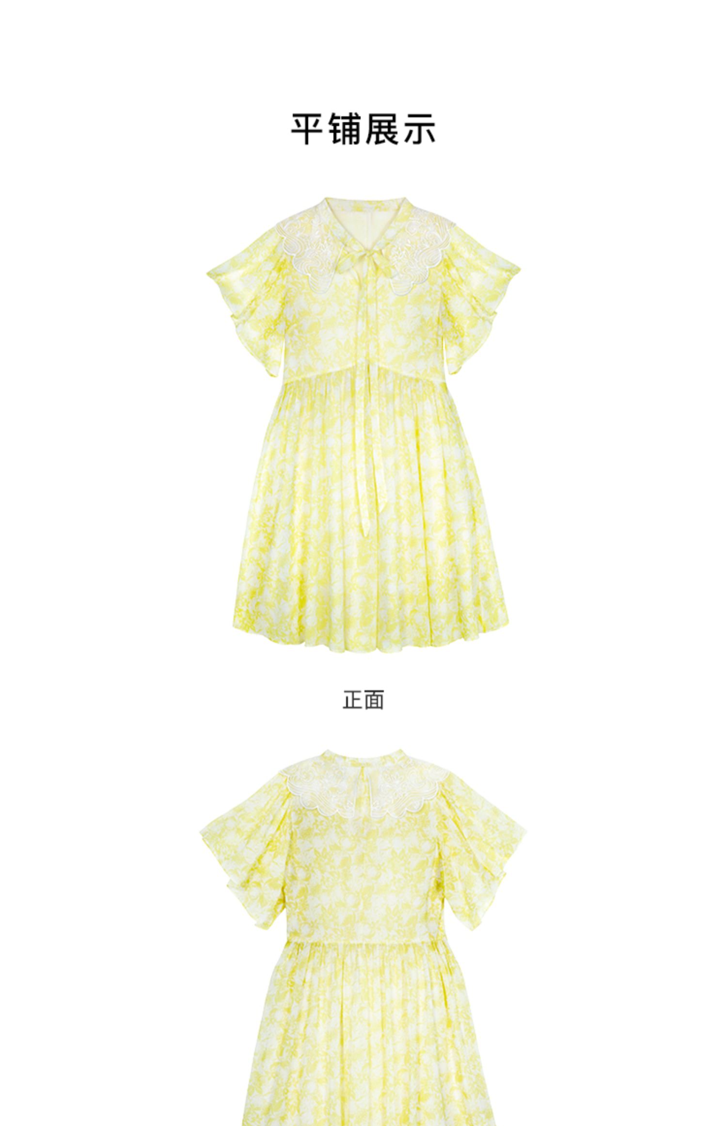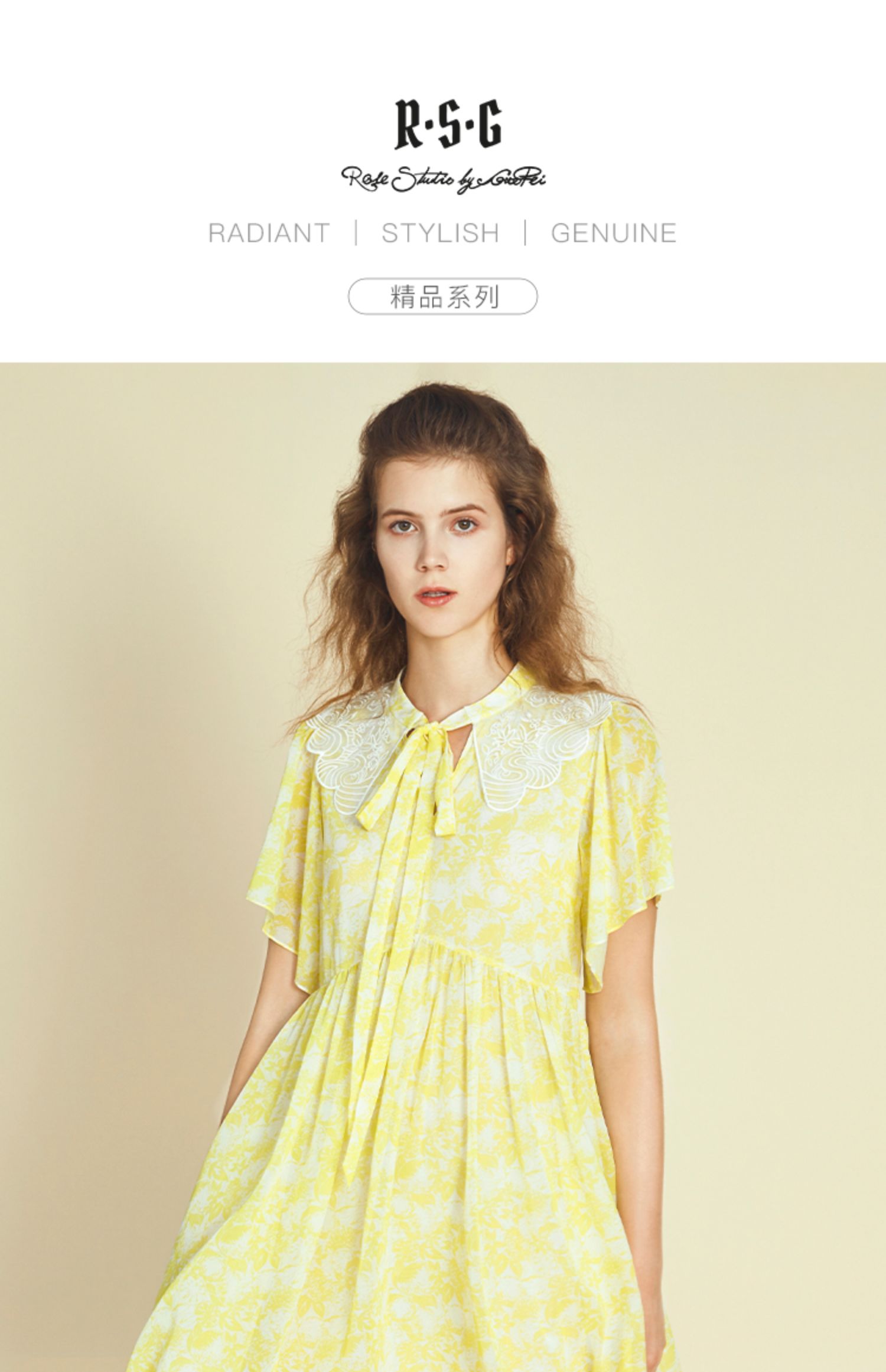 RSG郭培成衣品牌原创设计蕾丝印花女士连衣裙短袖黄色夏季