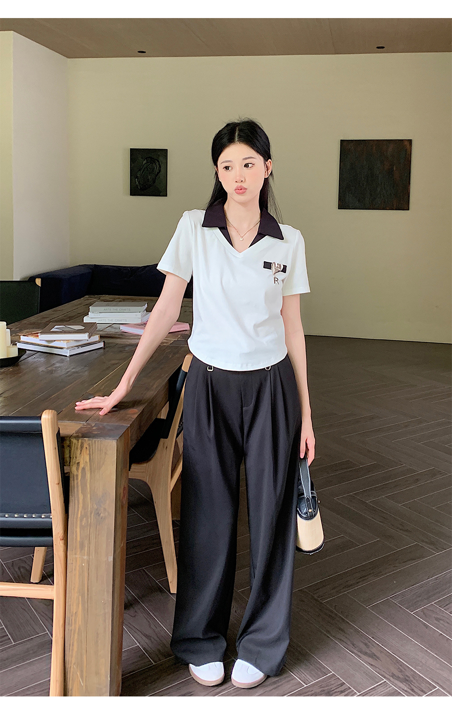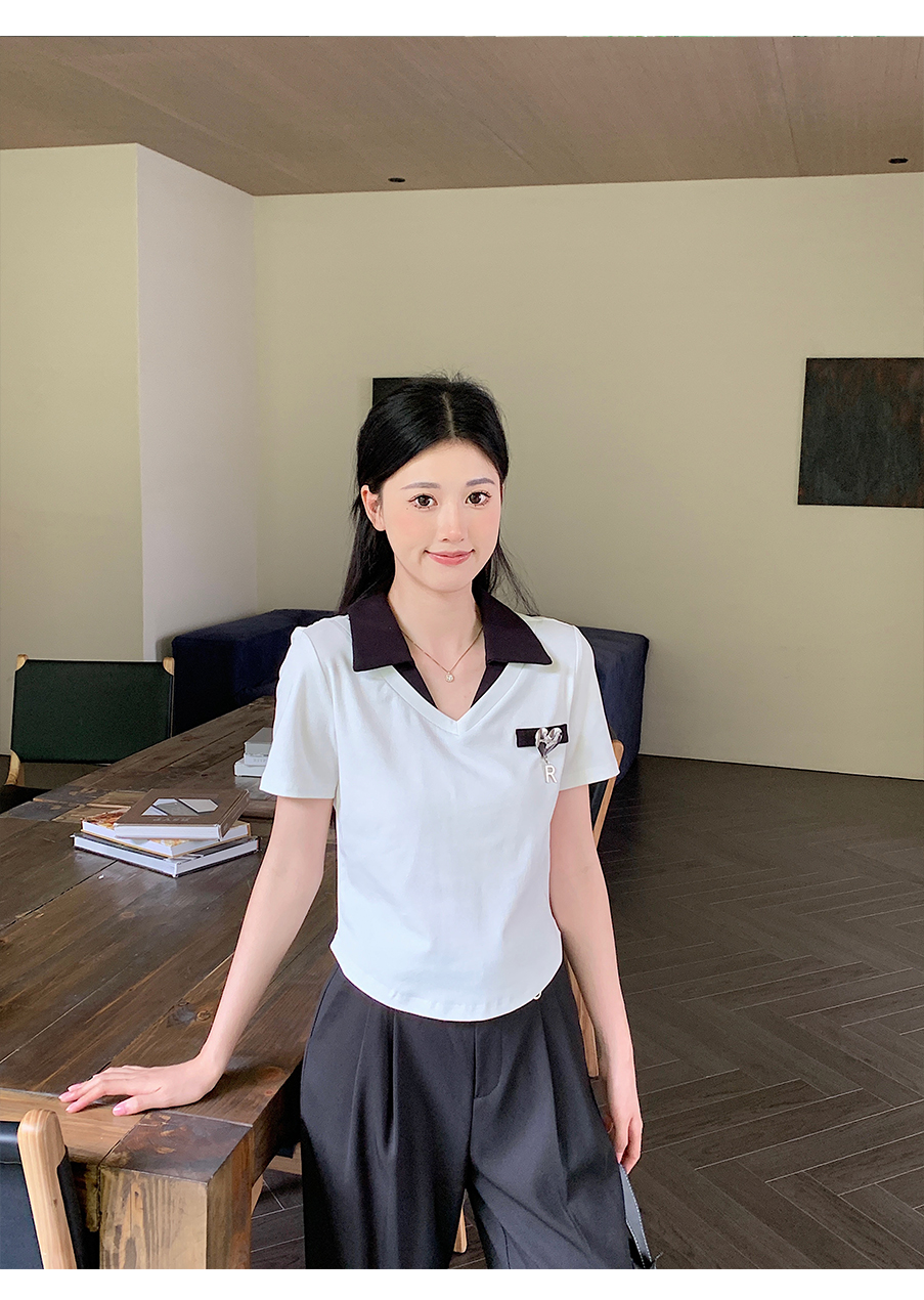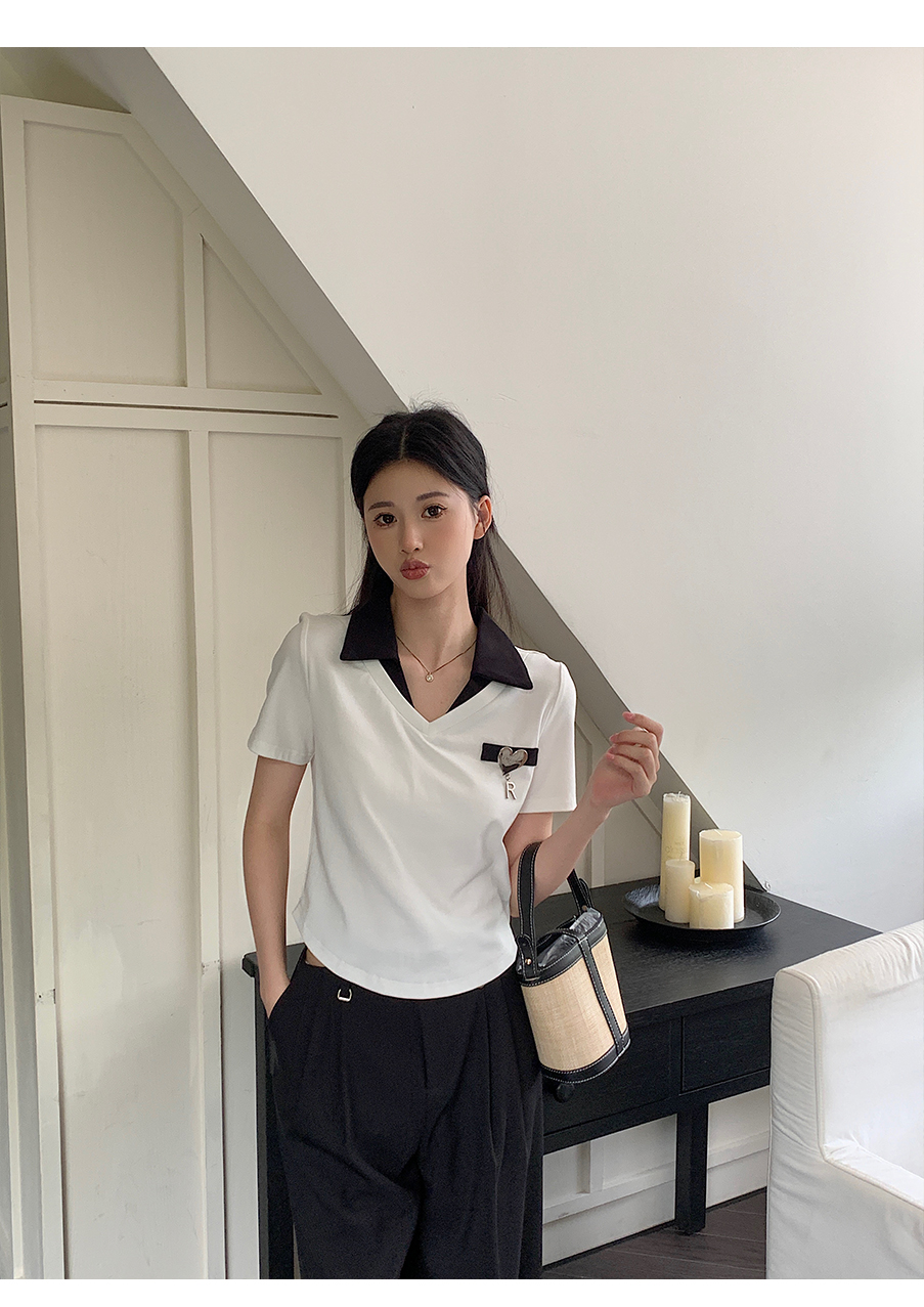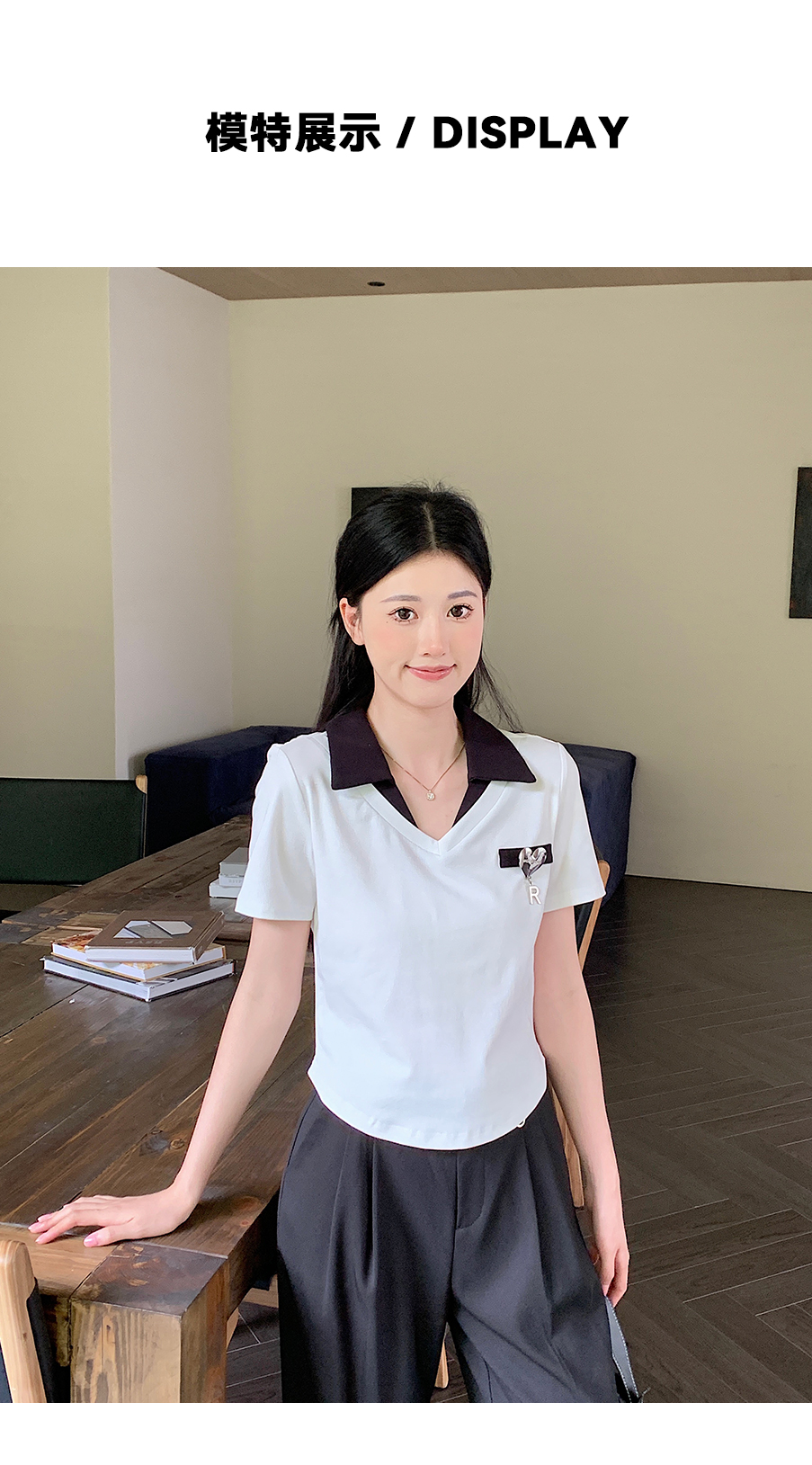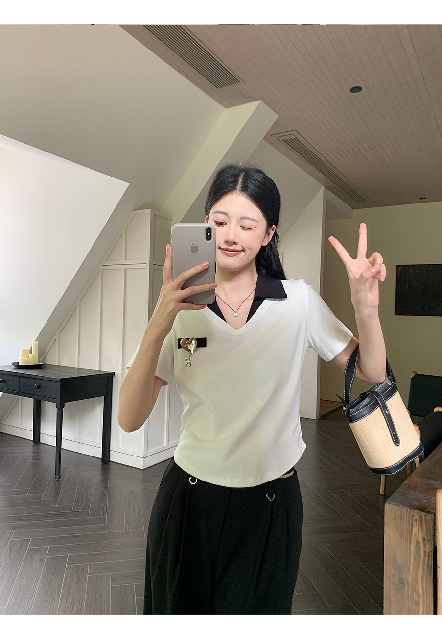 P&X设计师女装2023夏季新款 针织短款T恤短袖v领 823202885 白色