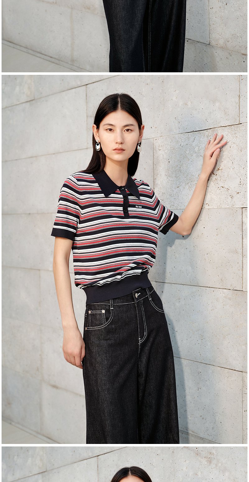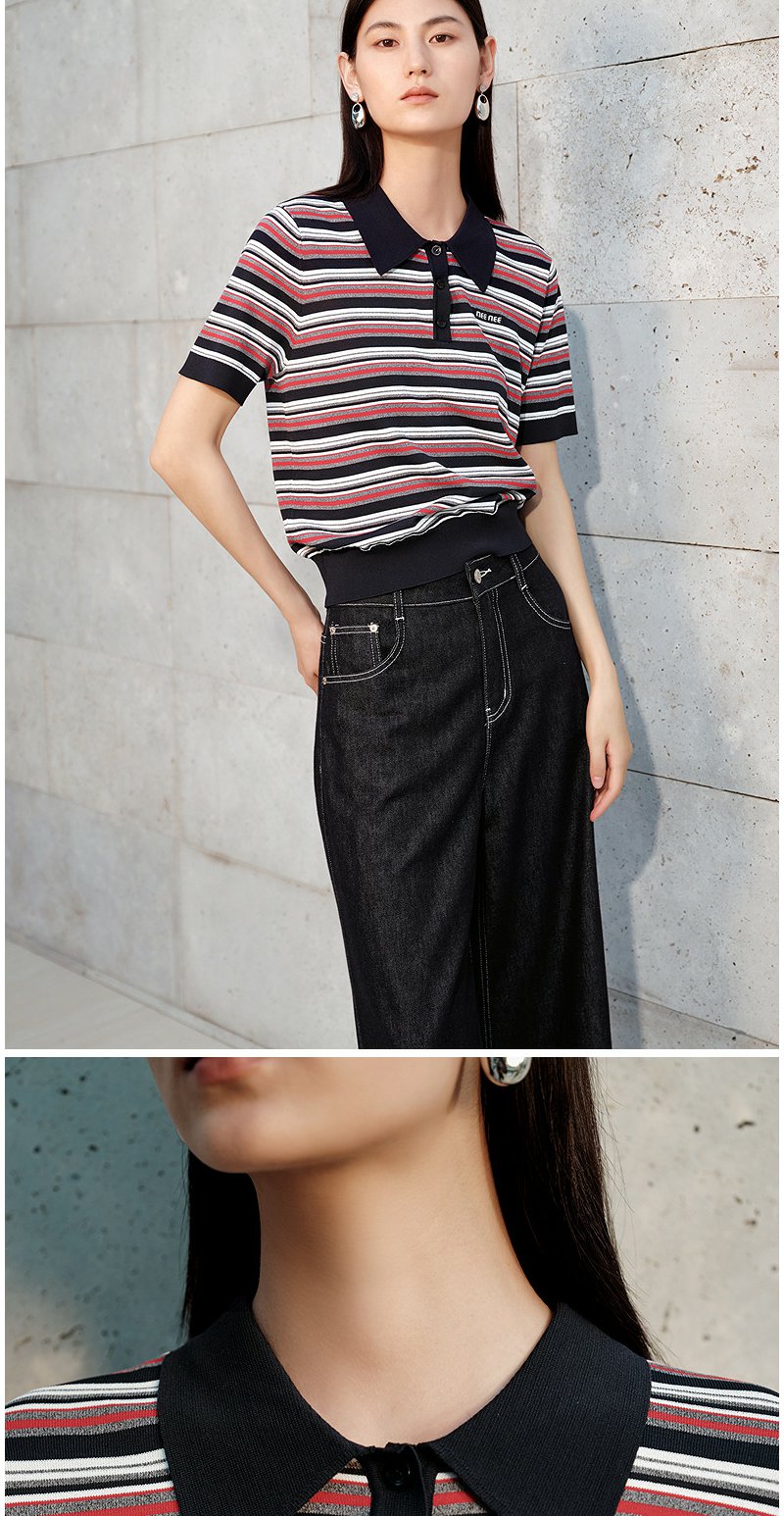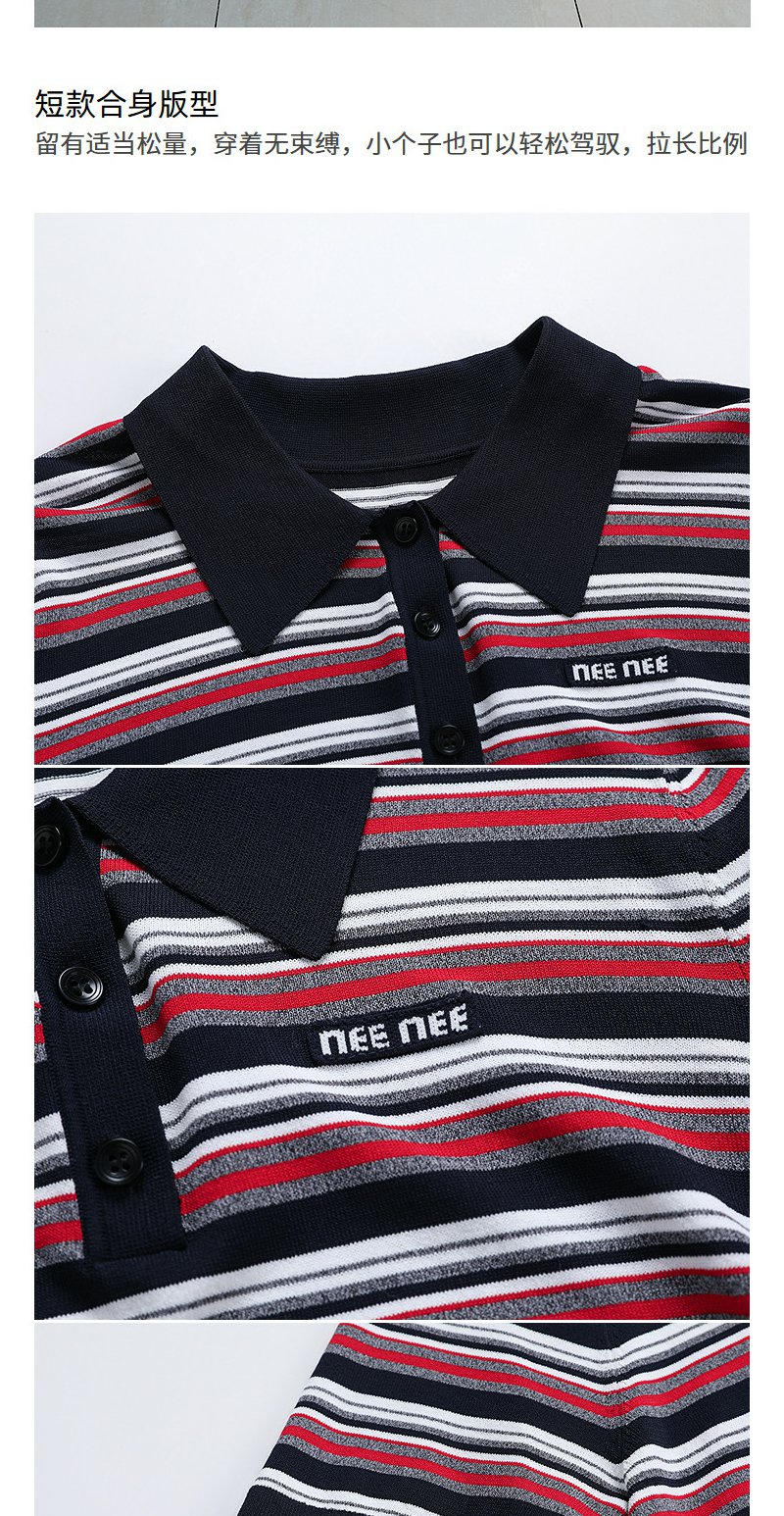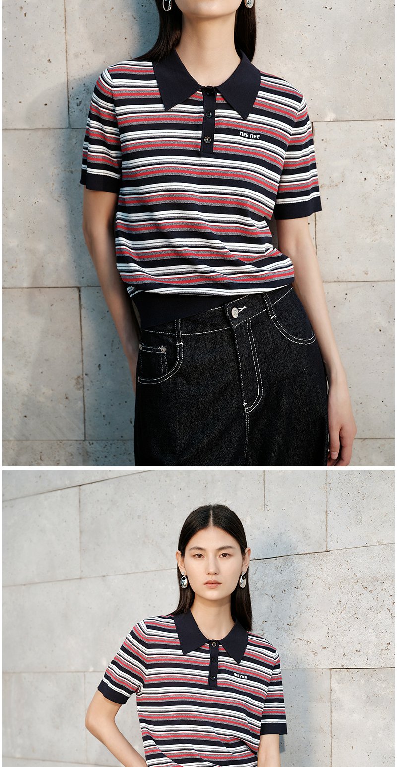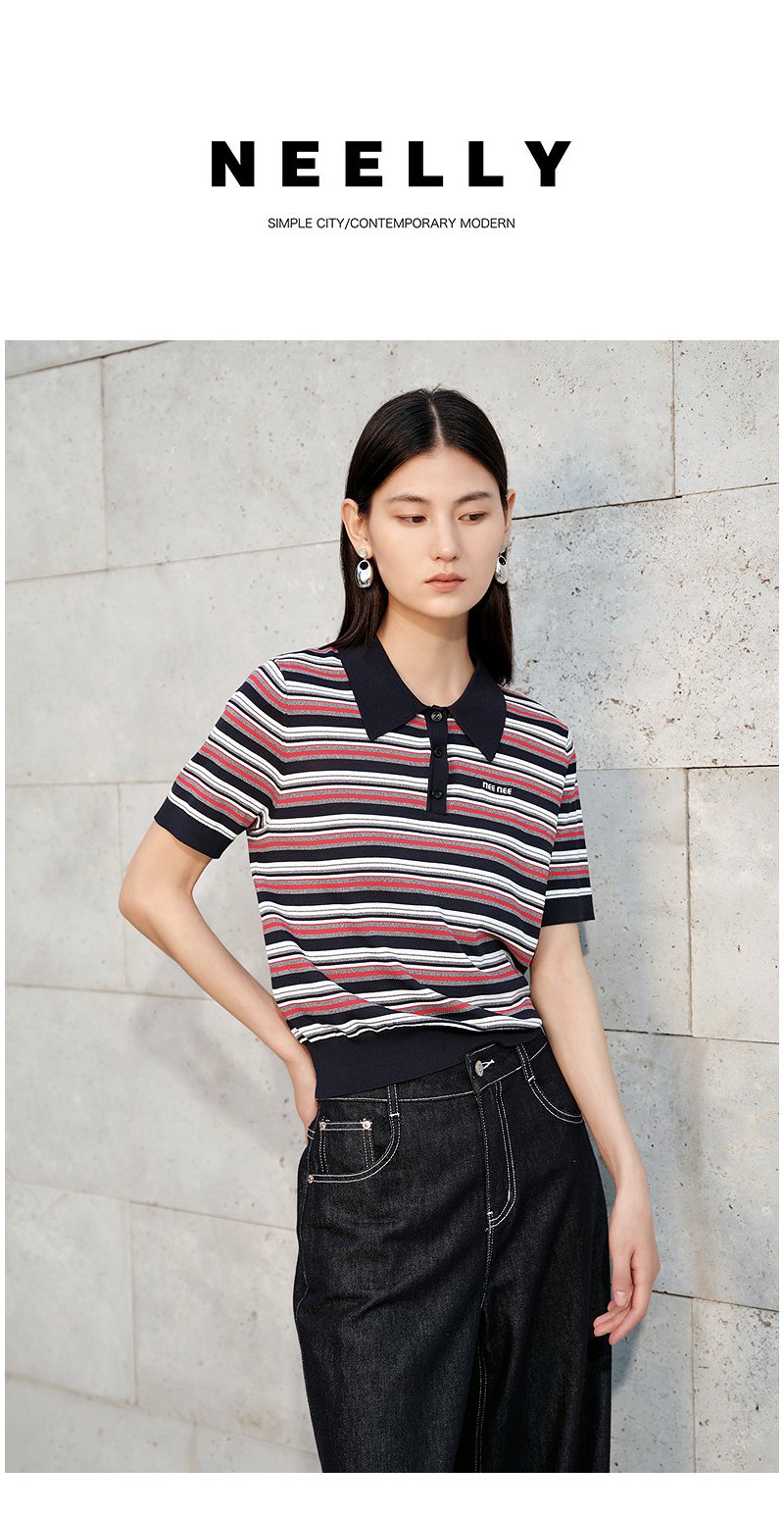 NEELLY纳俪商场同款夏季新款POLO领短袖针织衫女条纹撞色舒适上衣N26054A04504