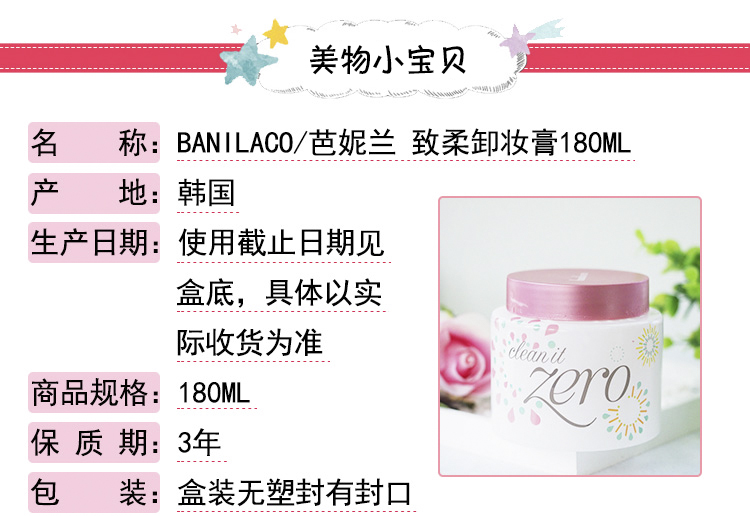 韩国 限量版Banilaco/芭妮兰 zero卸妆膏 180ml 温和深层脸部清洁