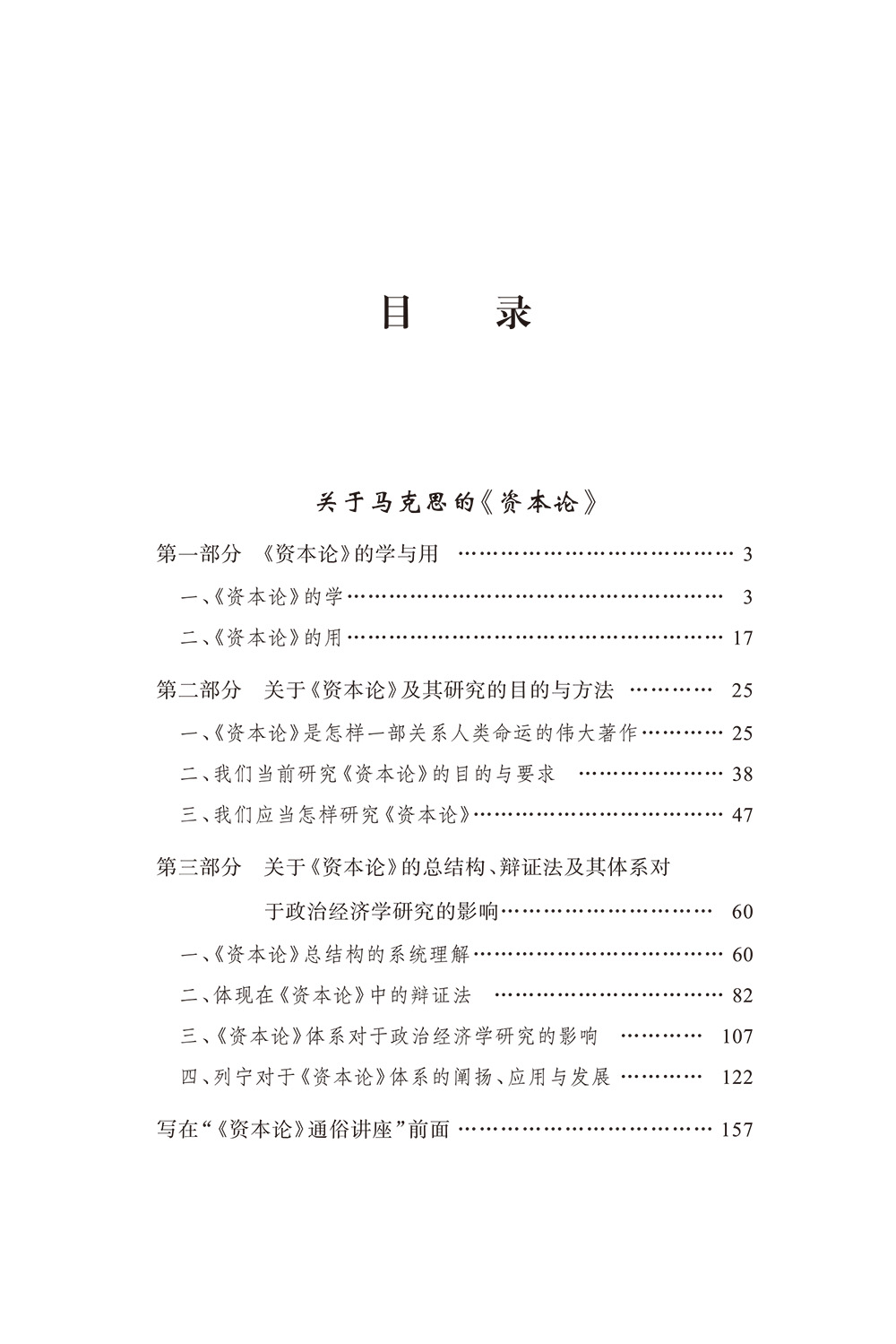 《关于马克思的<资本论>》分为四部分,第一部分“《资本论》的学与用”,第二部分“关于《资本论》及其研究的目的与方法”,第三部分“关于《资本论》的总结构、辩证法及其体系对于政治经济学研究的影响”,第四部分“写在‘《资本论》通俗讲座’前面”。