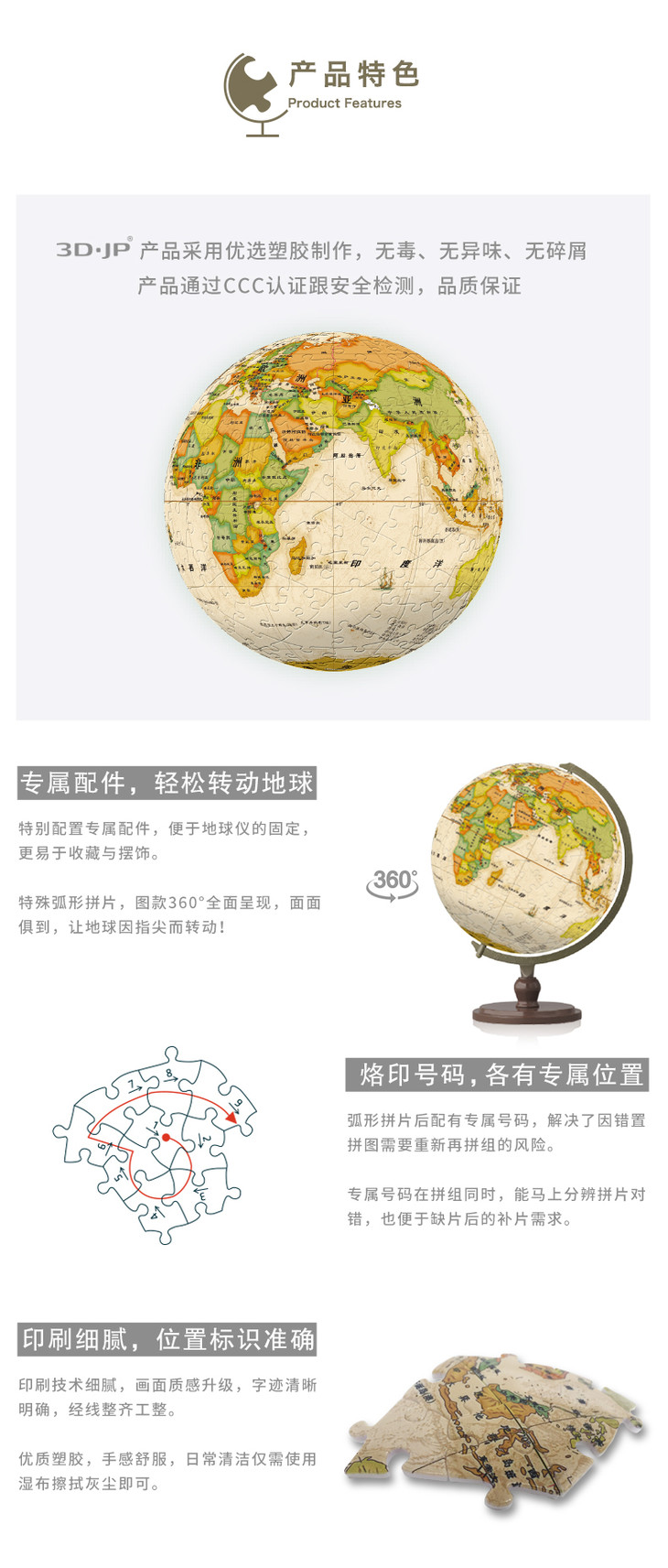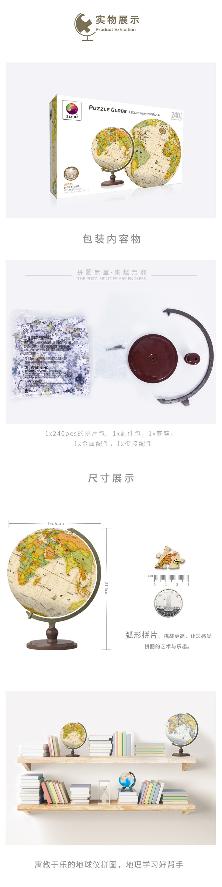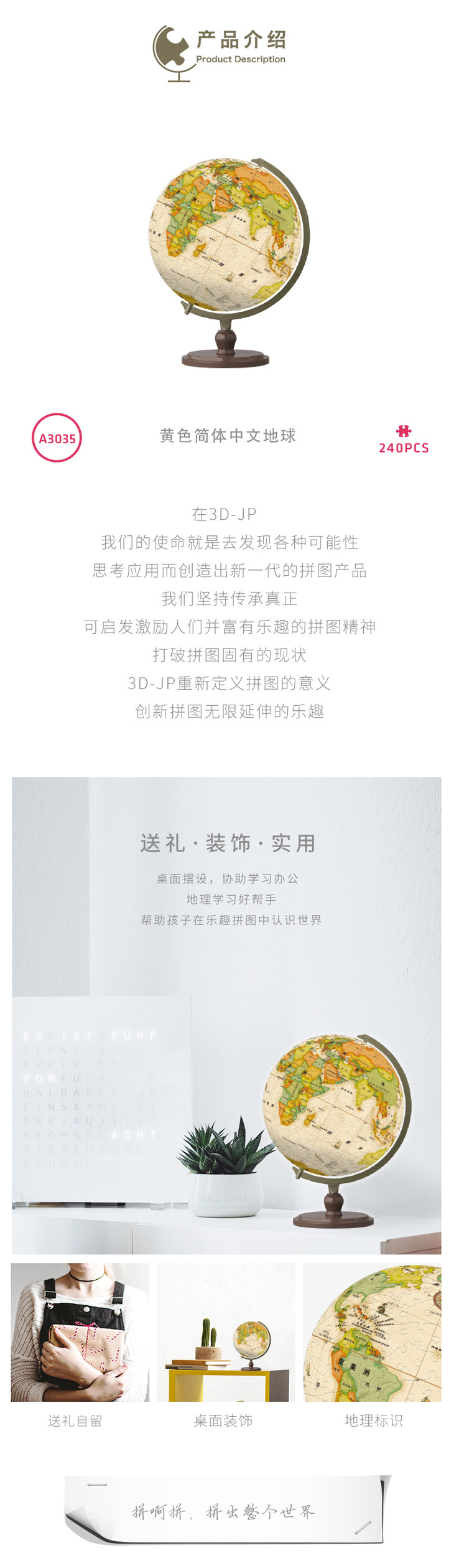 【半山书局】B14F丨3D-JP黄色中文地球仪拼图240片