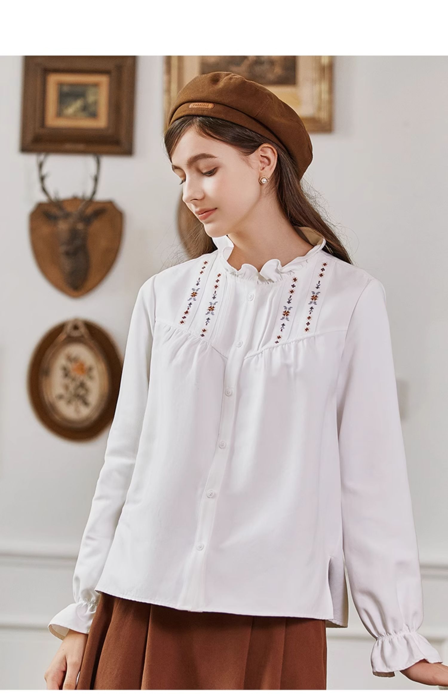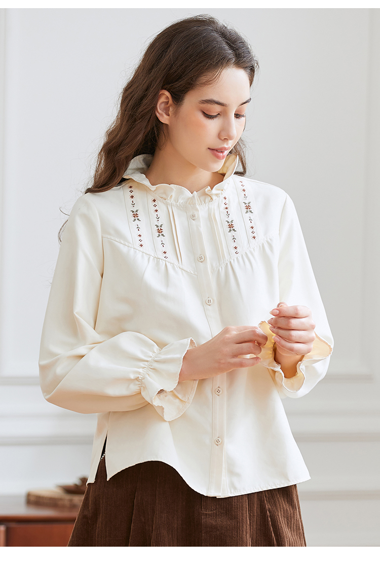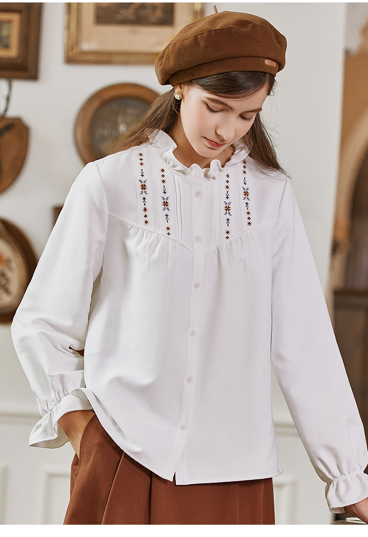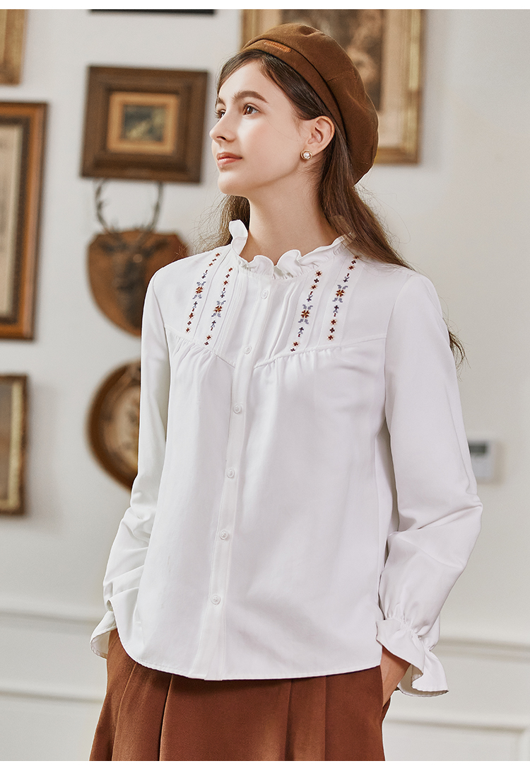 Famecoco范可儿荷叶边立领绣花衬衣减龄冬FAB8BH005