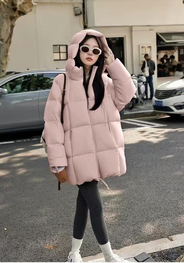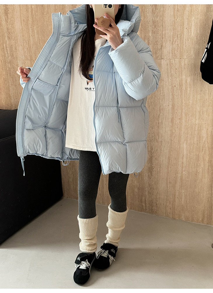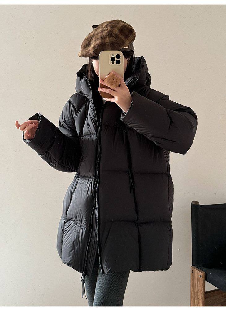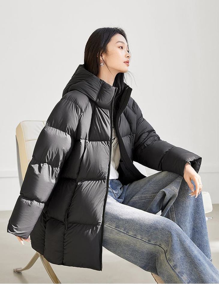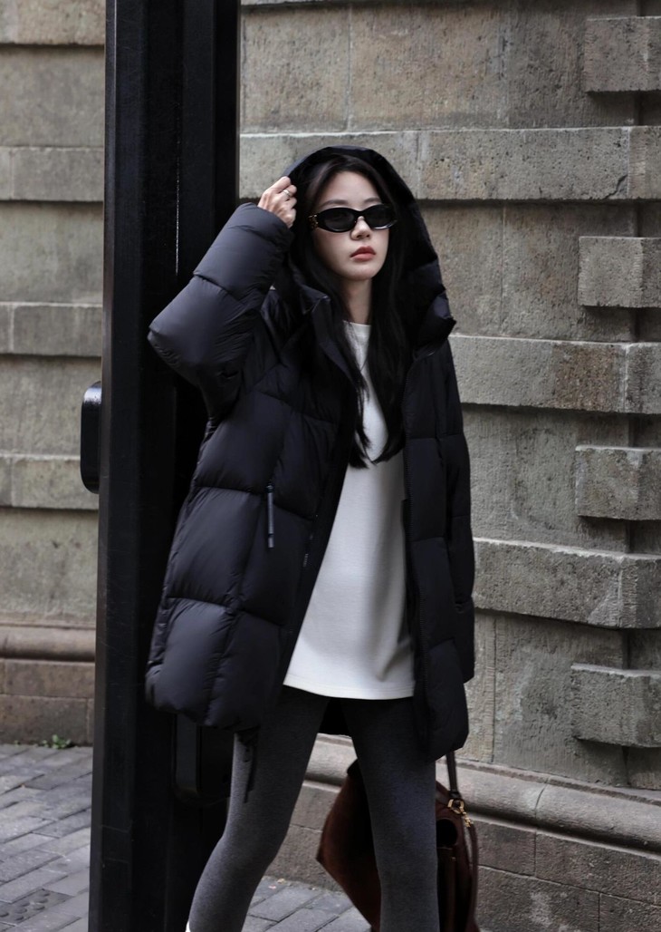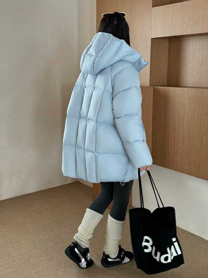 衣身整体做了方格的绗线工艺 均匀分布羽绒,打破单调,自带高级感 穿着更有立体有层次感! 一体式连帽设计, 为头部颈部提供温暖呵护,防风更保暖 立裁式宽松版型+落肩袖 藏肉显瘦,慵懒随性感满满 下摆采用防风猪鼻扣可收束设计 有效防止冷风倒灌!!!