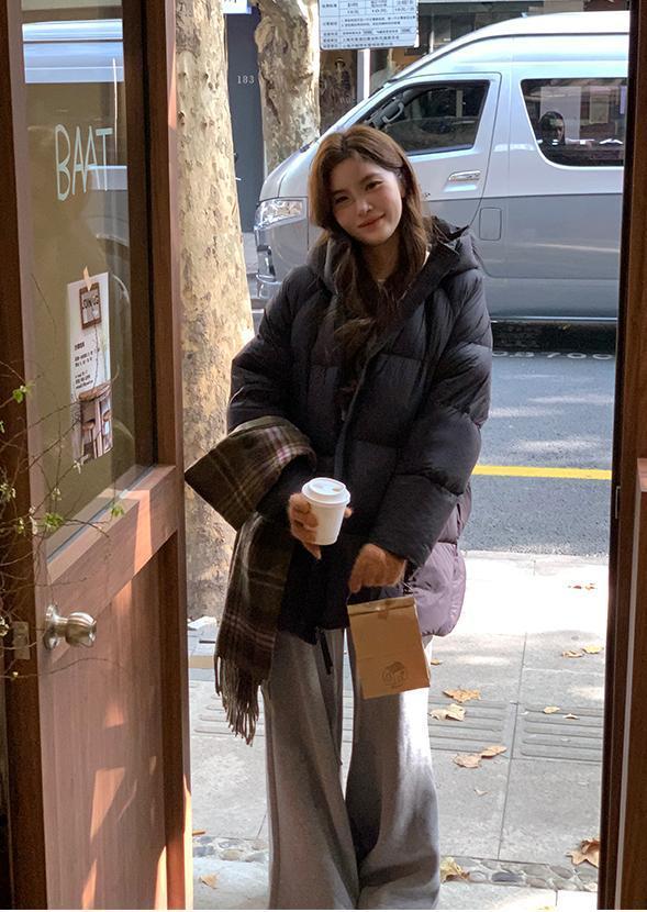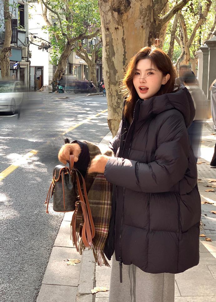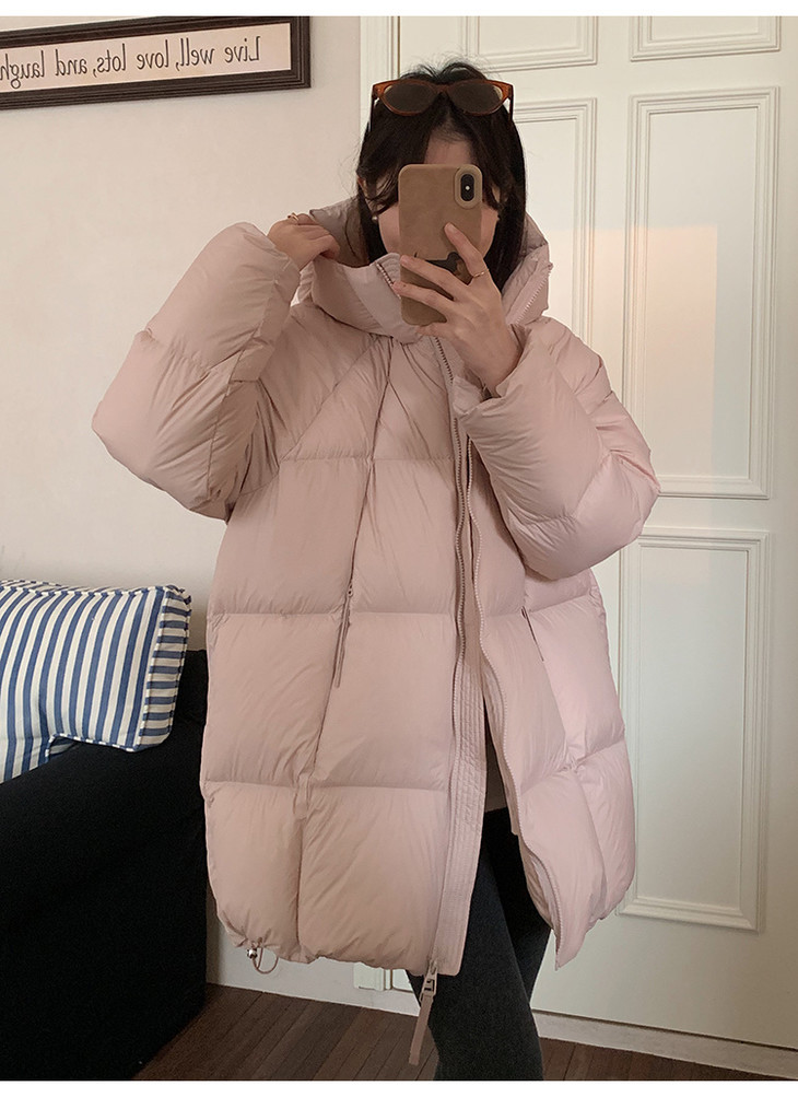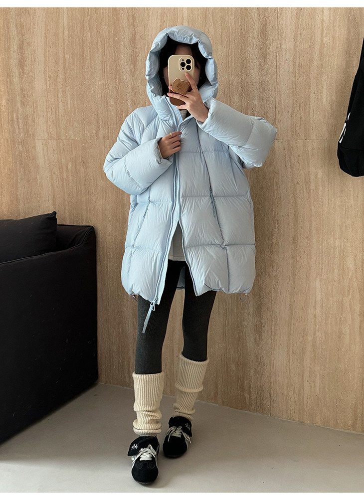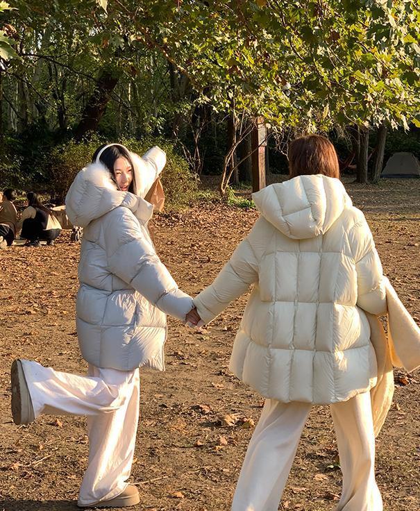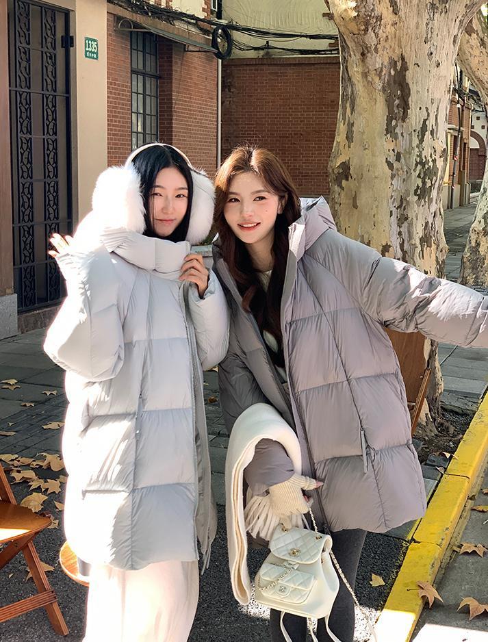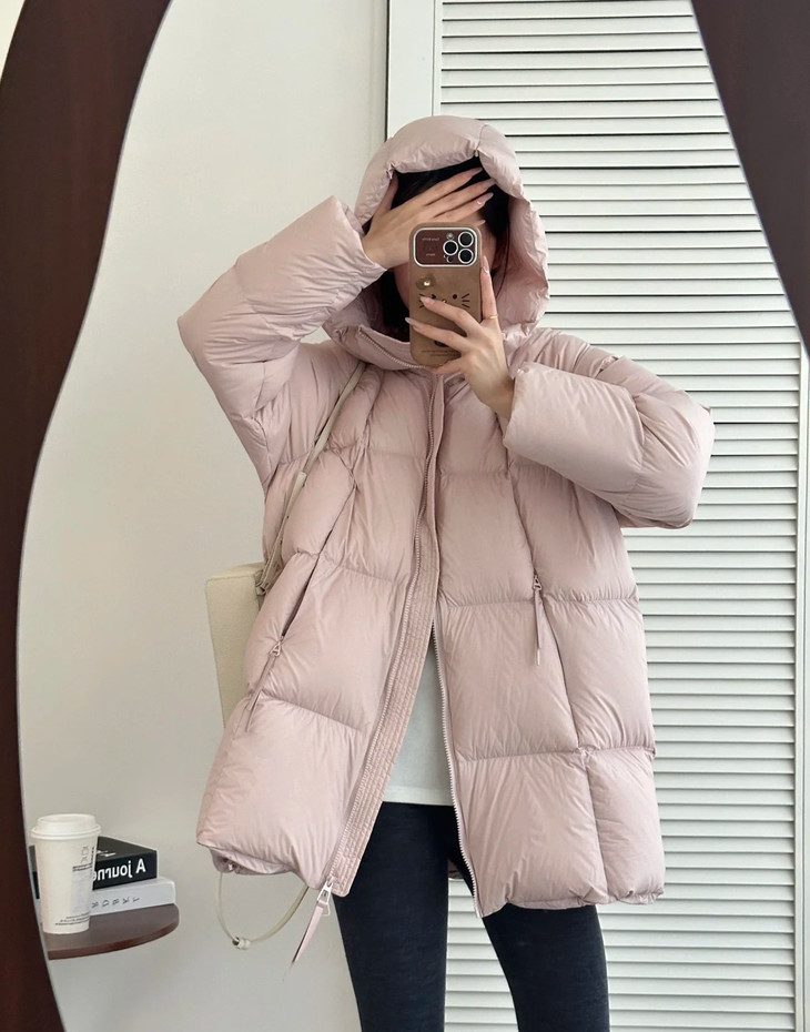衣身整体做了方格的绗线工艺 均匀分布羽绒,打破单调,自带高级感 穿着更有立体有层次感! 一体式连帽设计, 为头部颈部提供温暖呵护,防风更保暖 立裁式宽松版型+落肩袖 藏肉显瘦,慵懒随性感满满 下摆采用防风猪鼻扣可收束设计 有效防止冷风倒灌!!!