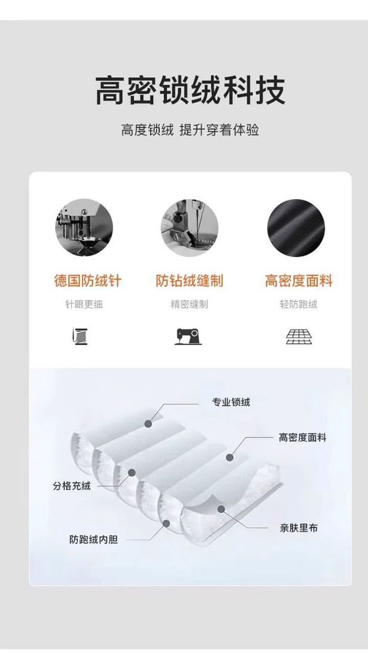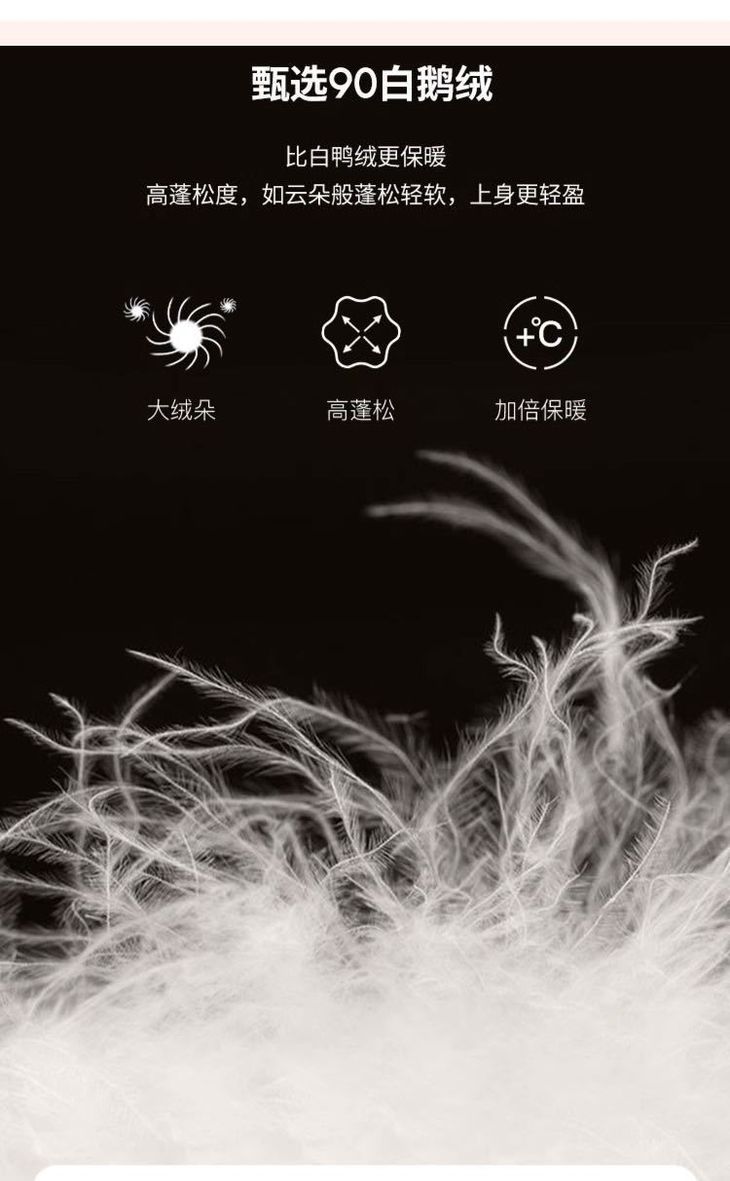 时刻带来安心温暖体验 填充新国标90白鹅绒 蓬松饱满按压回弹速度快,储温能力更强! 220G+高克充绒 充足的绒量带来云朵般的绵软蓬松感 长效隔寒锁温,蓄热保暖性MAX!!