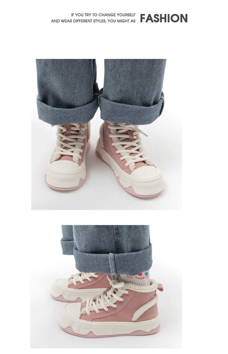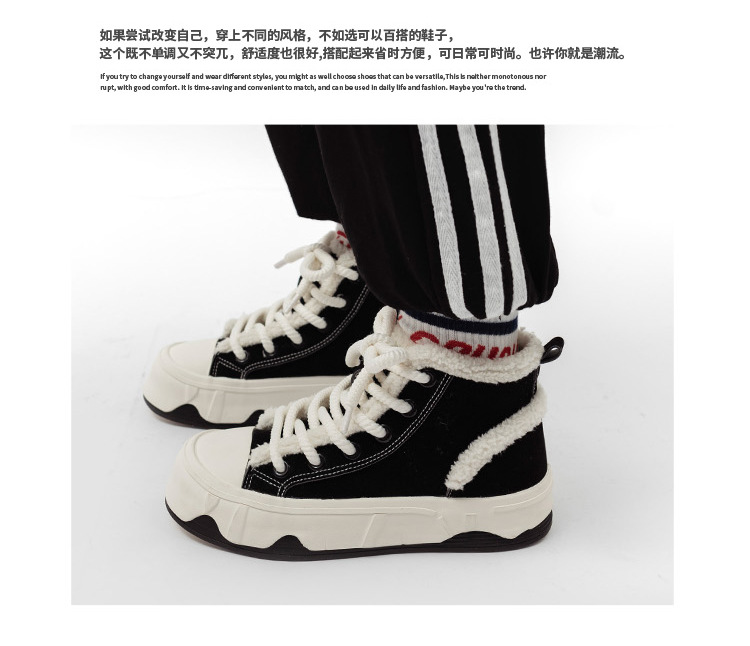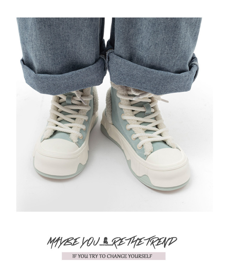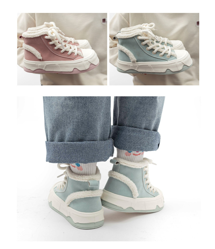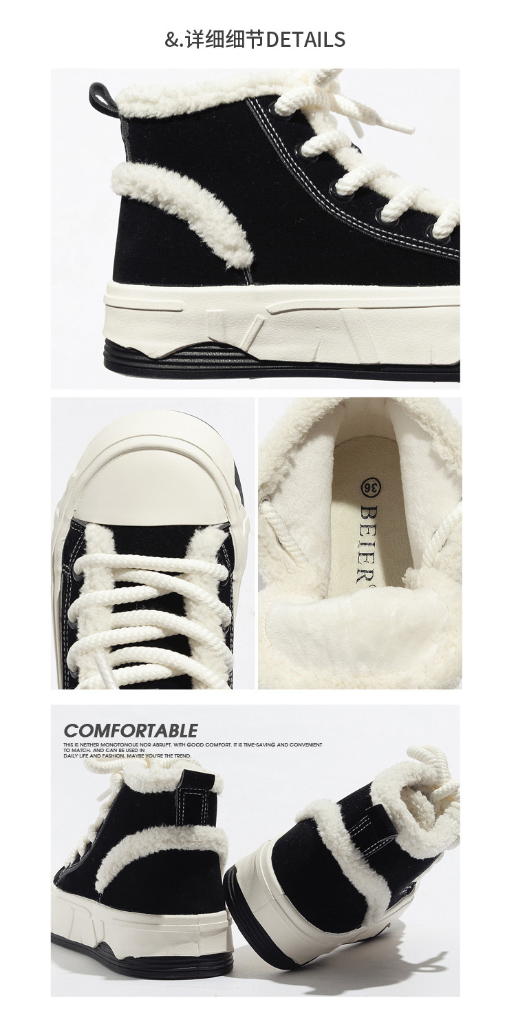 「三款配色!皮面加绒」高帮女鞋2023秋冬新款复古厚底板鞋子韩版保暖二棉鞋