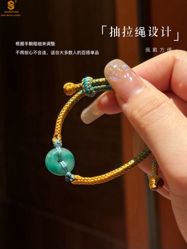 【香港周六福黄金钻石首饰】A级冰绿非洲翠平安扣古法手编手链+高定礼盒 商品图3