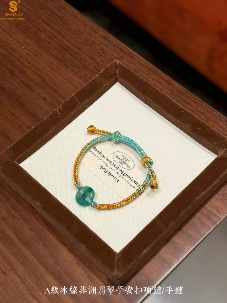 【香港周六福黄金钻石首饰】A级冰绿非洲翠平安扣古法手编手链+高定礼盒 商品图1