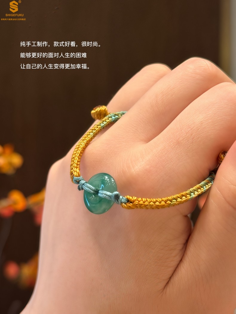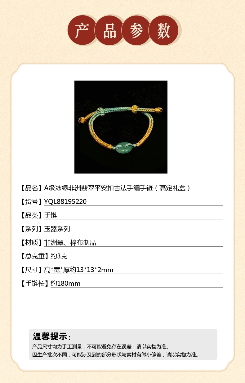 【香港周六福黄金钻石首饰】A级冰绿非洲翠平安扣古法手编手链+高定礼盒 商品图2