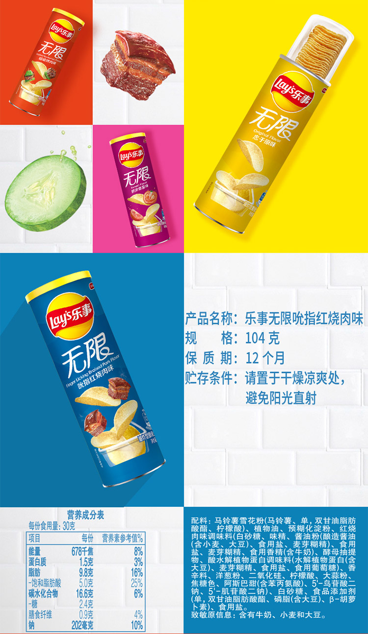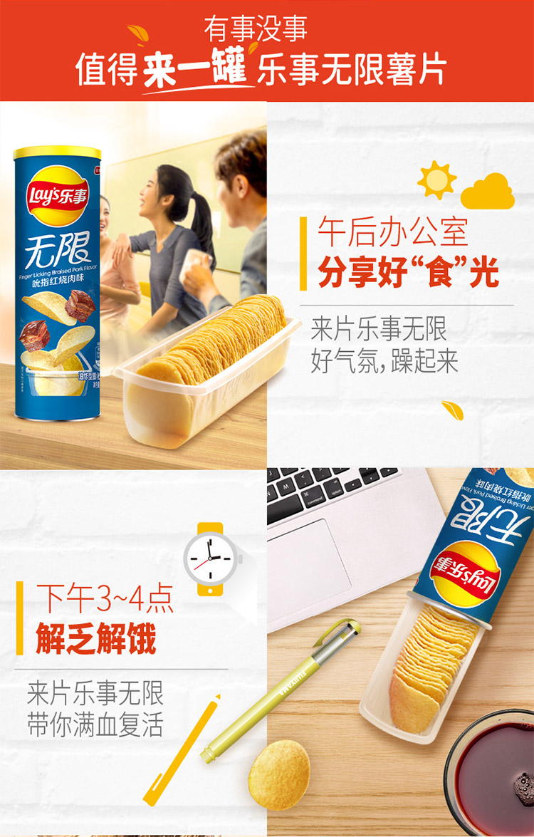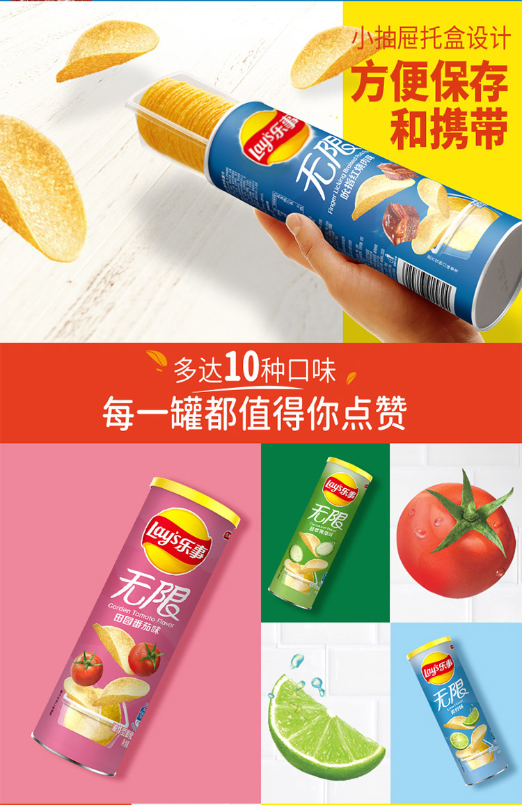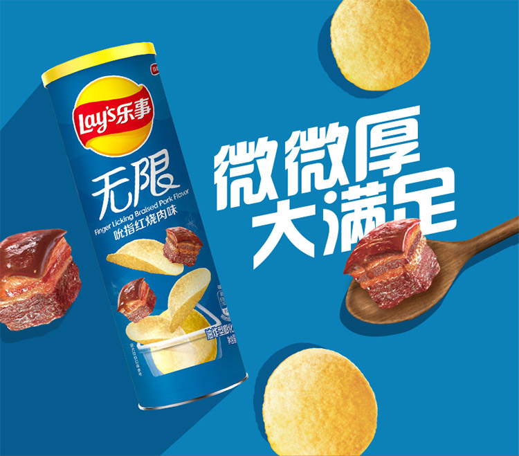 乐事Lay’s无限薯片 零食 休闲食品 吮指红烧肉味104g罐装 膨化食品
