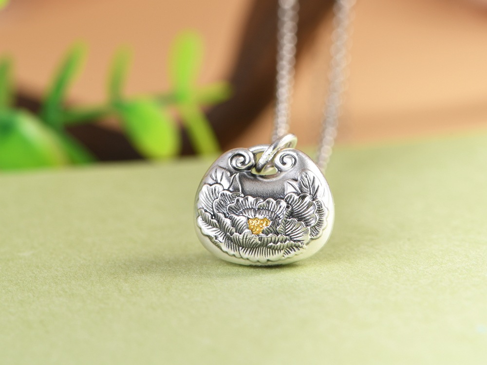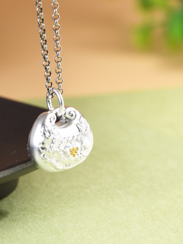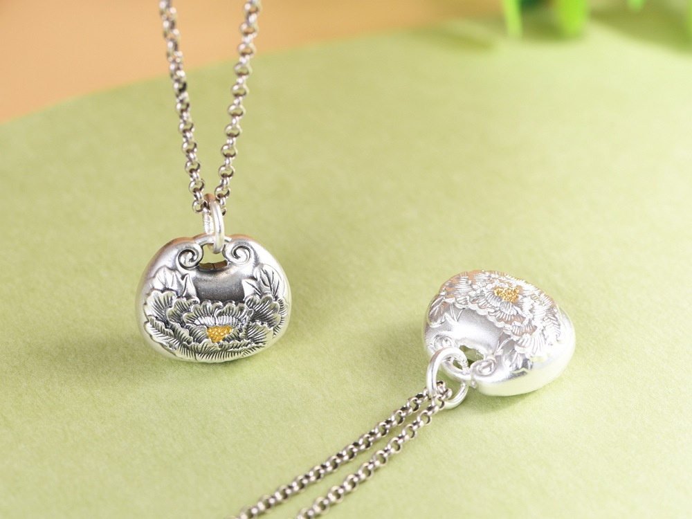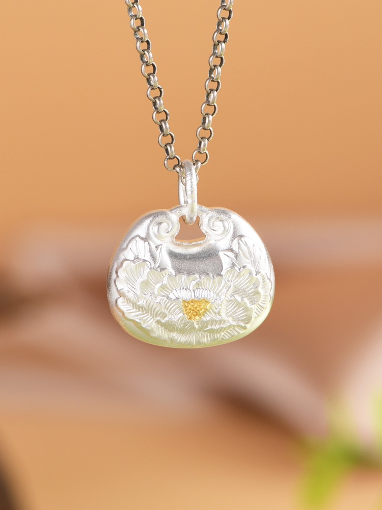 【牡丹芳辰;】足银999银锁小胖福双面牡丹项链吊坠【SCH-DIY10339-2.5】