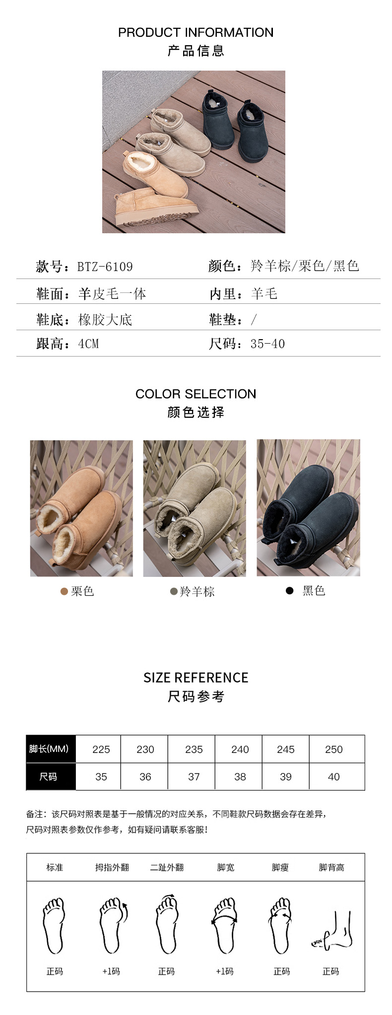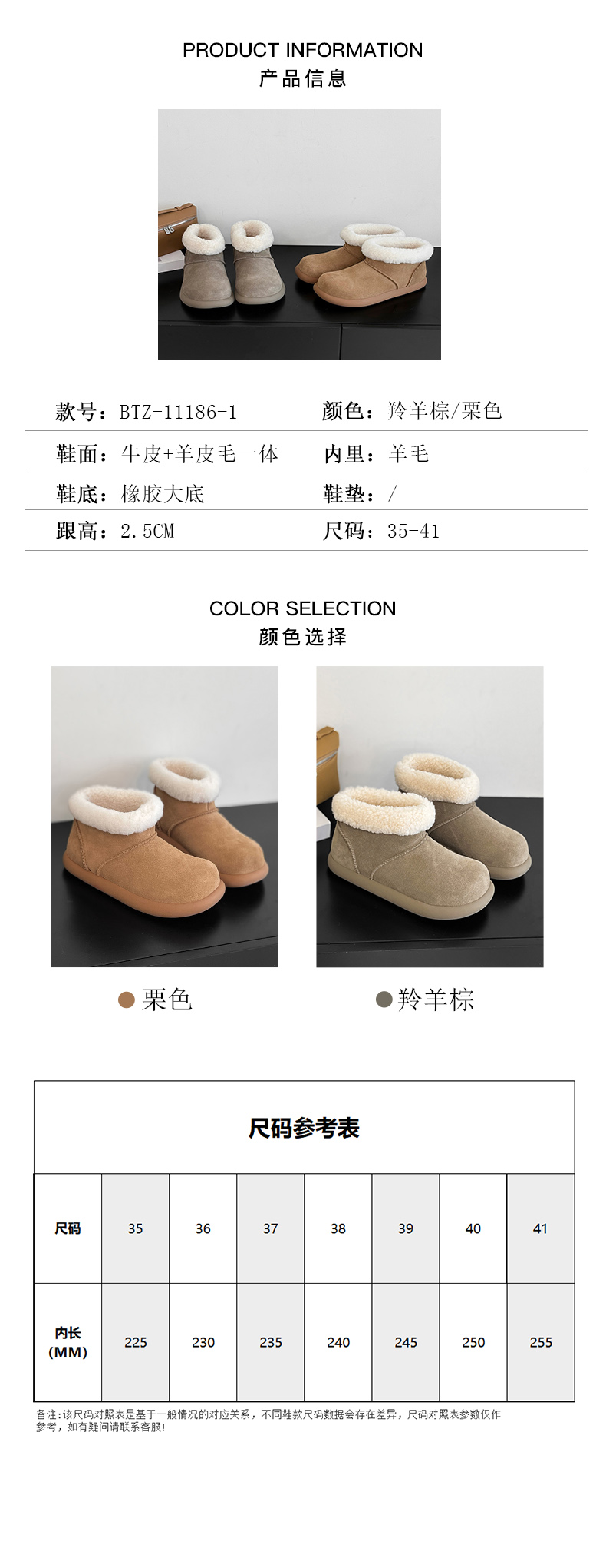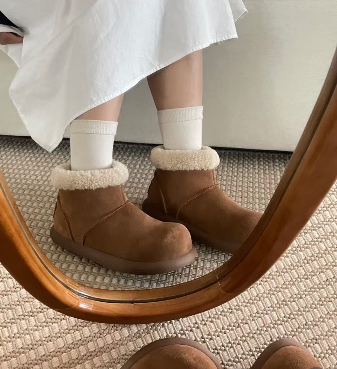 35-40码,分半包款,短靴款,厚底款。下面看实拍图哈!明星都爱的系列,牛皮鞋面+内里一体成型的羊毛工艺,防滑橡胶大底,穿着更安心。品质好好!!超级暖脚,下雪天不怕,性价比绝绝子!
