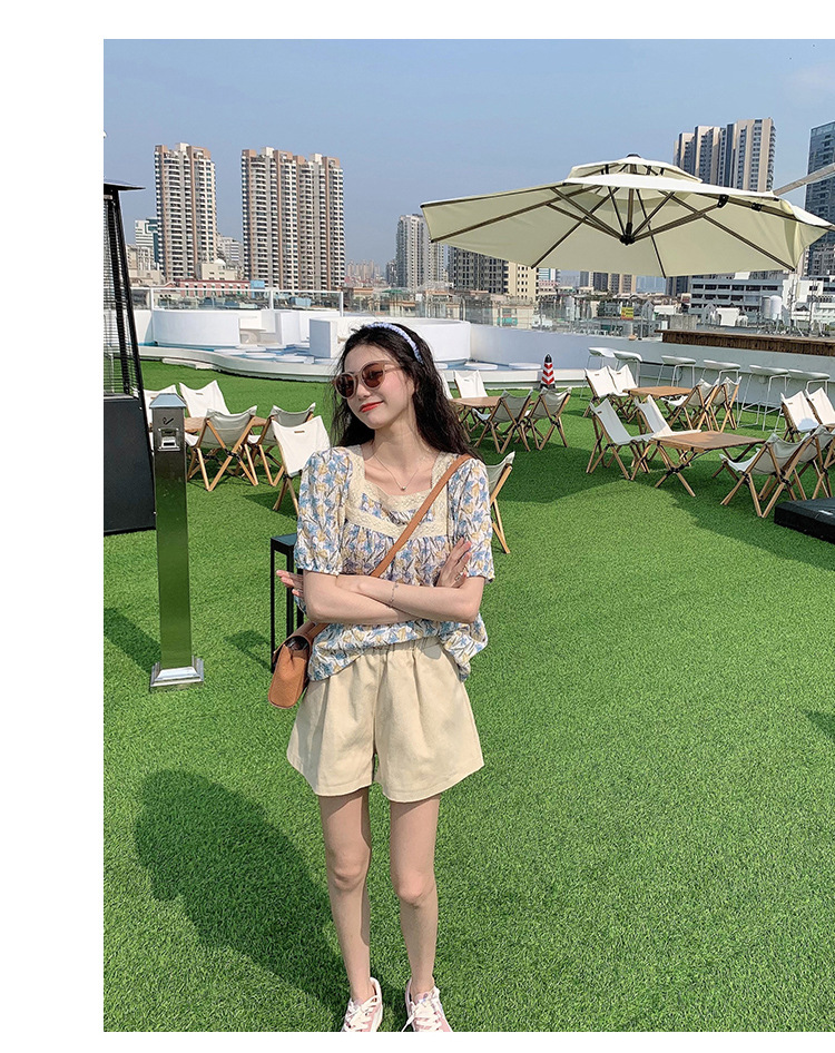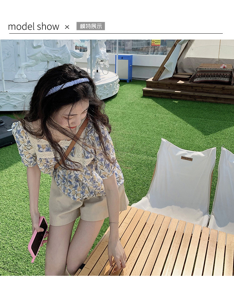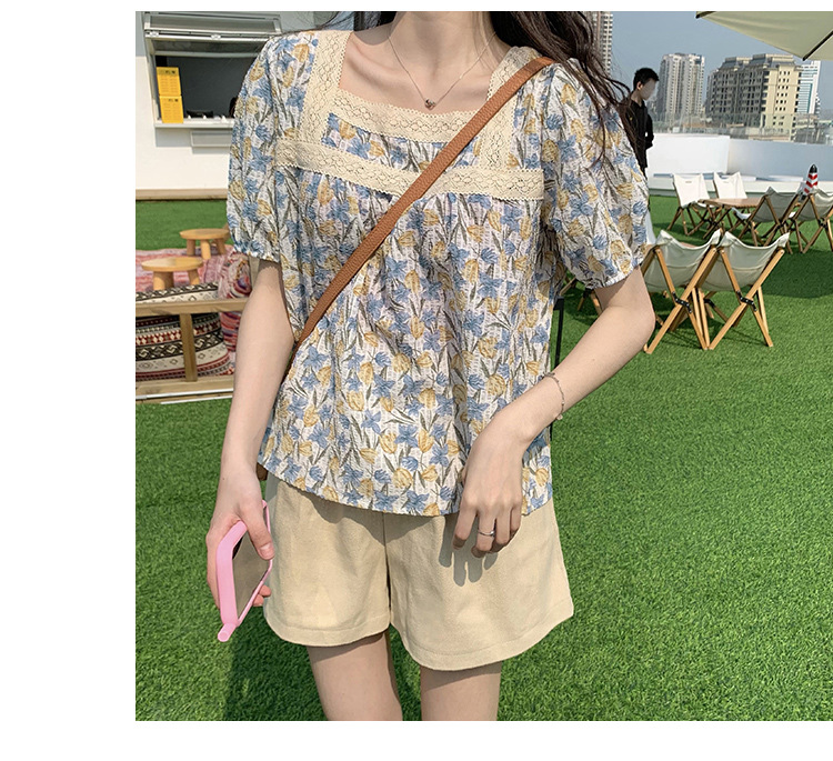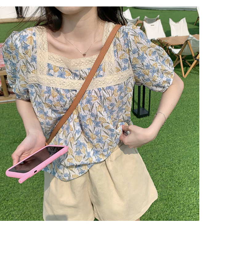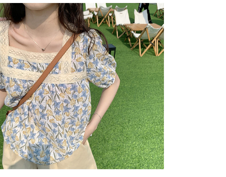 2023年新款法式方领别致碎花上衣泡泡袖短袖衬衫女设计感小众夏季