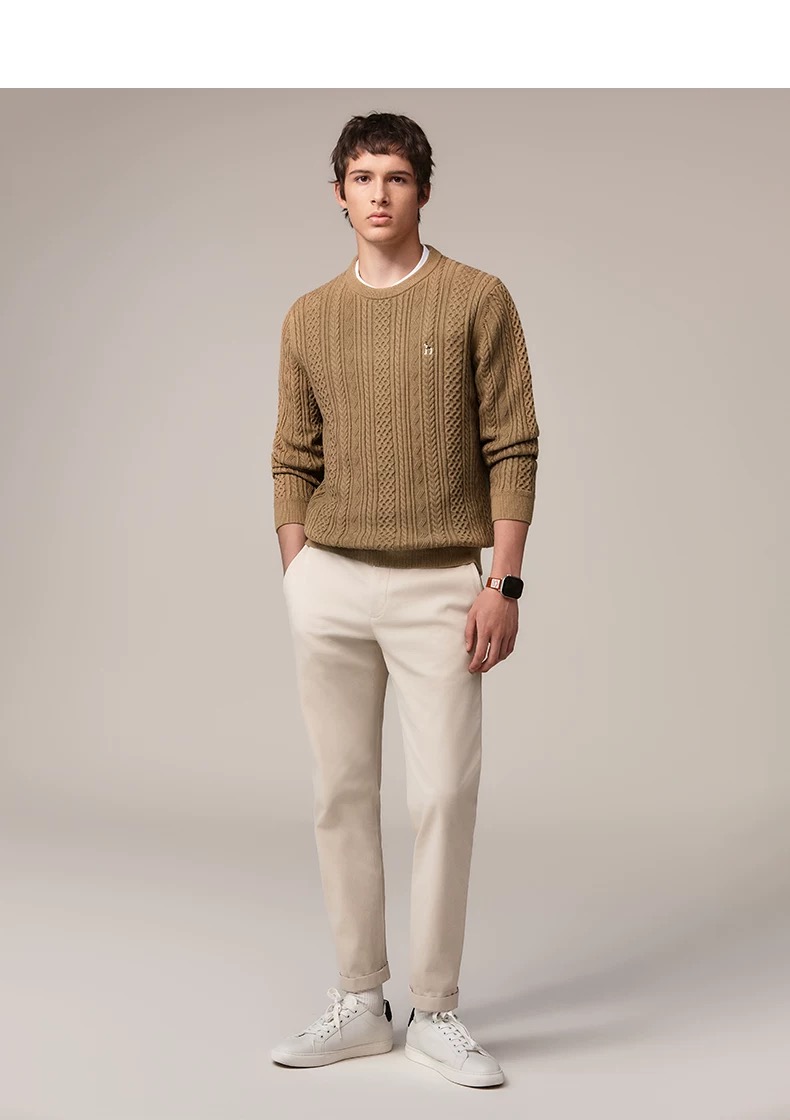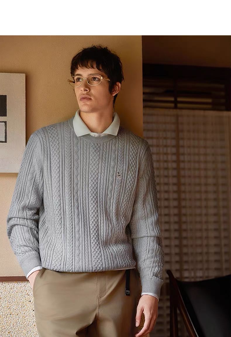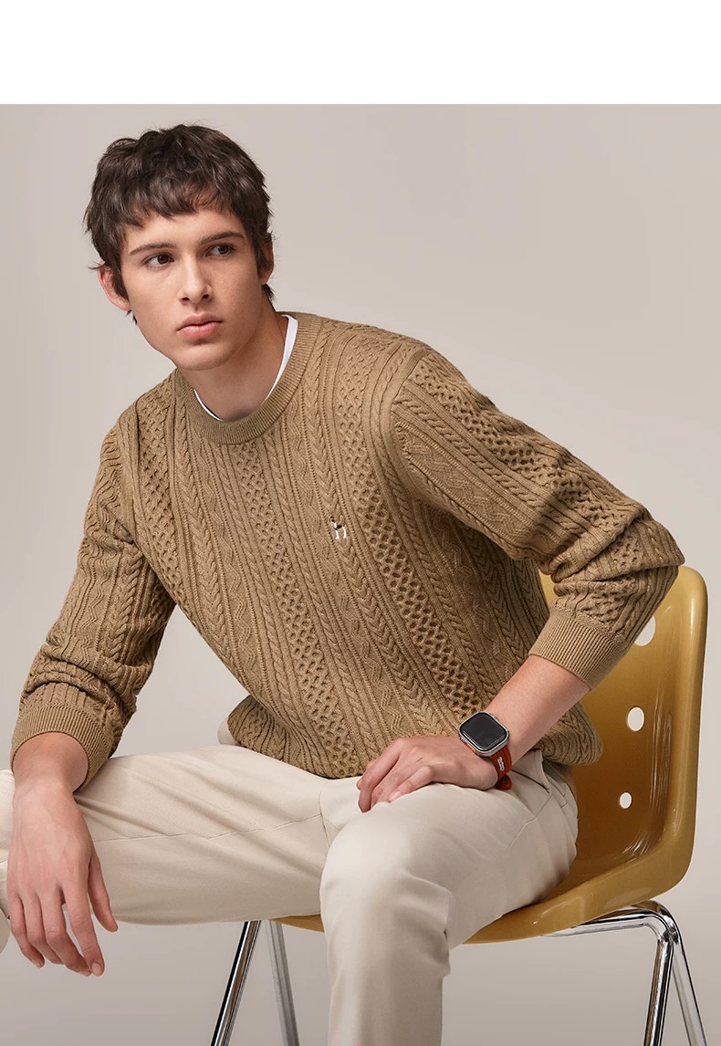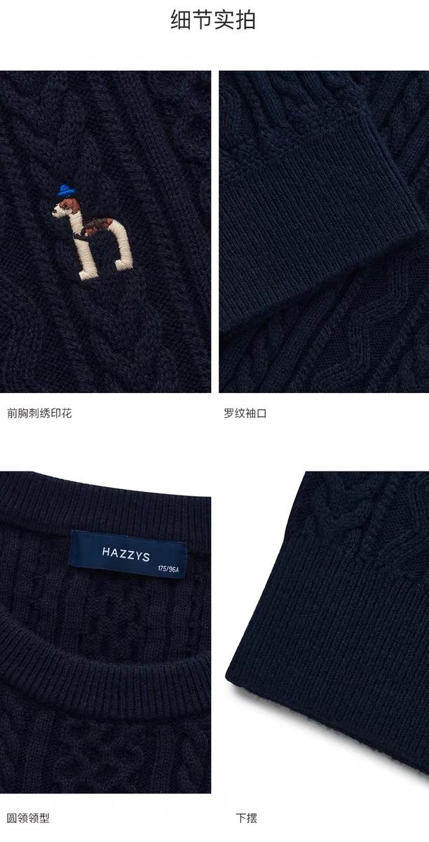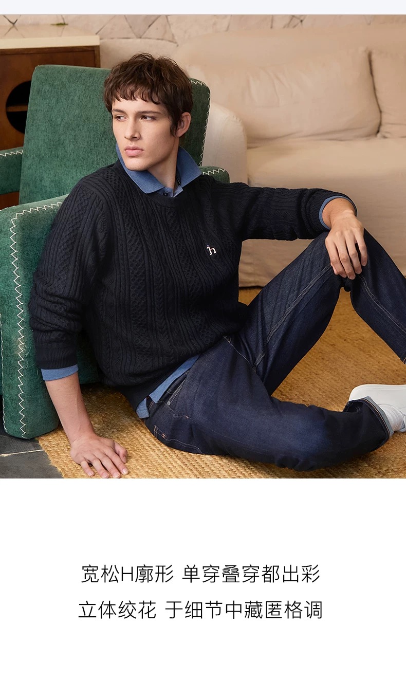 Hazzys哈吉斯男士圆领肌理感绞花毛衣保暖针织衫