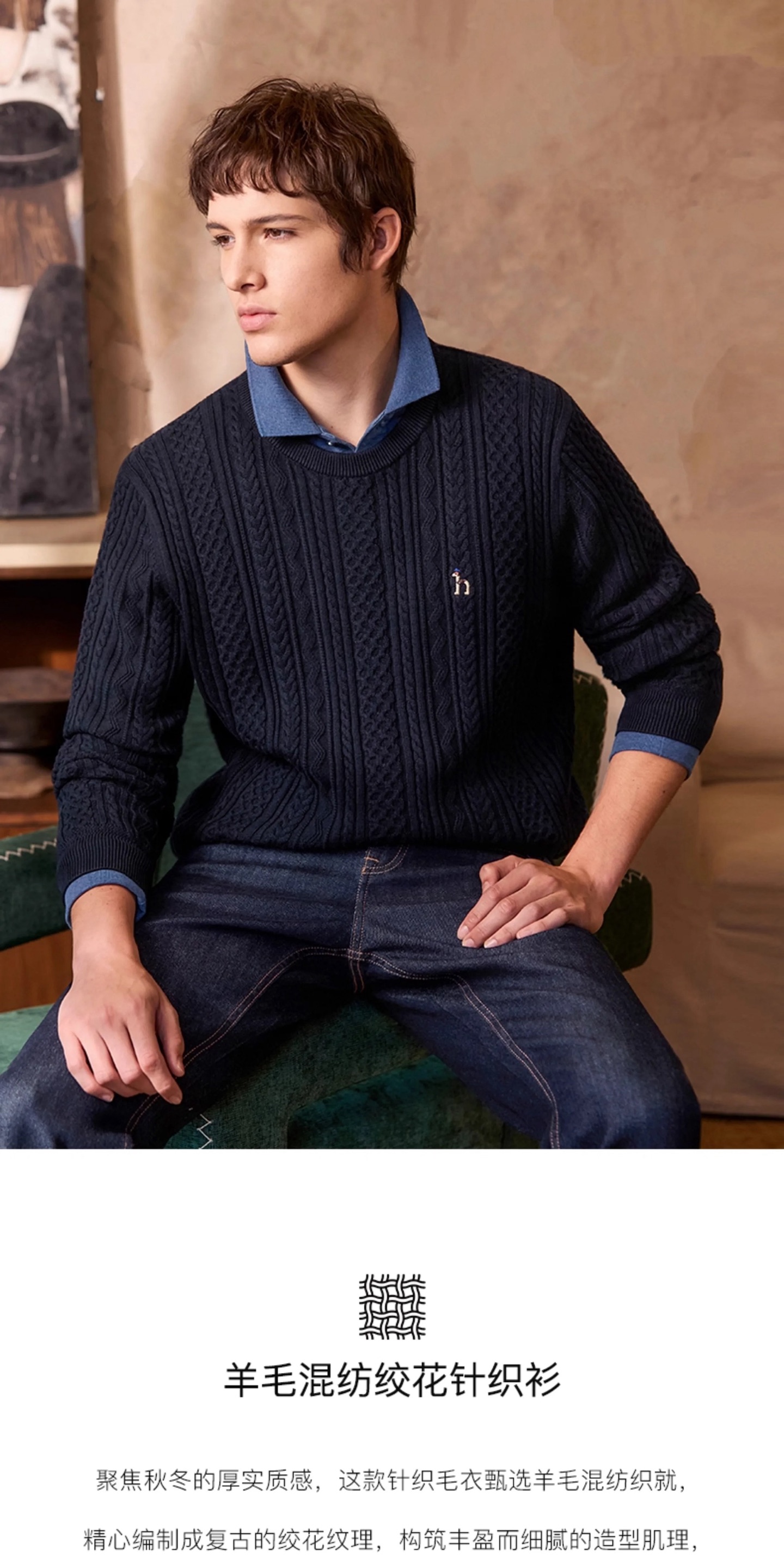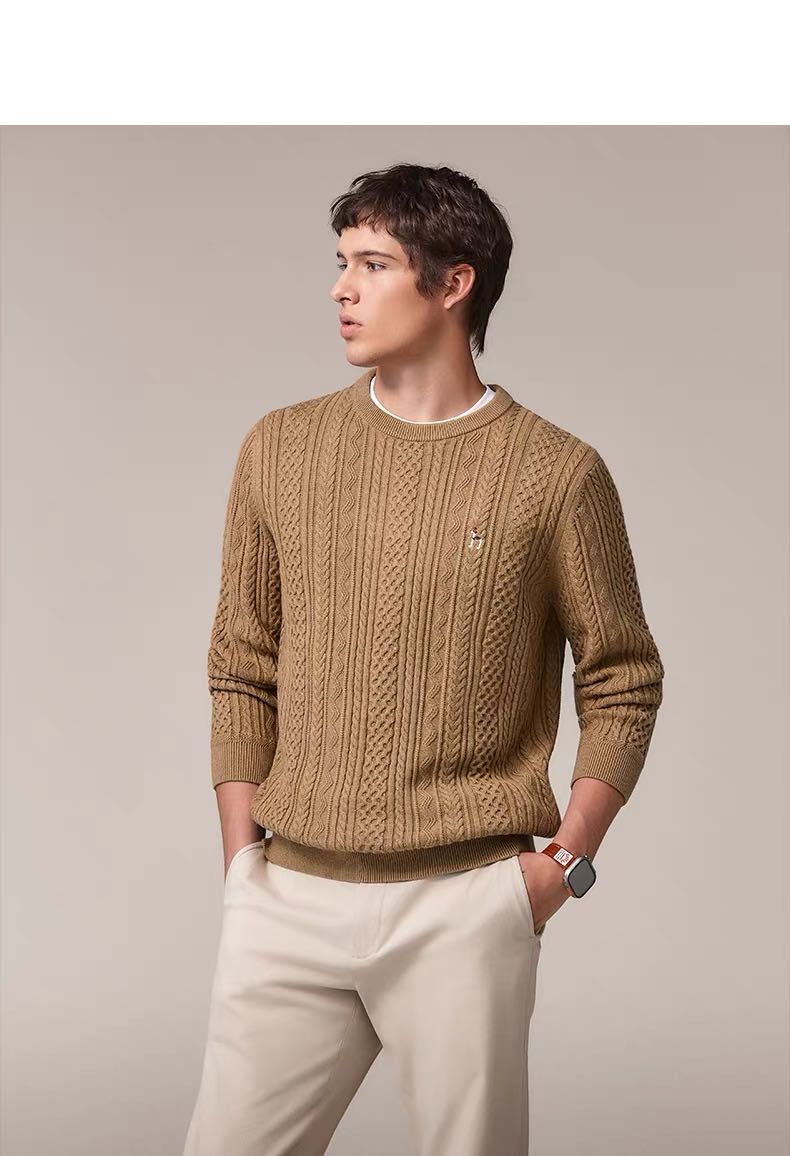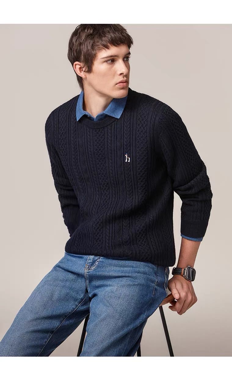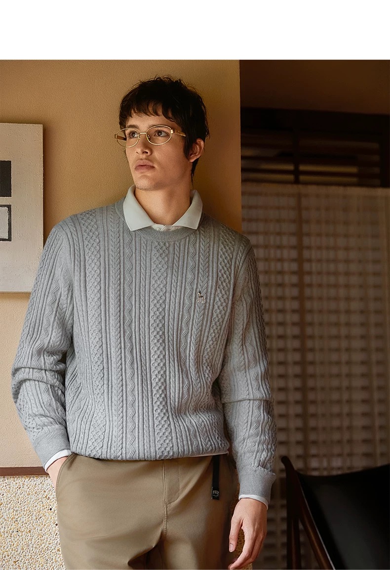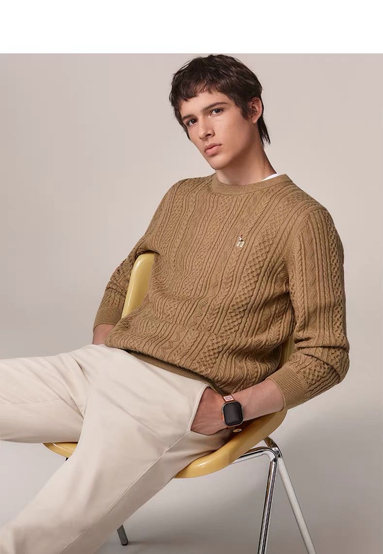 Hazzys哈吉斯男士圆领肌理感绞花毛衣保暖针织衫