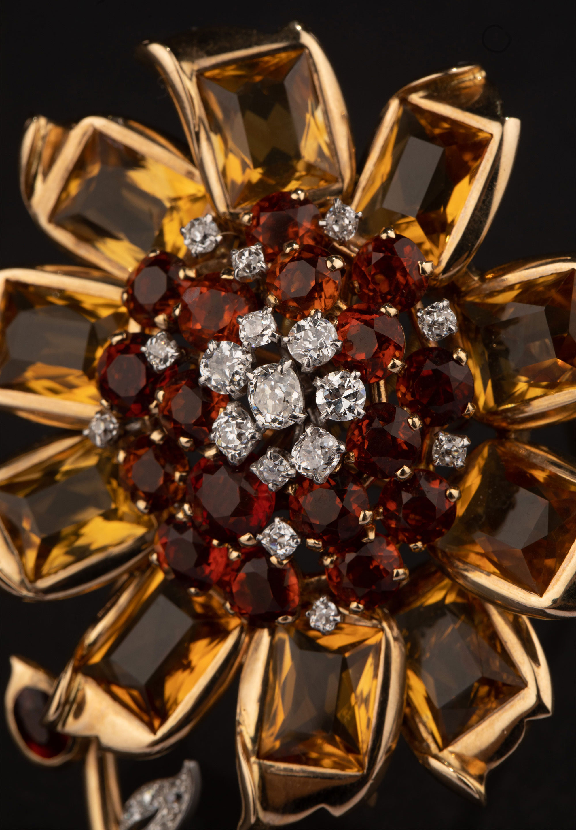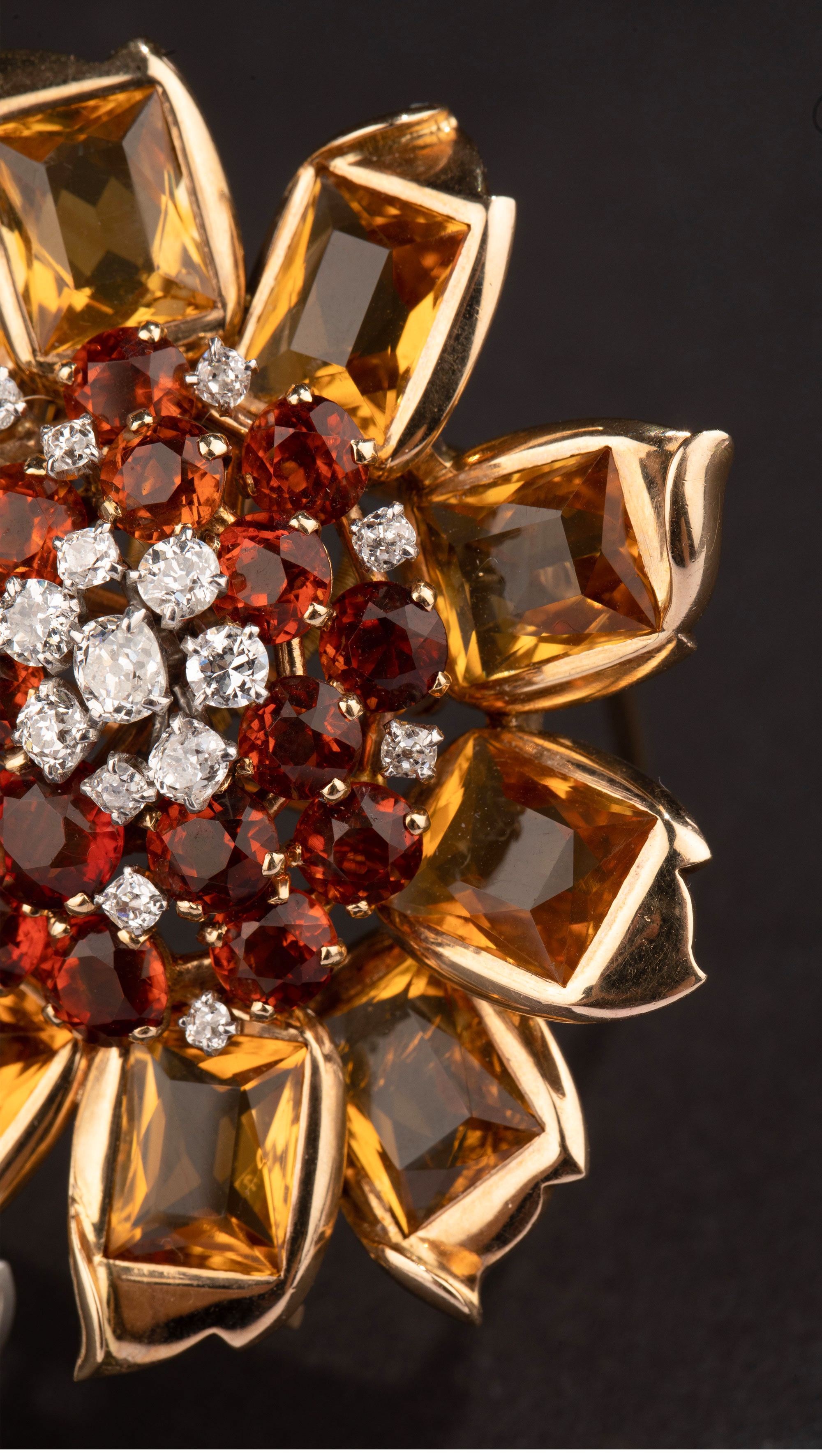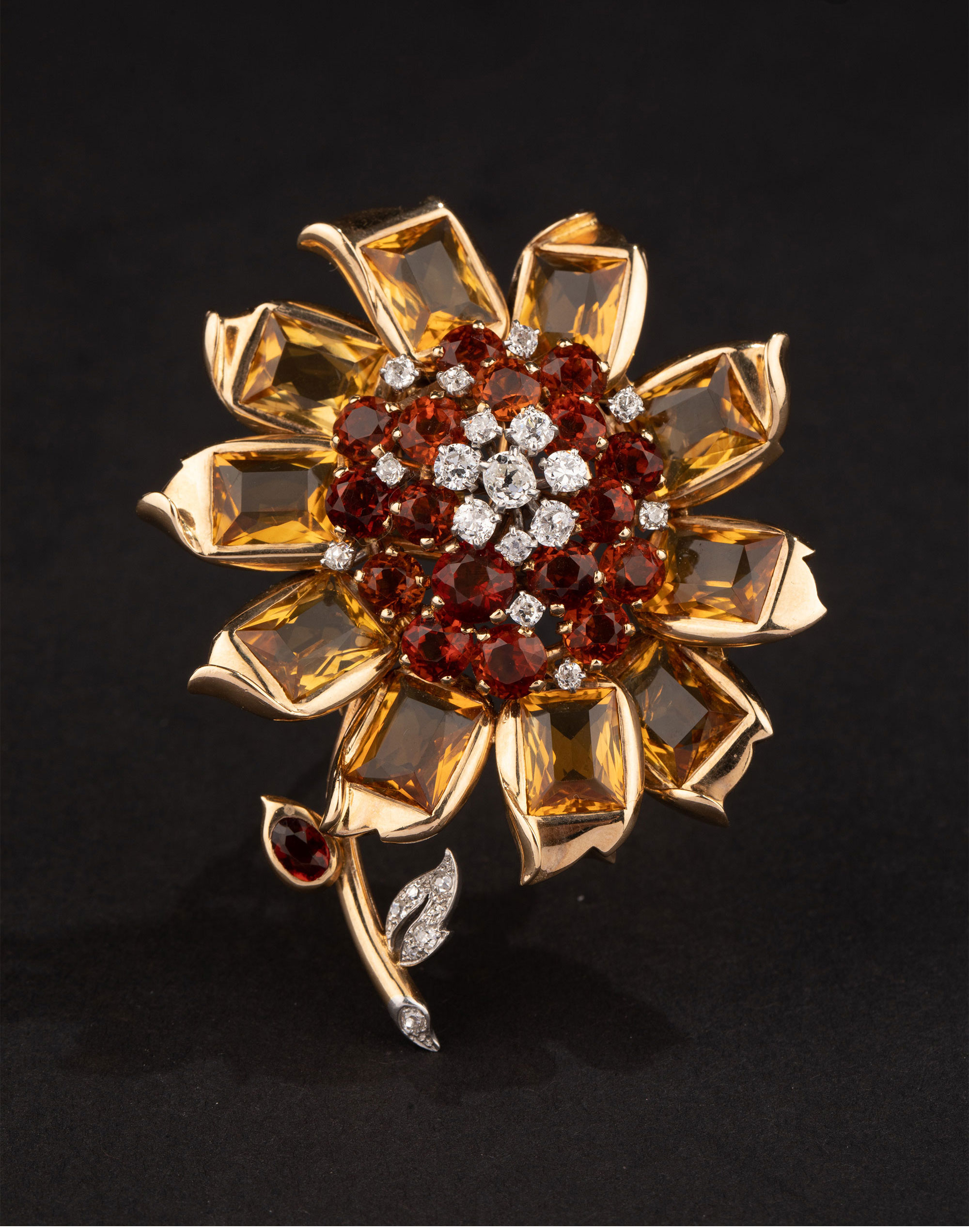 1940年代出品18k黄金镶嵌黄水晶及钻石「向日葵」主题胸针
