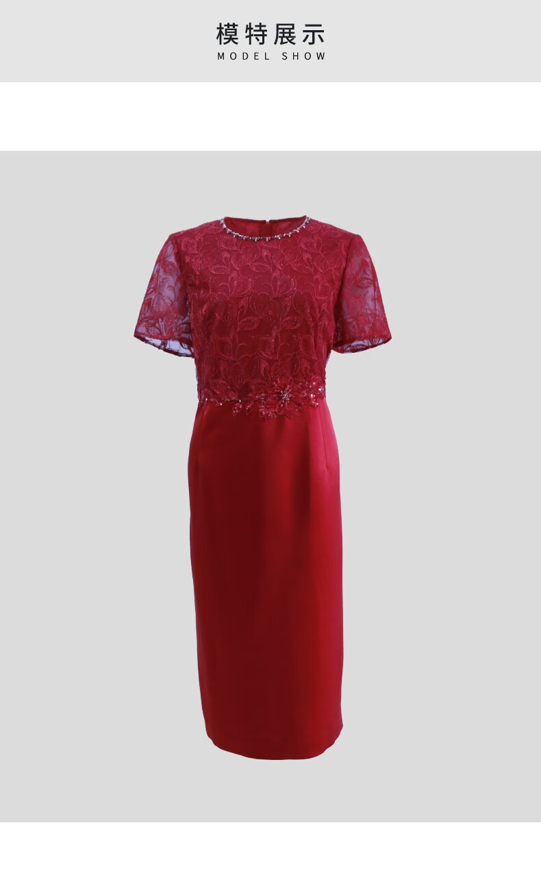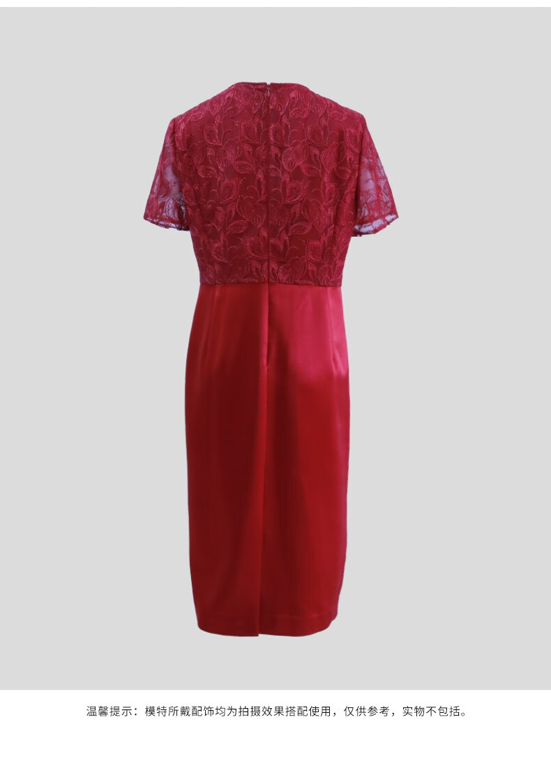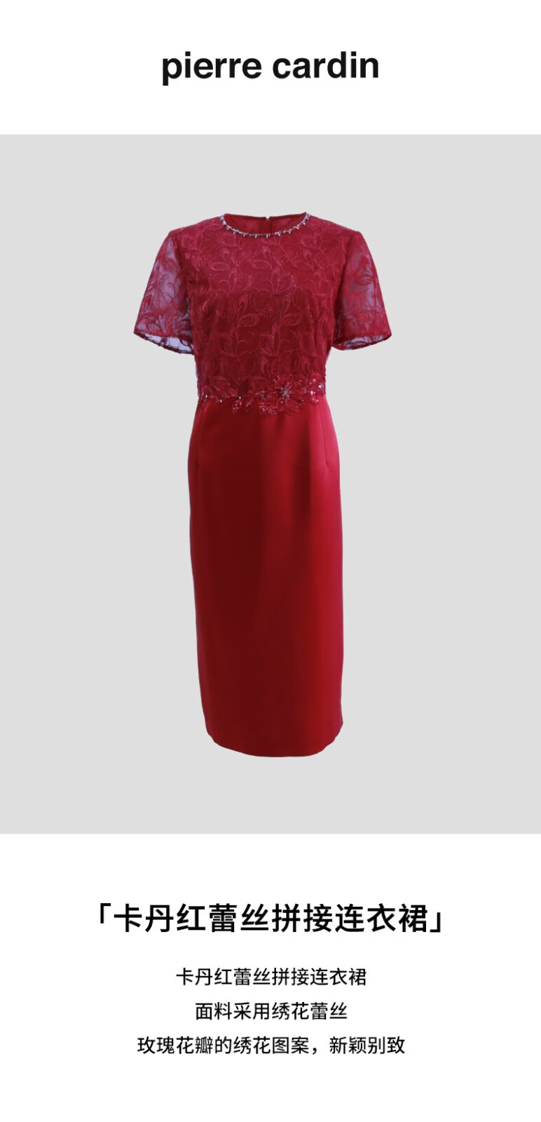 皮尔卡丹女装连衣裙夏季新款短袖蕾丝拼接红色包臀裙P3223D3073R0